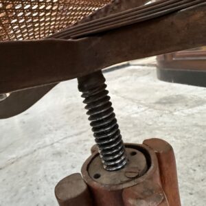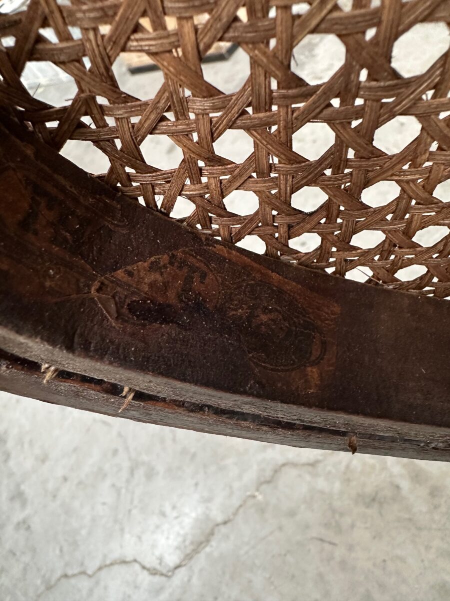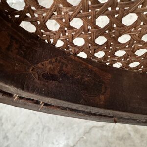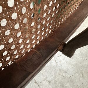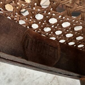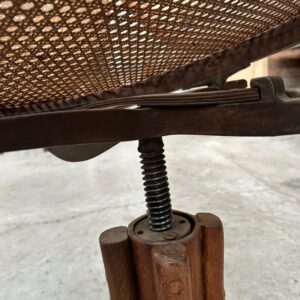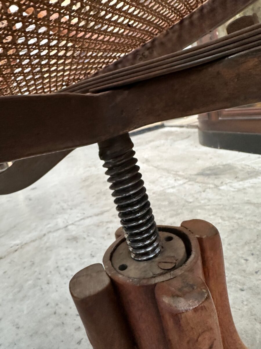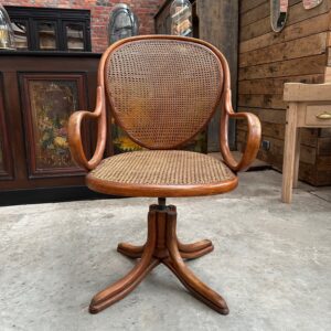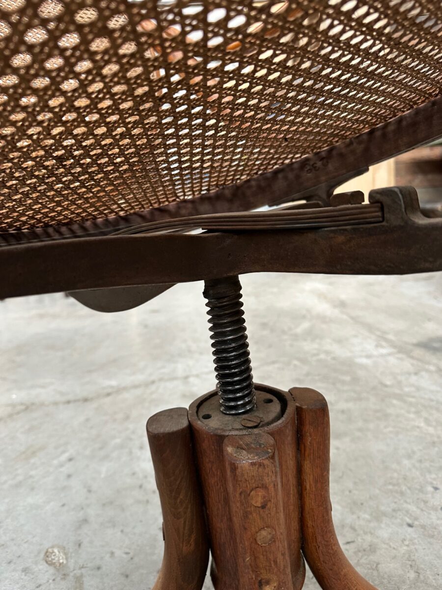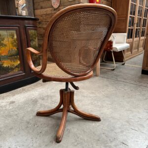 Il se compose d’une assise et d’un dossier cannés. Sa structure en bois courbé est montée sur un piètement quadripode doté d’une vis de réglage en hauteur. Il peut également pivoter à droite et à gauche et basculer d’avant en arrière.