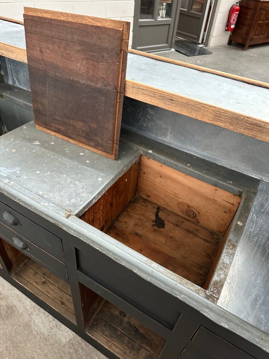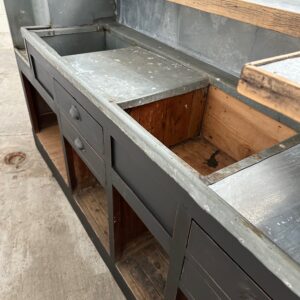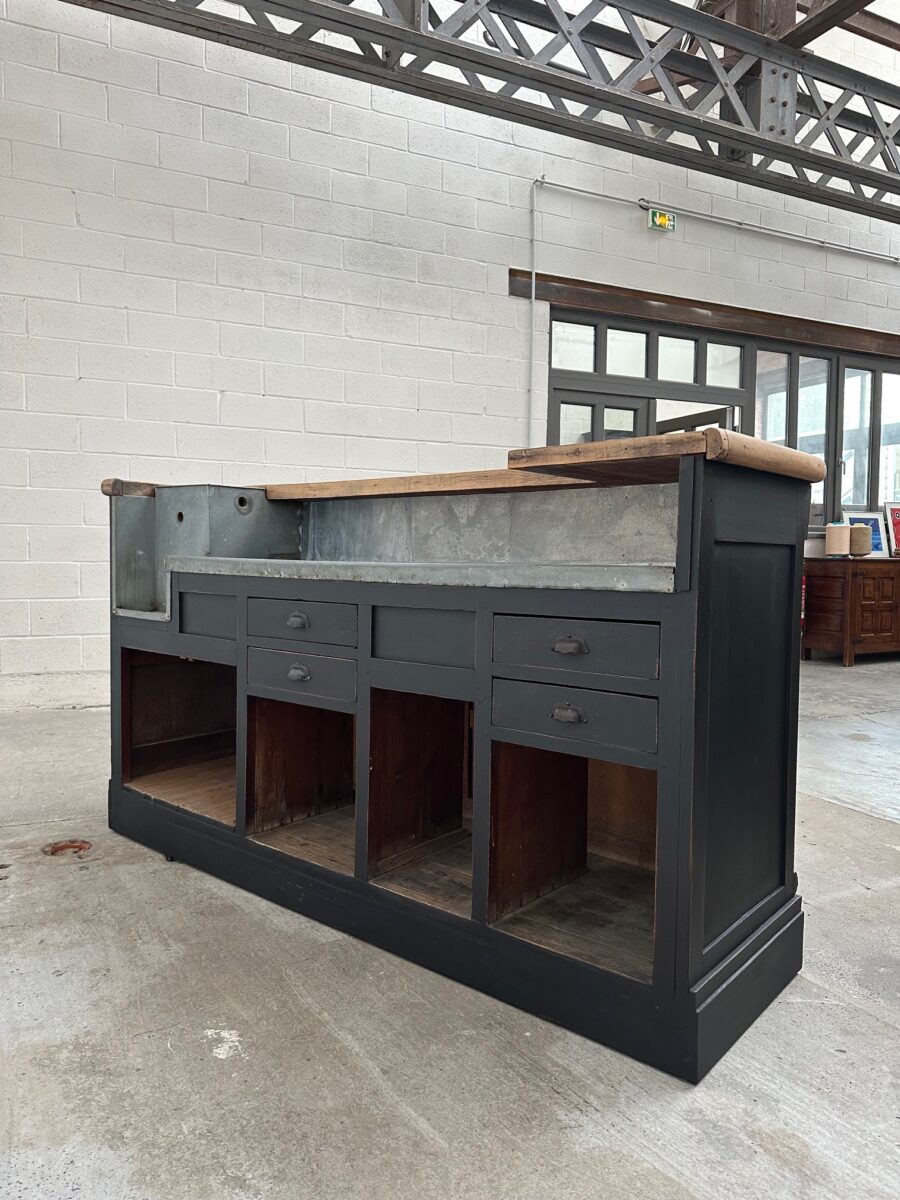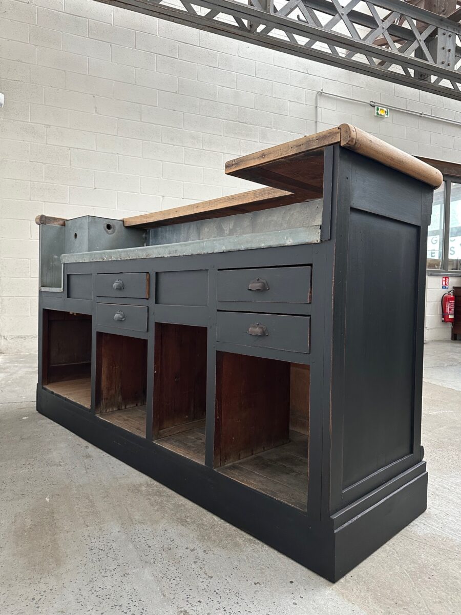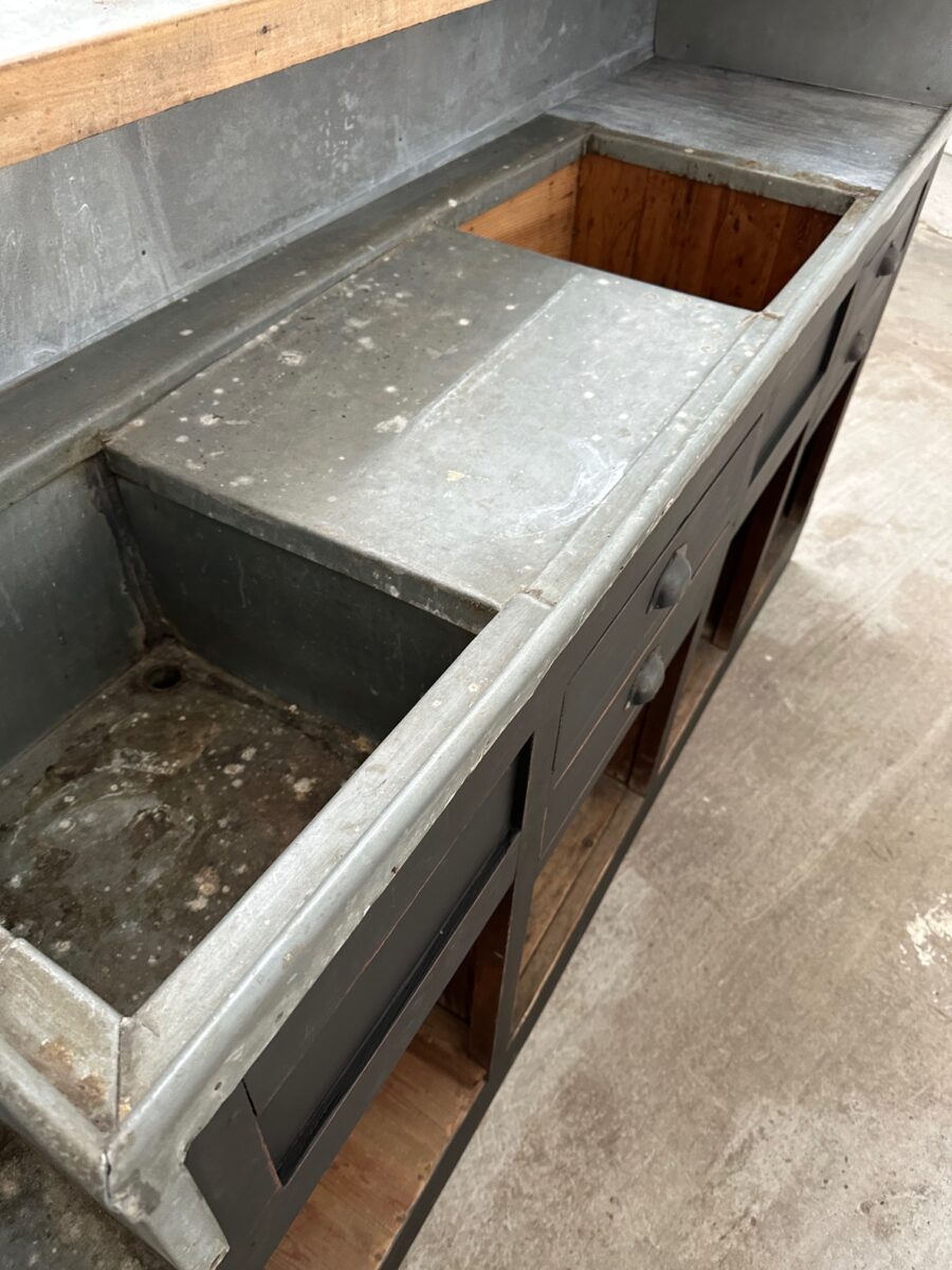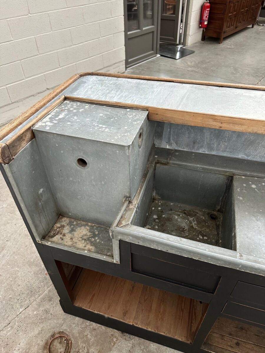 A l’arrière, il a conservé tout son caractère avec un plateau et une cuve en zinc, une autre cuve en bois recouverte d’un couvercle amovible, 4 tiroirs fonctionnels dotés de poignées coquilles et 3 grandes niches ouvertes.