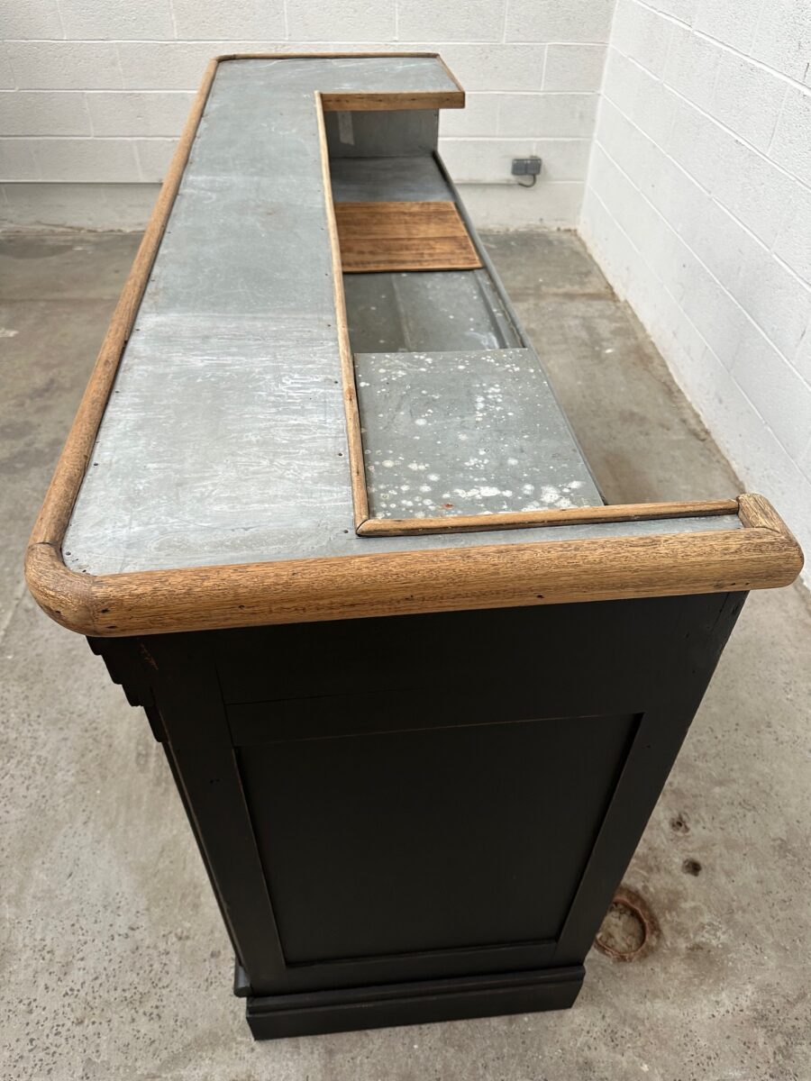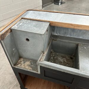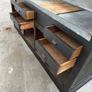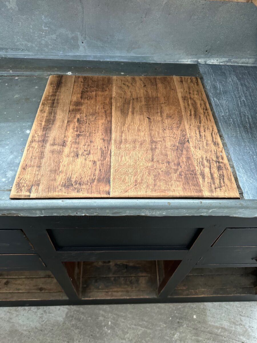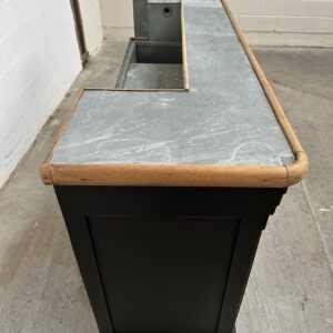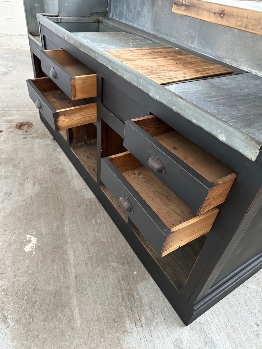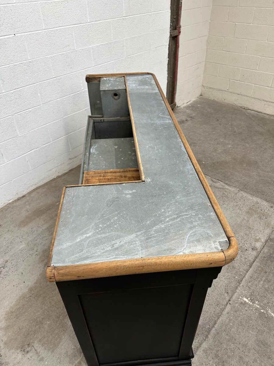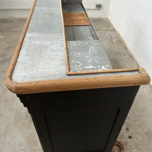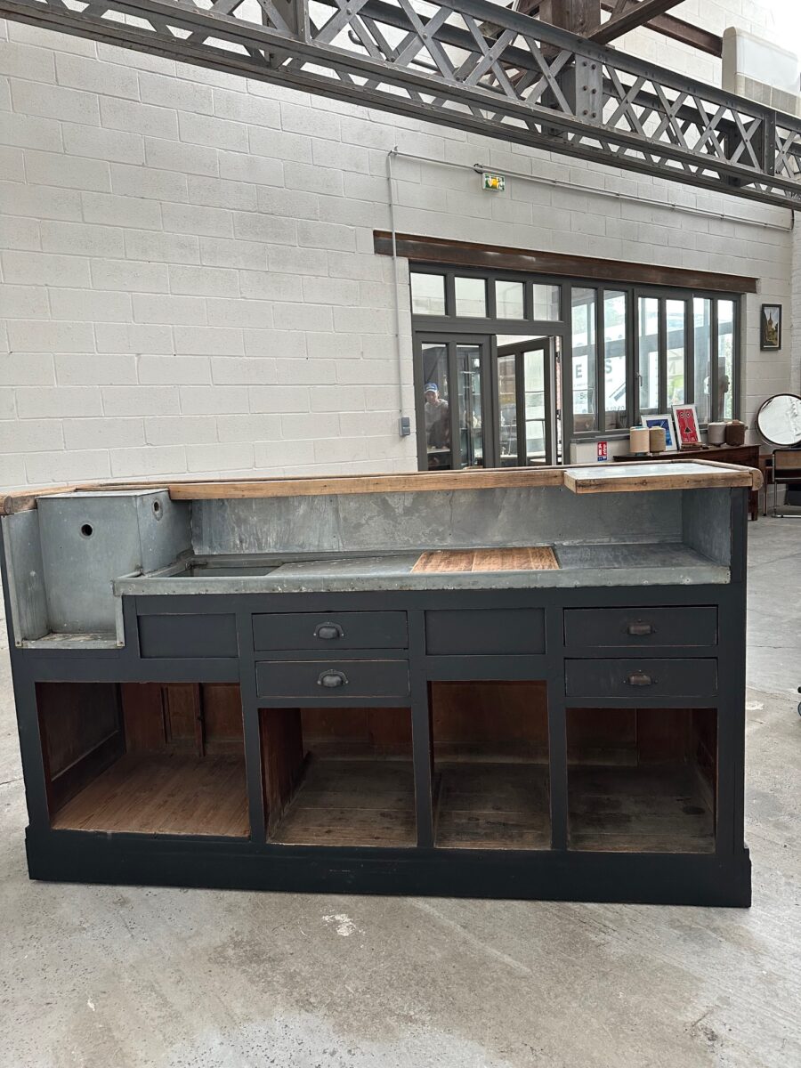 A l’arrière, il a conservé tout son caractère avec un plateau et une cuve en zinc, une autre cuve en bois recouverte d’un couvercle amovible, 4 tiroirs fonctionnels dotés de poignées coquilles et 3 grandes niches ouvertes.