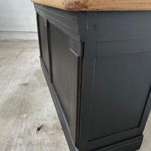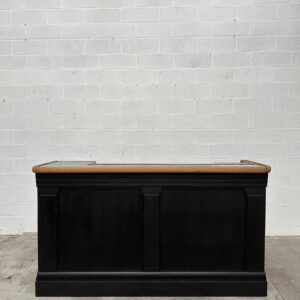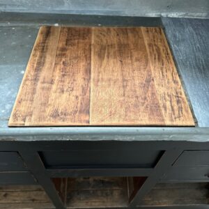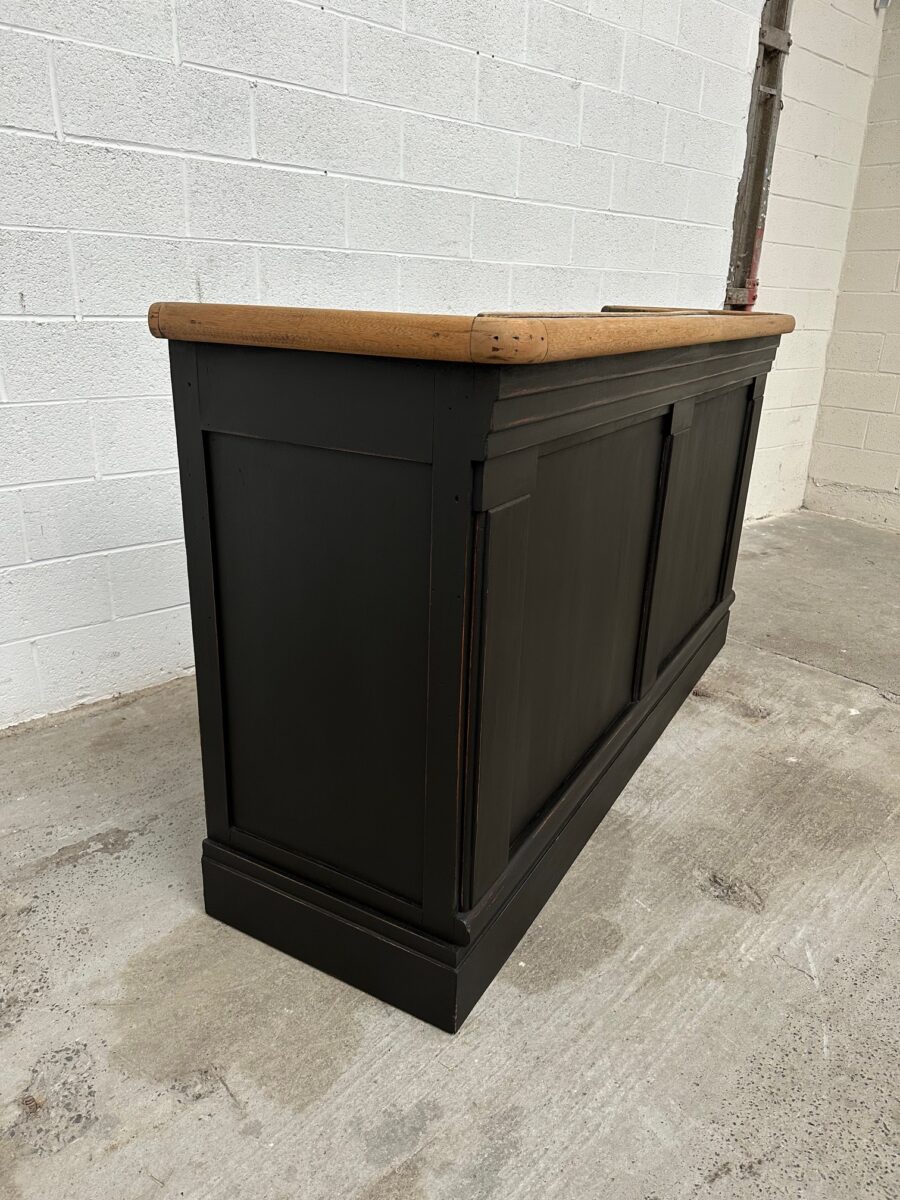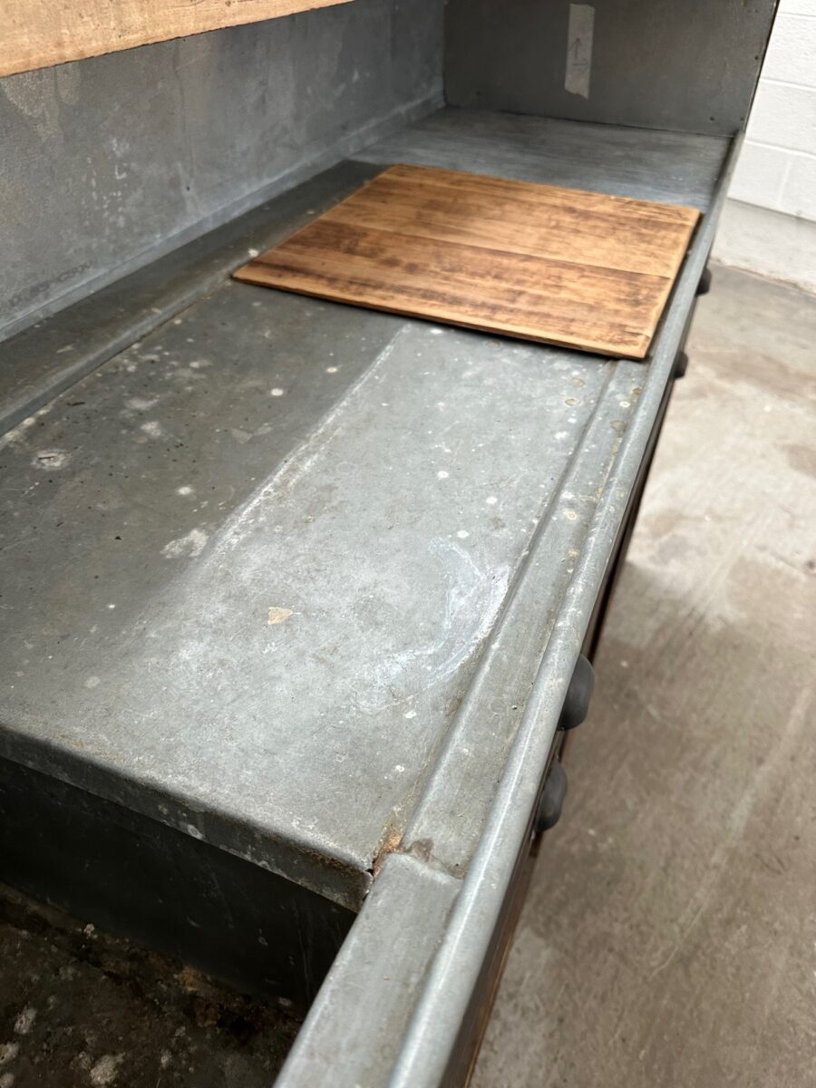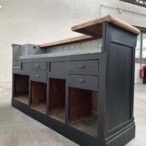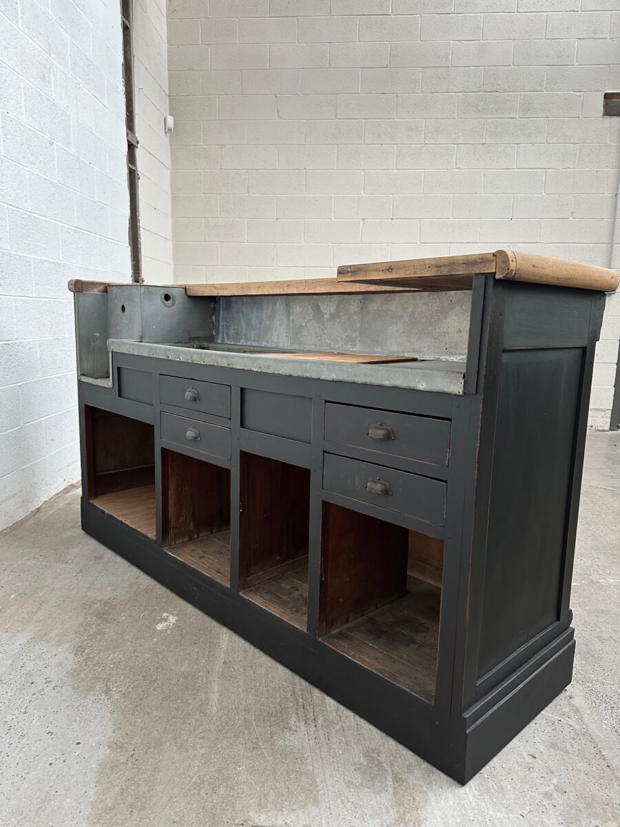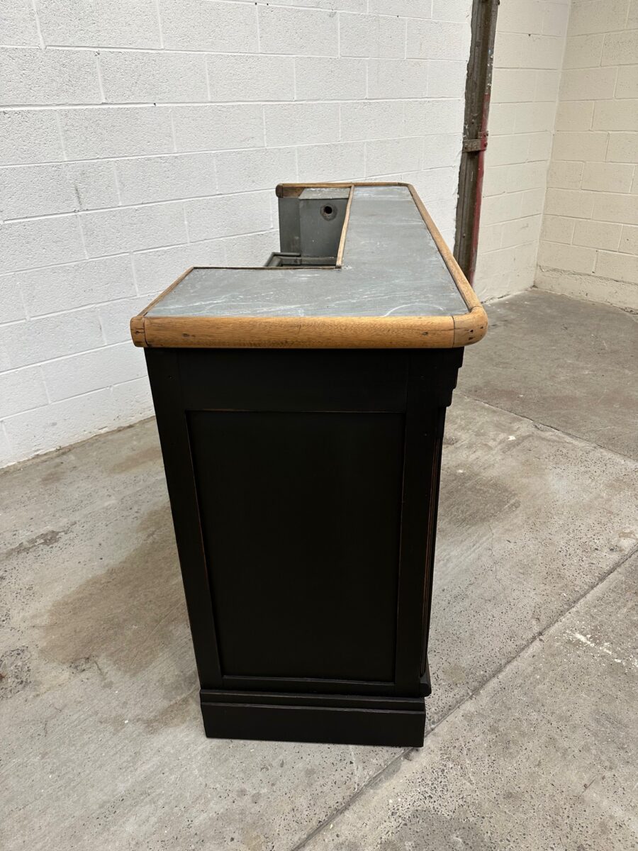 A l’arrière, il a conservé tout son caractère avec un plateau et une cuve en zinc, une autre cuve en bois recouverte d’un couvercle amovible, 4 tiroirs fonctionnels dotés de poignées coquilles et 3 grandes niches ouvertes.