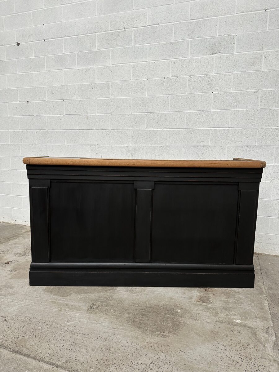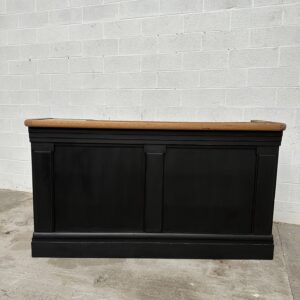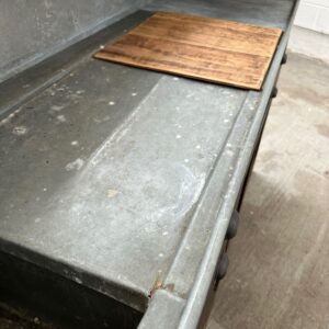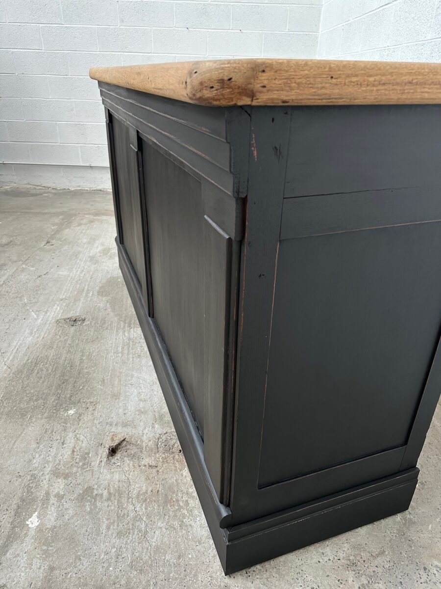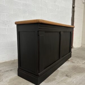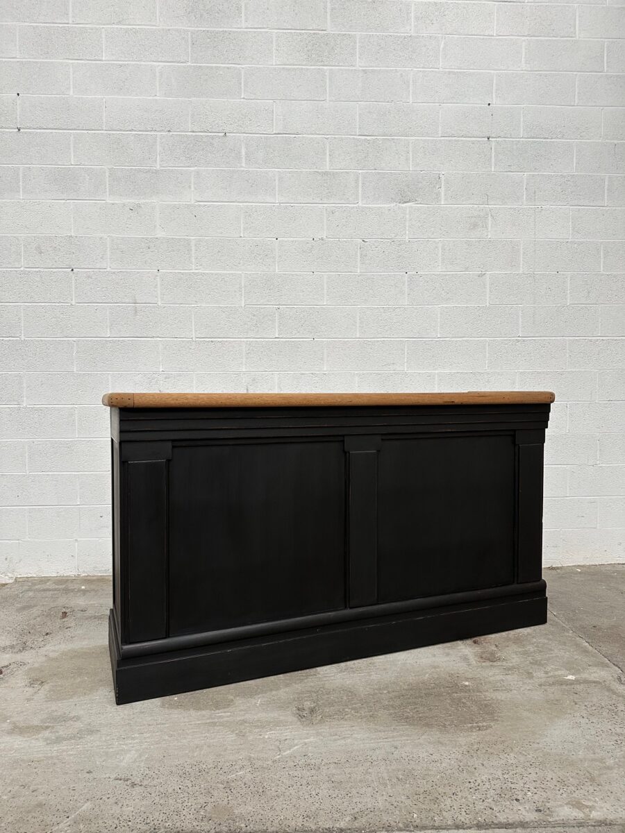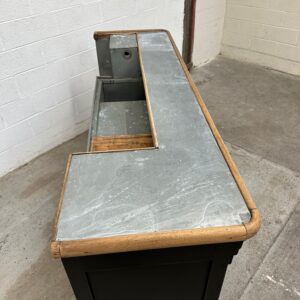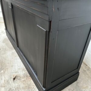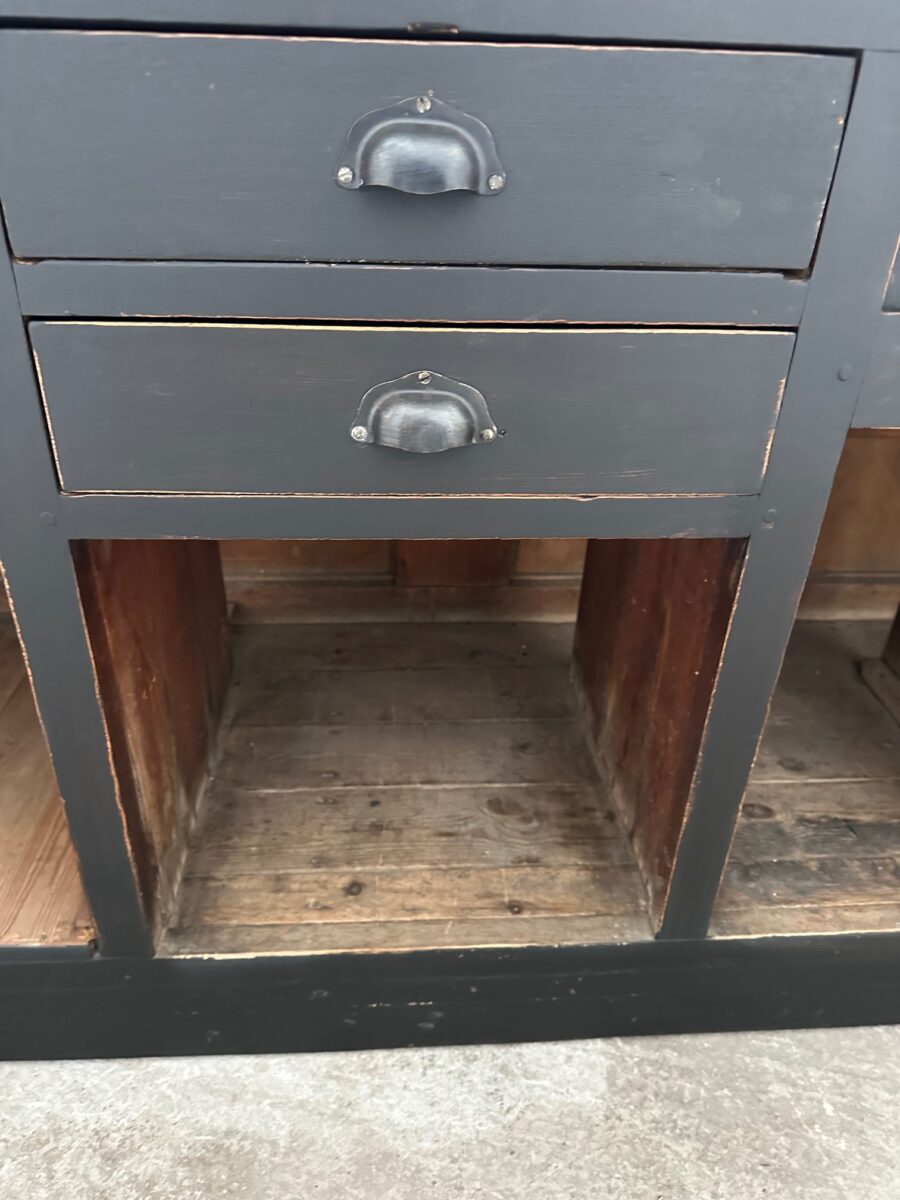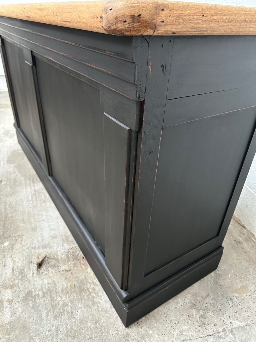 A l’arrière, il a conservé tout son caractère avec un plateau et une cuve en zinc, une autre cuve en bois recouverte d’un couvercle amovible, 4 tiroirs fonctionnels dotés de poignées coquilles et 3 grandes niches ouvertes.