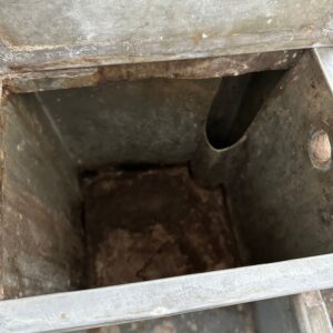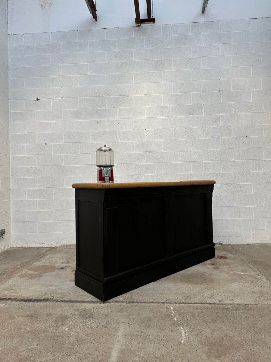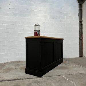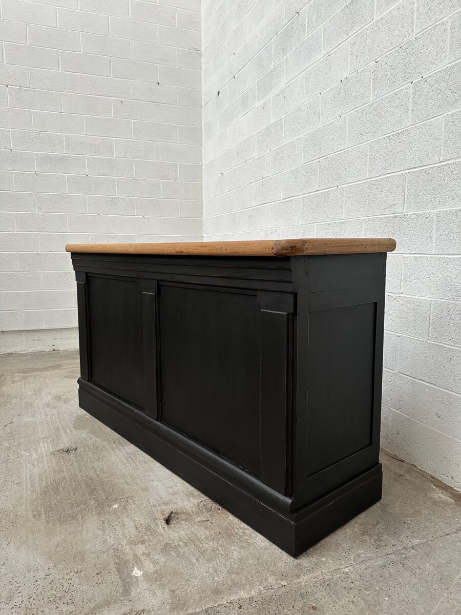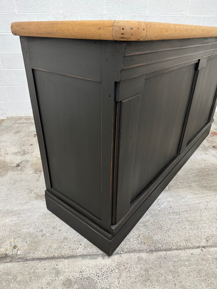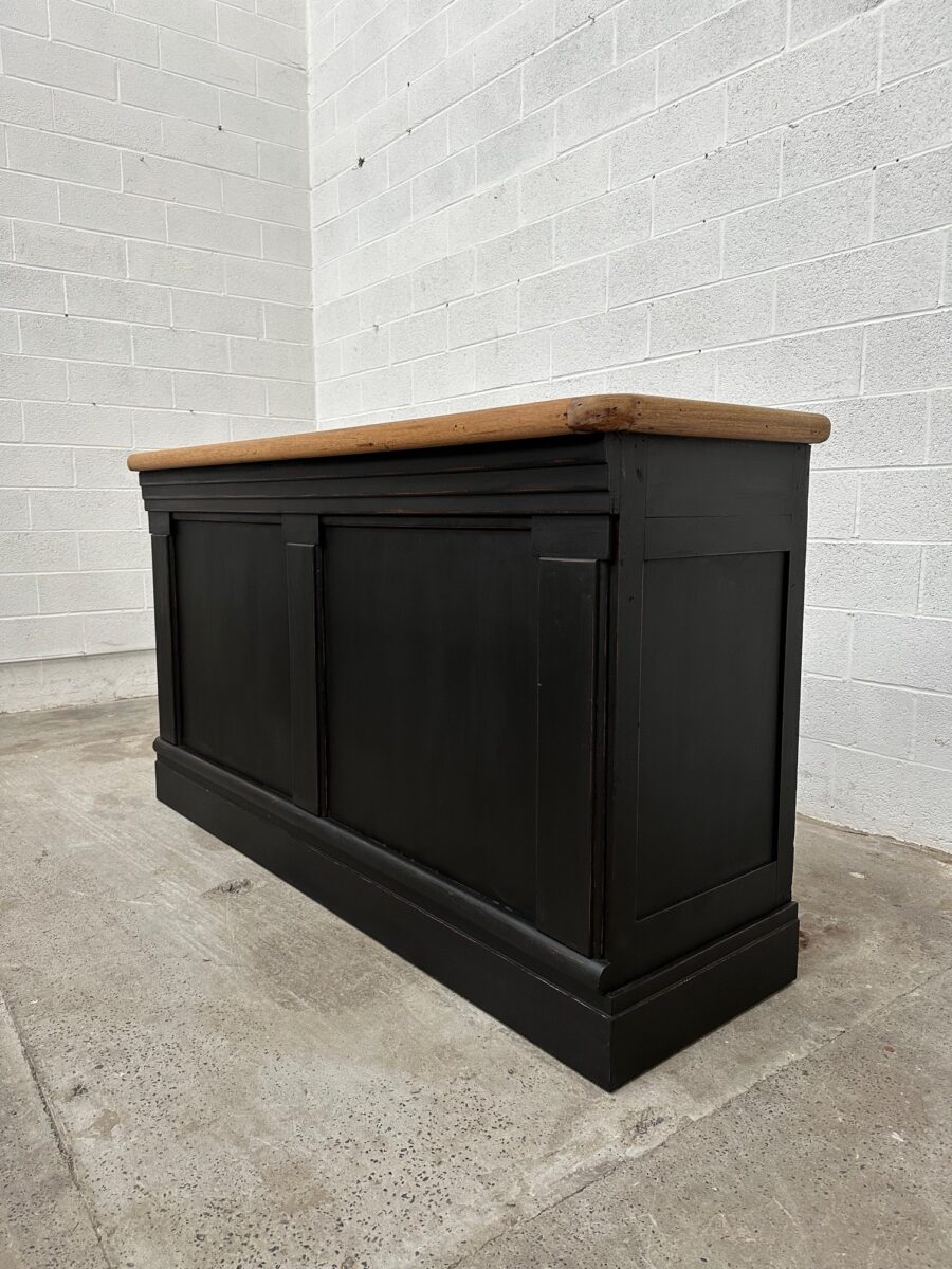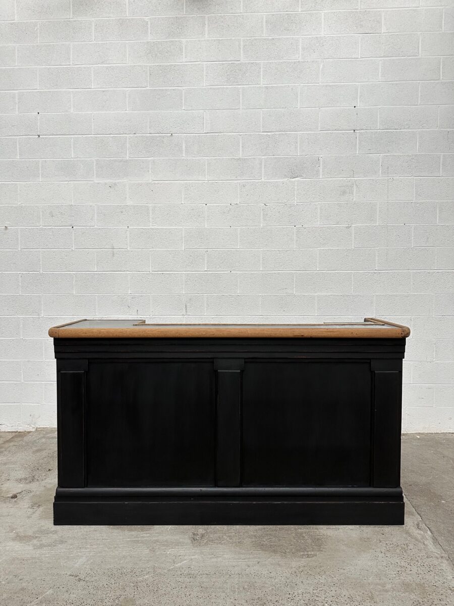 A l’arrière, il a conservé tout son caractère avec un plateau et une cuve en zinc, une autre cuve en bois recouverte d’un couvercle amovible, 4 tiroirs fonctionnels dotés de poignées coquilles et 3 grandes niches ouvertes.