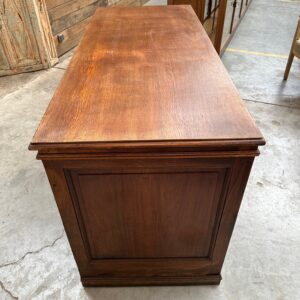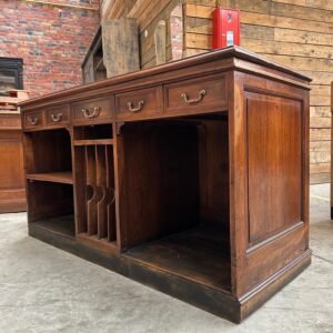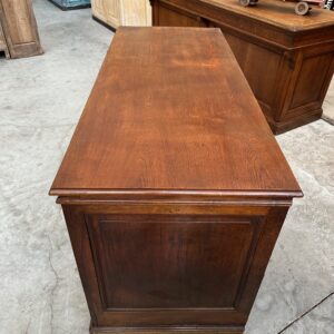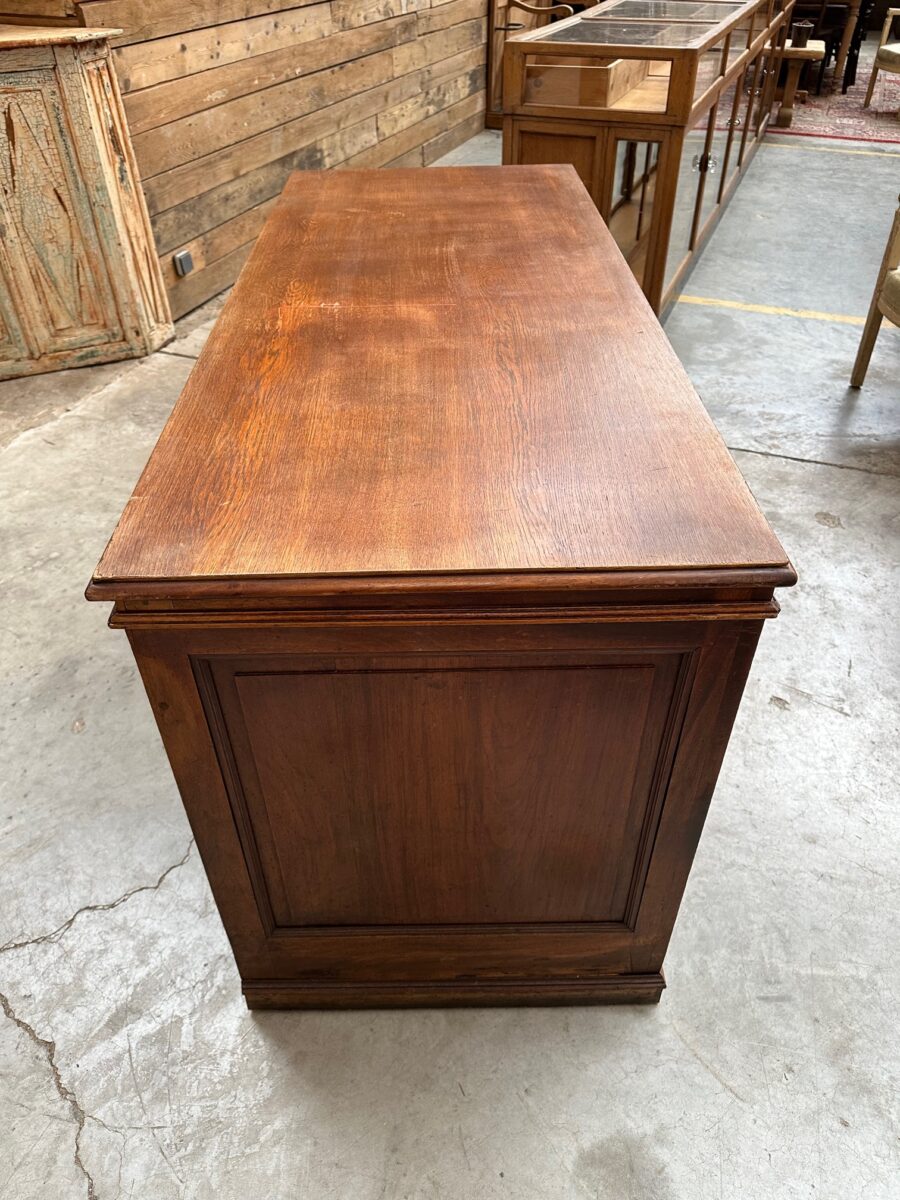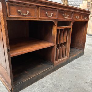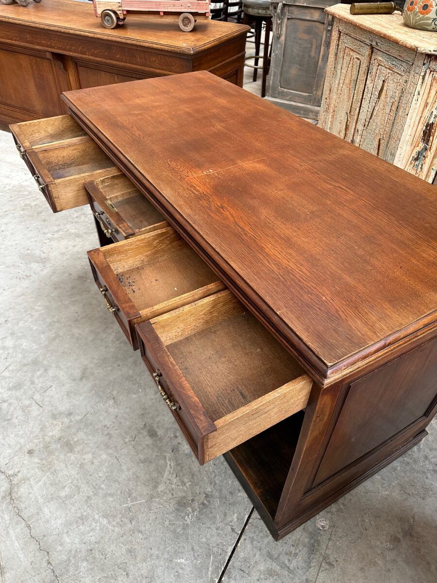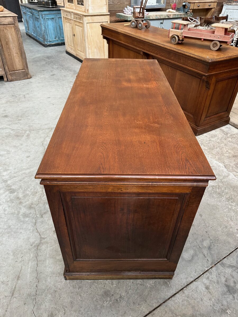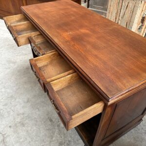 A l’arrière, il dispose de 4 tiroirs fonctionnels, de 3 espaces de rangement ouverts et d’un casier de classement surmonté d’une petite niche.