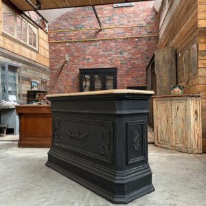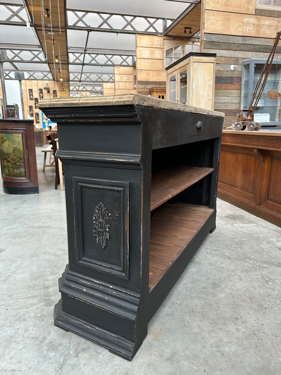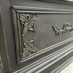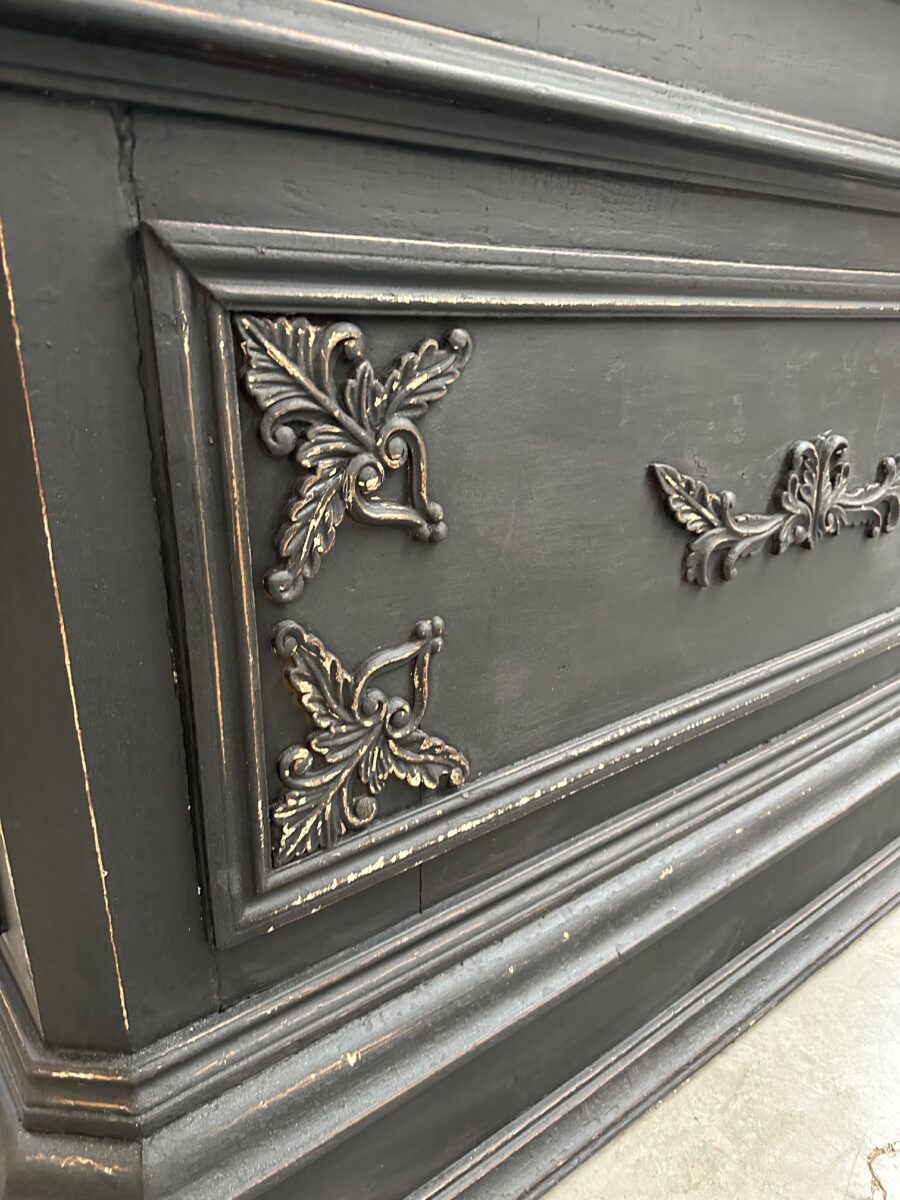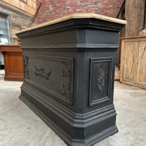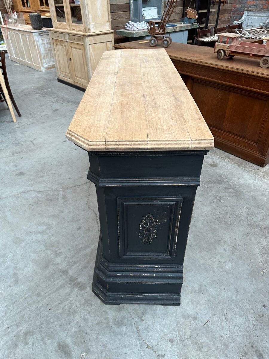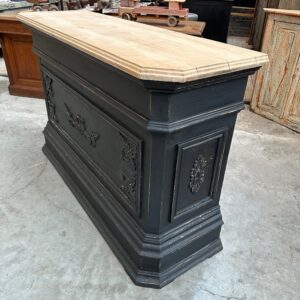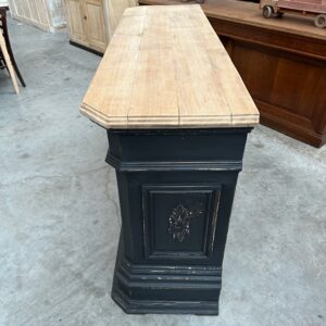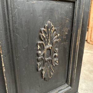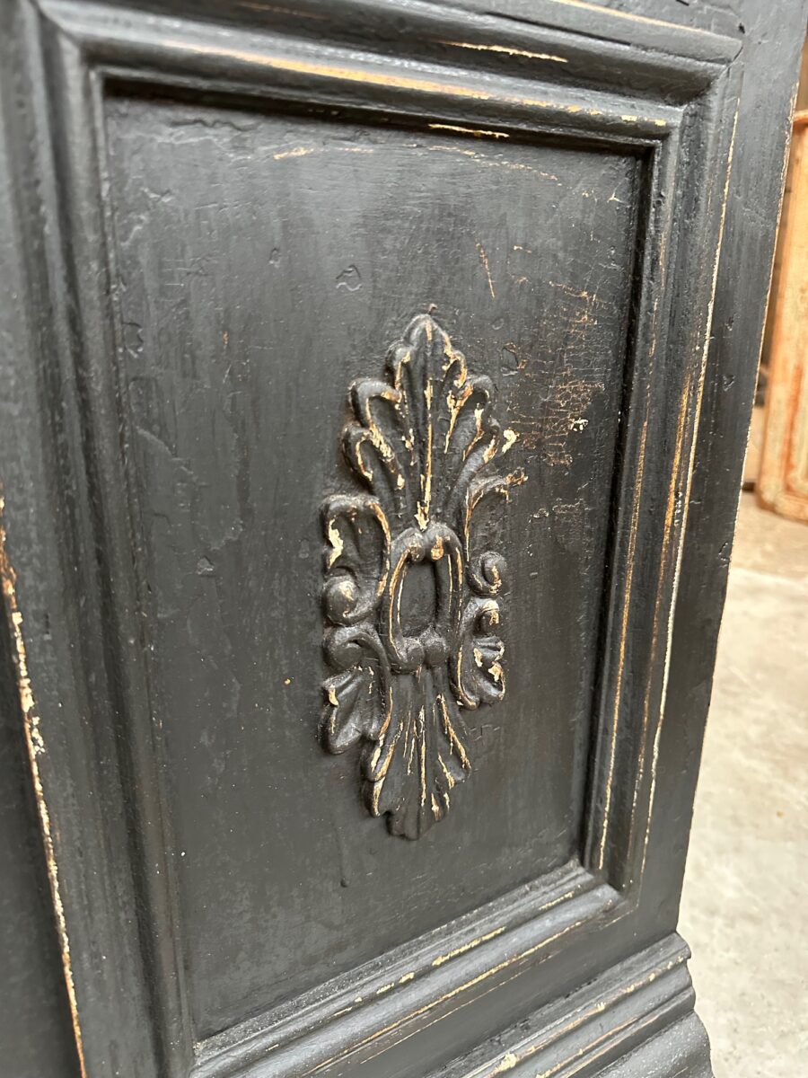 Il se compose d’un corps de meuble patiné noir et d’un plateau en chêne massif. Sa façade et ses cotés sont ornés de motifs palmettes en bois sculpté.