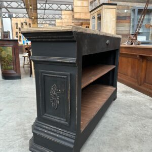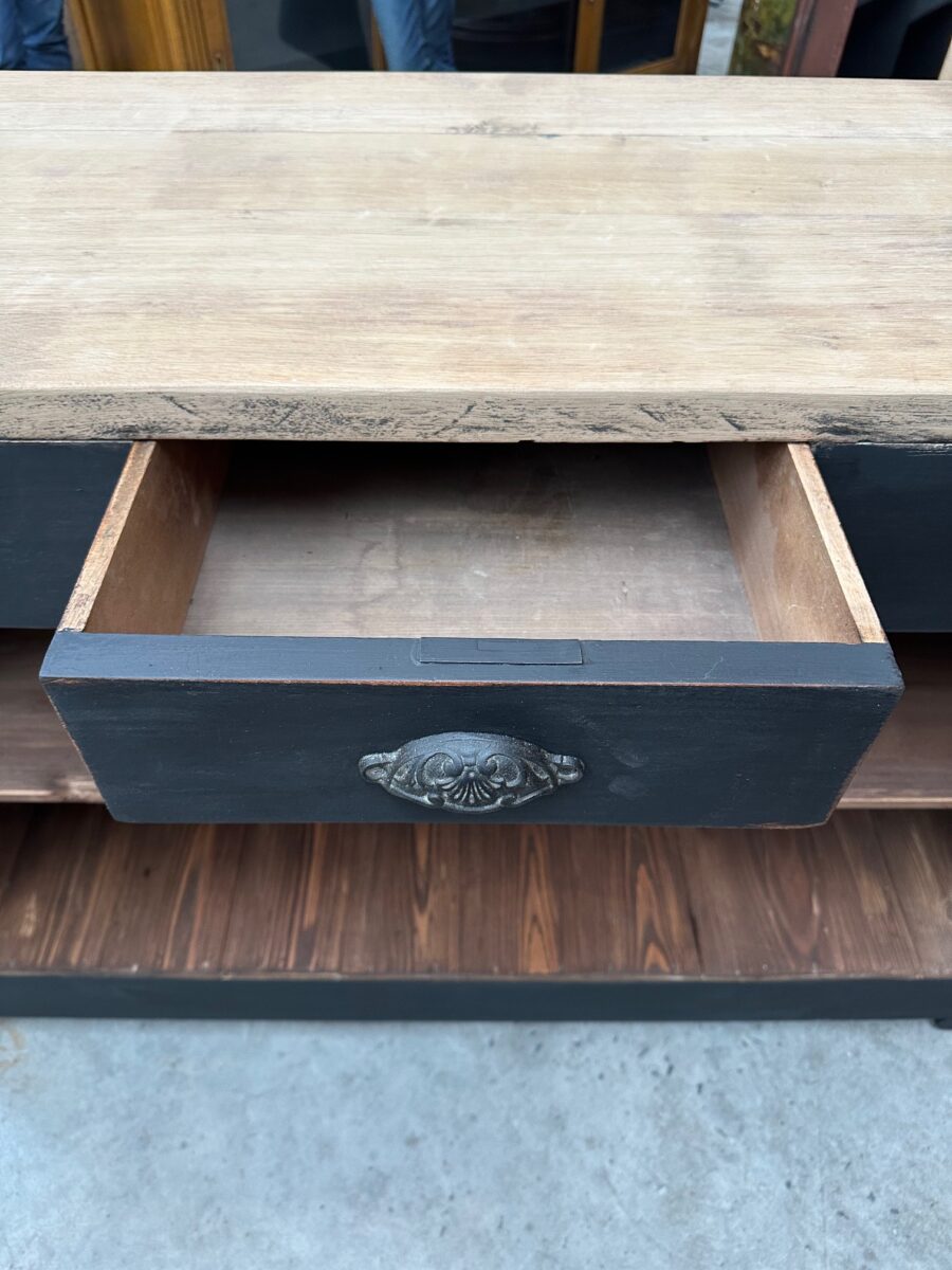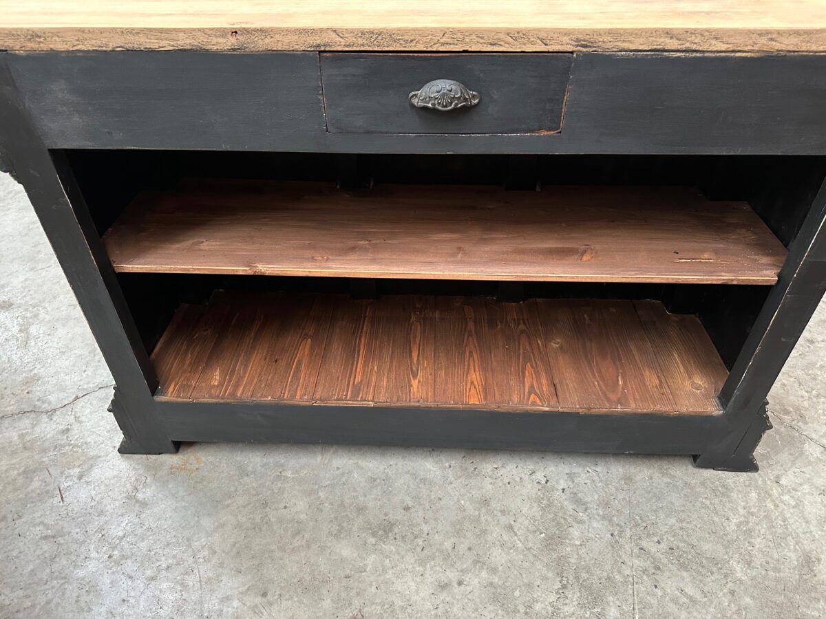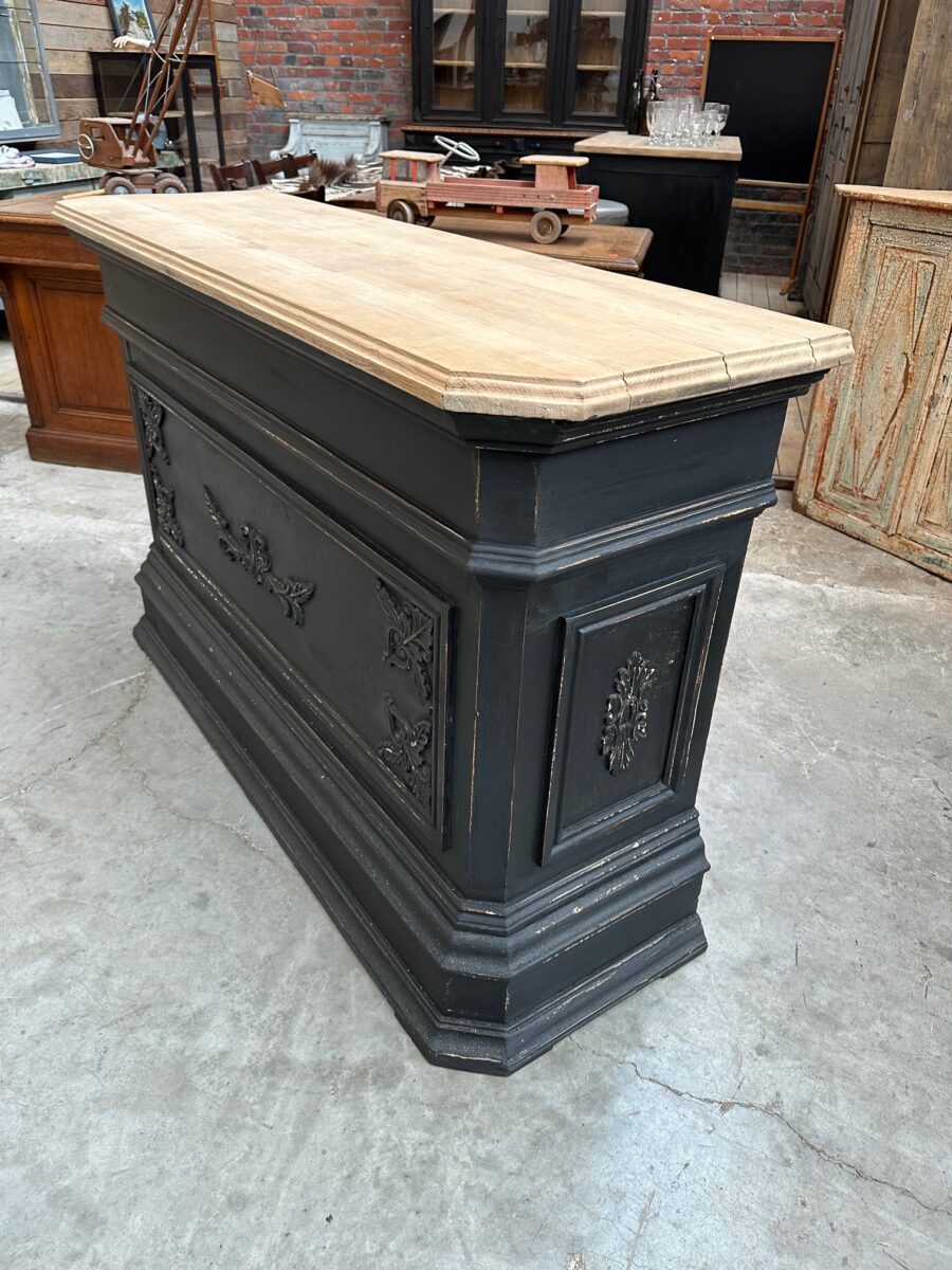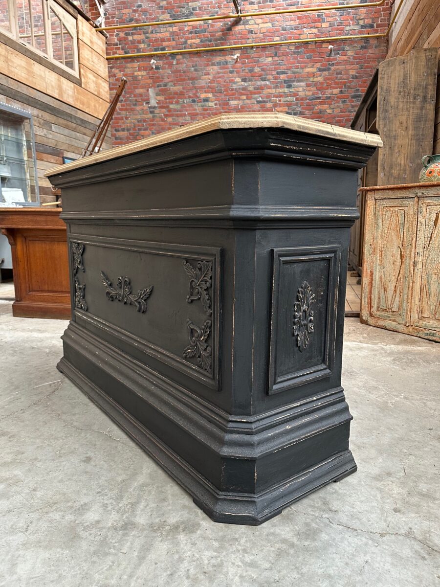 Il se compose d’un corps de meuble patiné noir et d’un plateau en chêne massif. Sa façade et ses cotés sont ornés de motifs palmettes en bois sculpté.