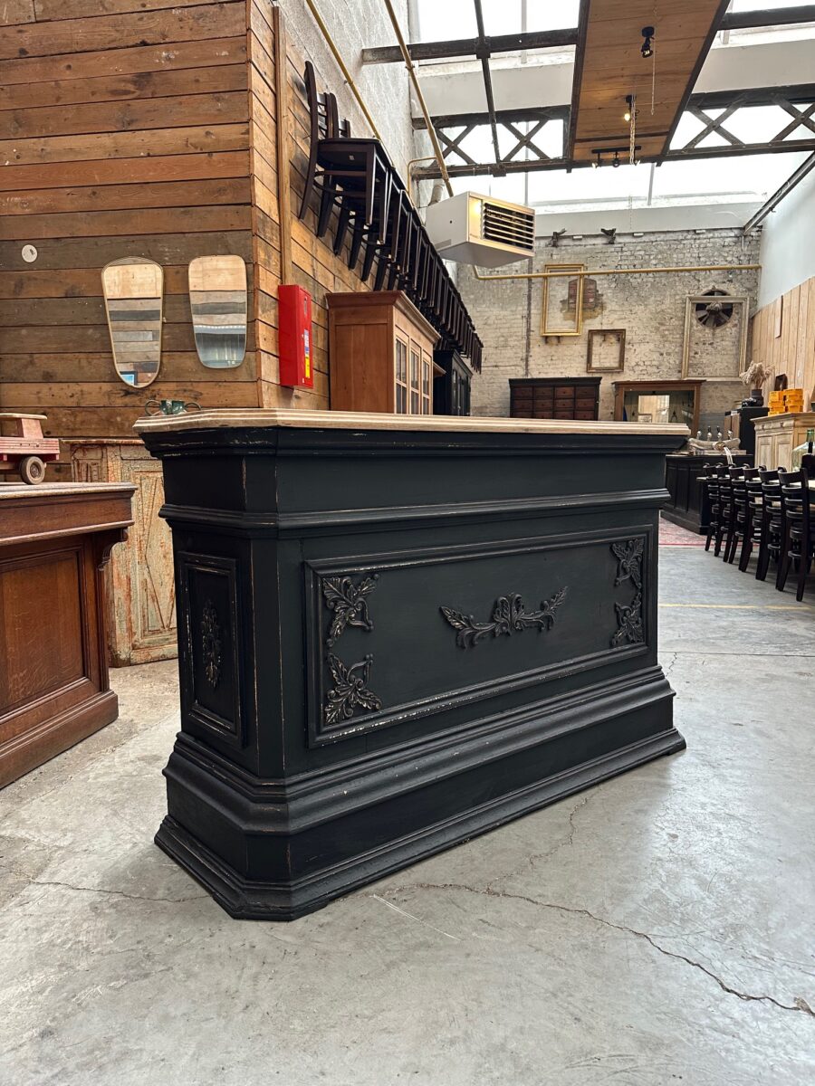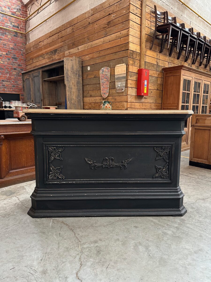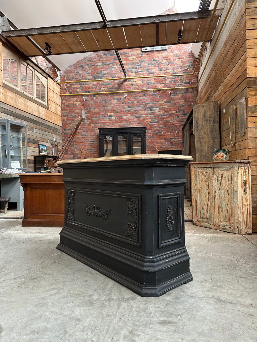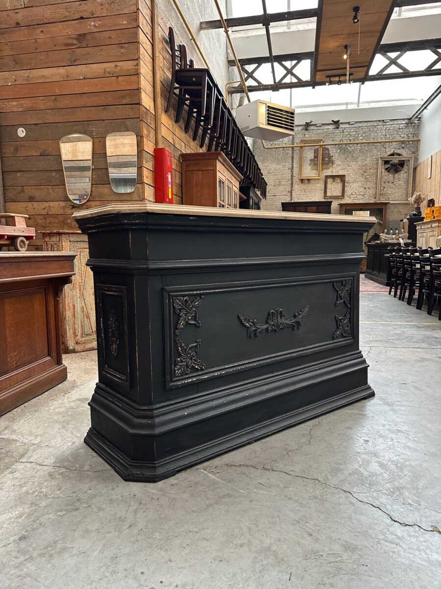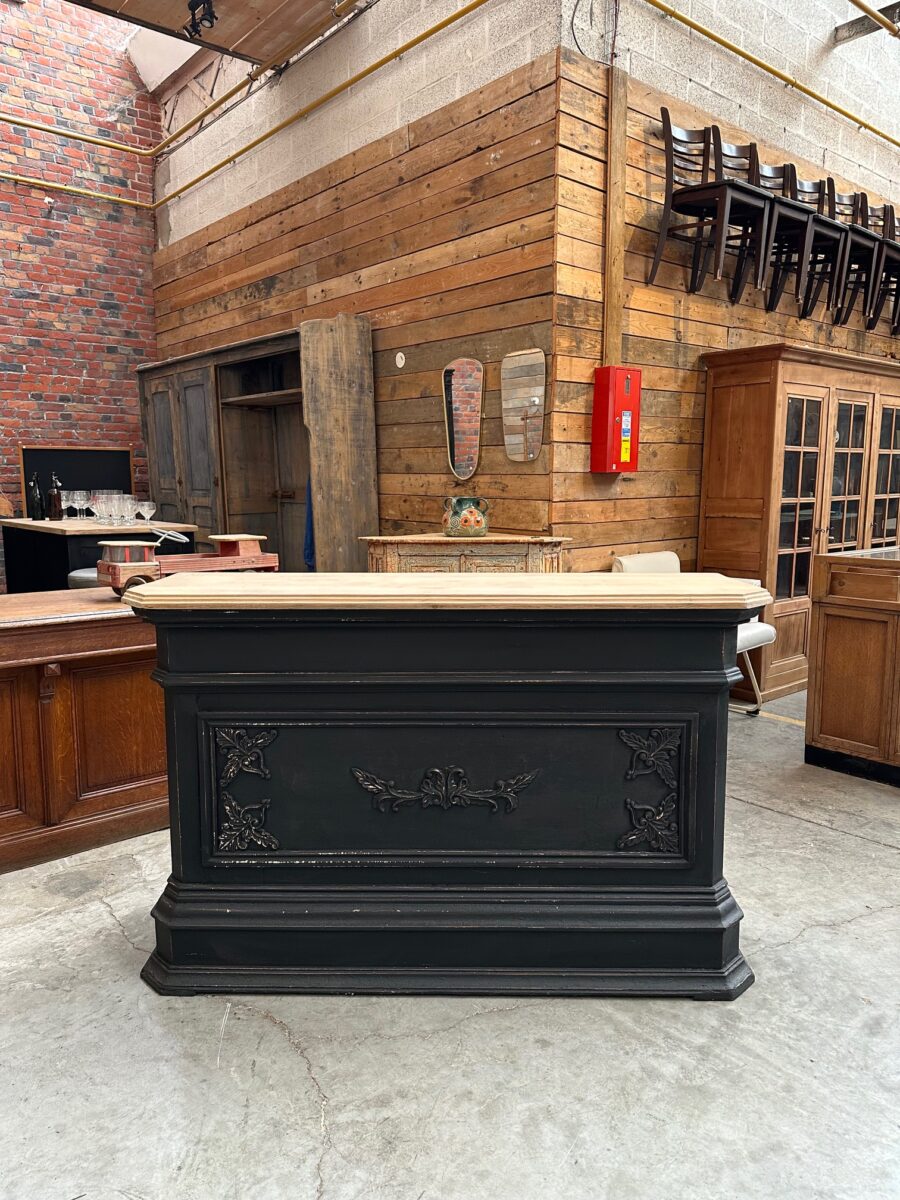Il se compose d’un corps de meuble patiné noir et d’un plateau en chêne massif. Sa façade et ses cotés sont ornés de motifs palmettes en bois sculpté.