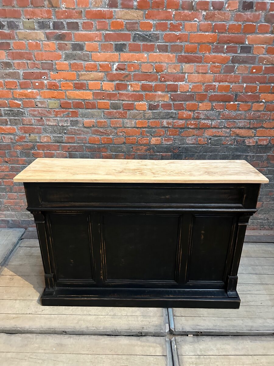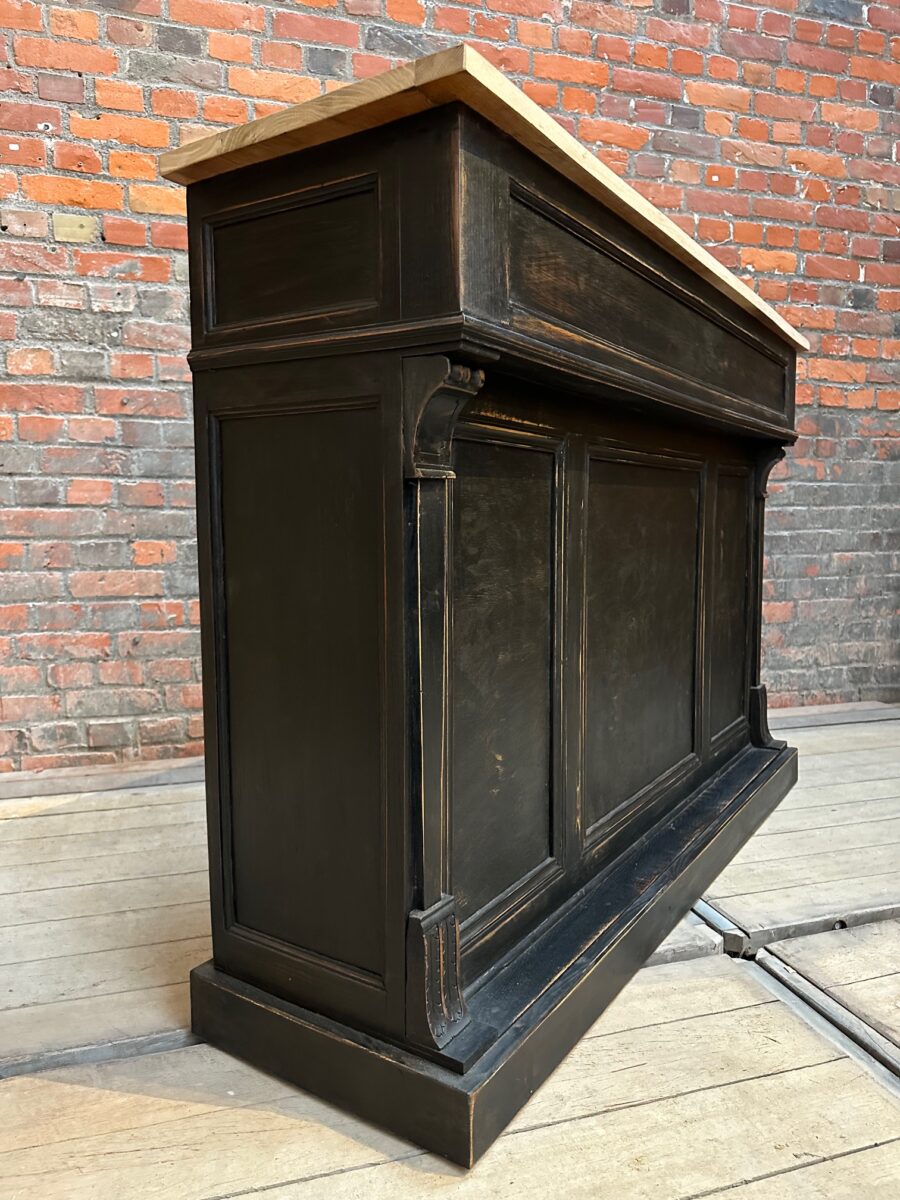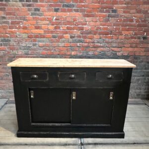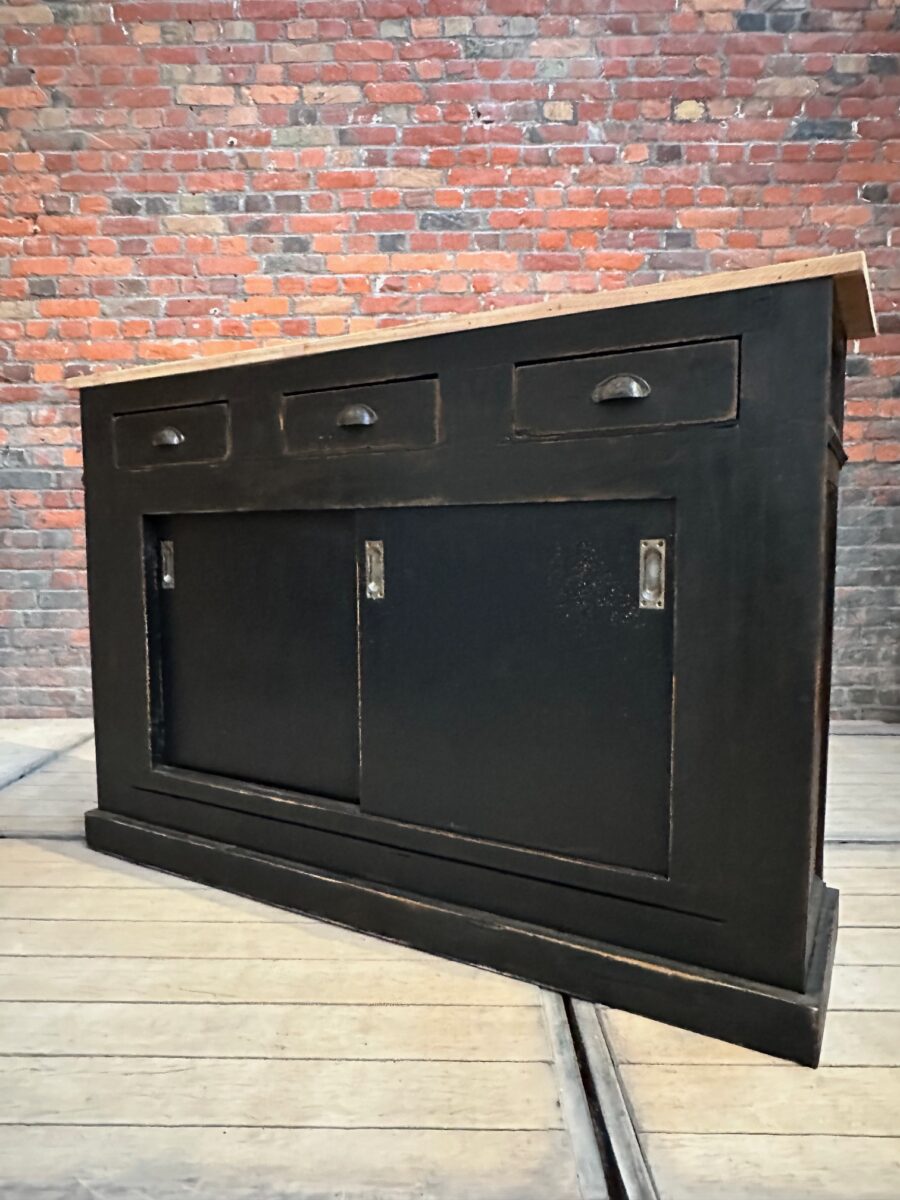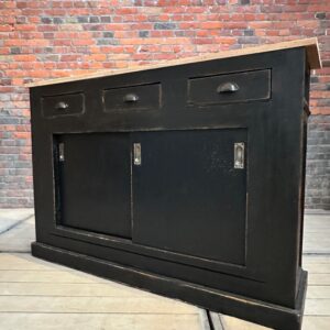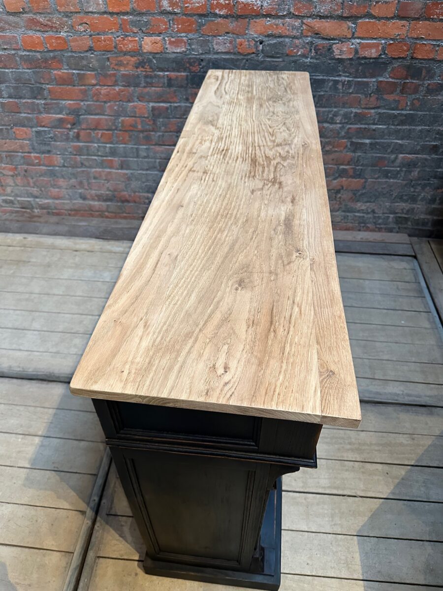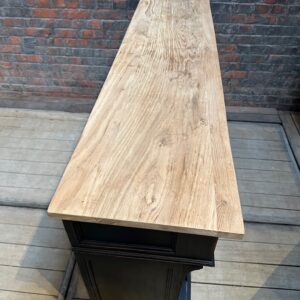 Il se compose d’un corps de meuble patiné noir et d’un plateau en bois brut
