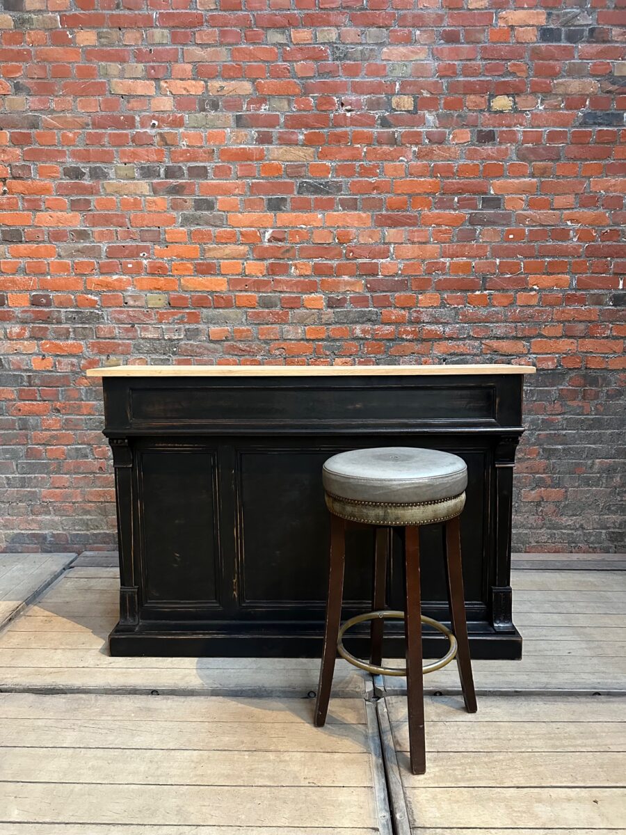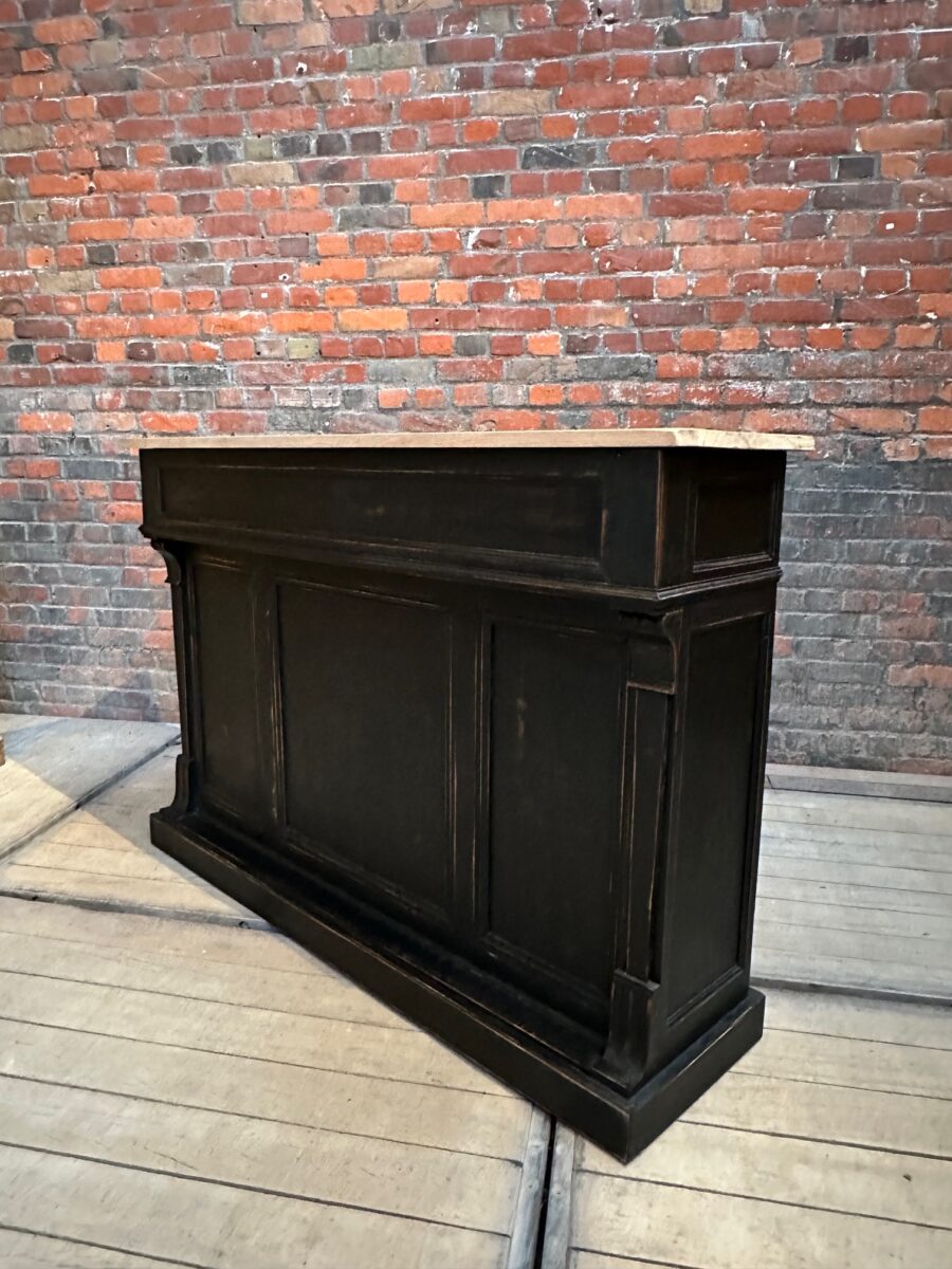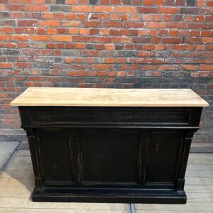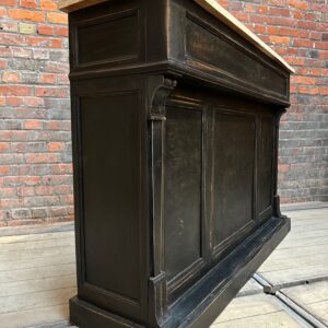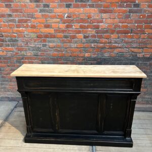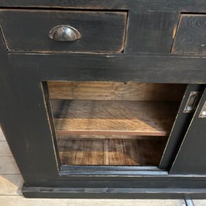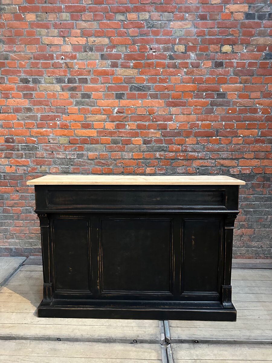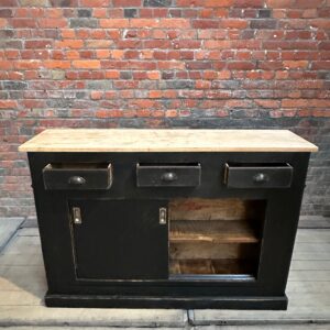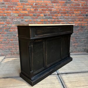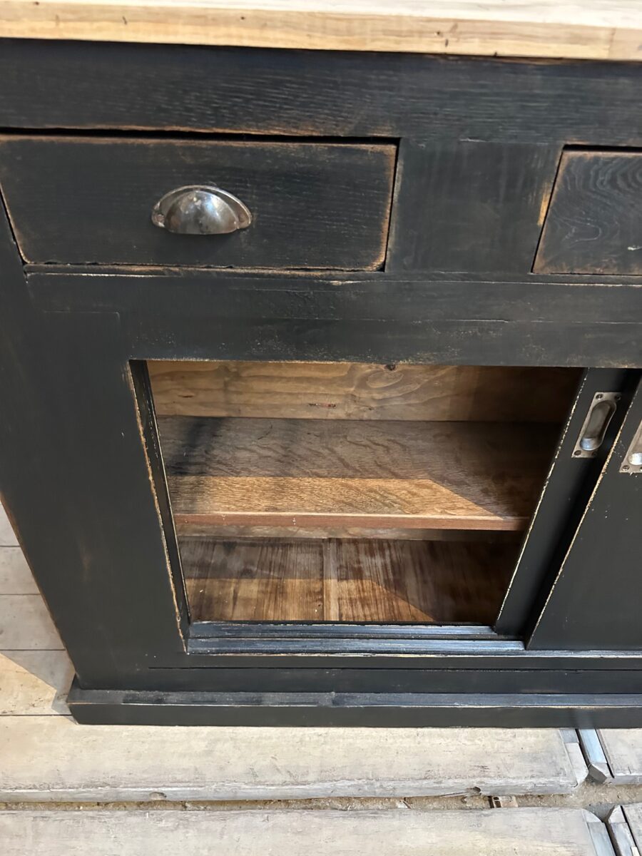 Il se compose d’un corps de meuble patiné noir et d’un plateau en bois brut