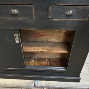 A l’arrière, il dispose de 3 petits tiroirs fonctionnels et de 2 portes coulissantes ouvrant sur une étagère (intérieur en bois brut)