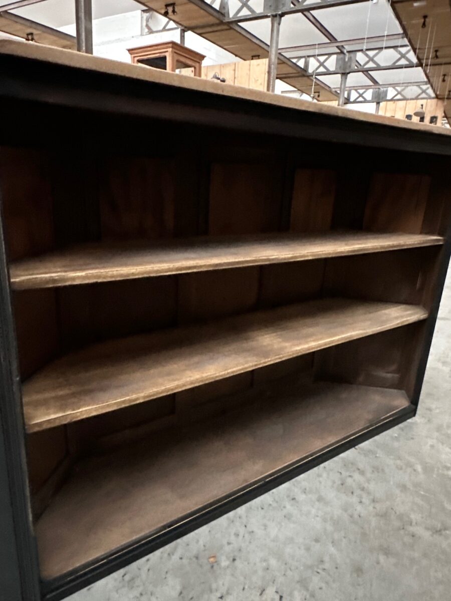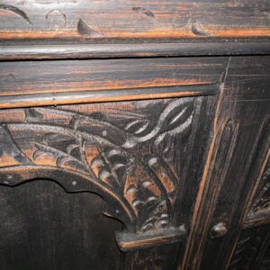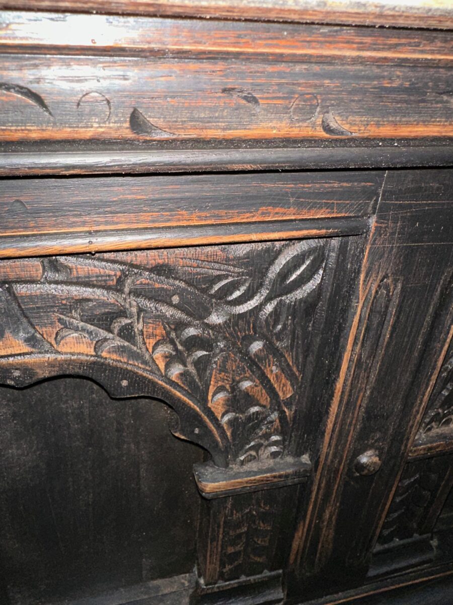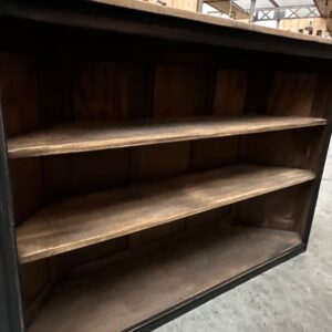 Sa façade patinée noire est dotée de motifs sculptés « arches » et son plateau est en bois brut.