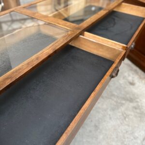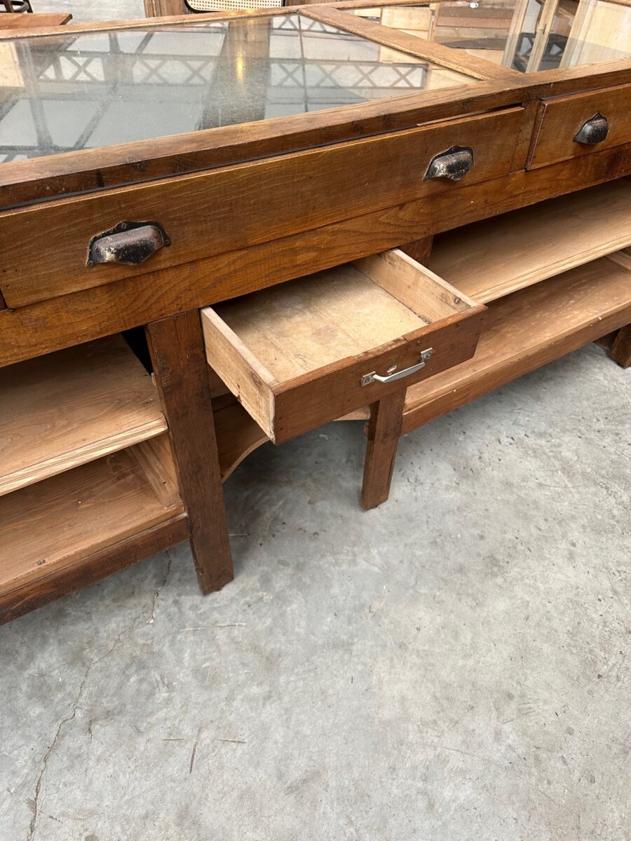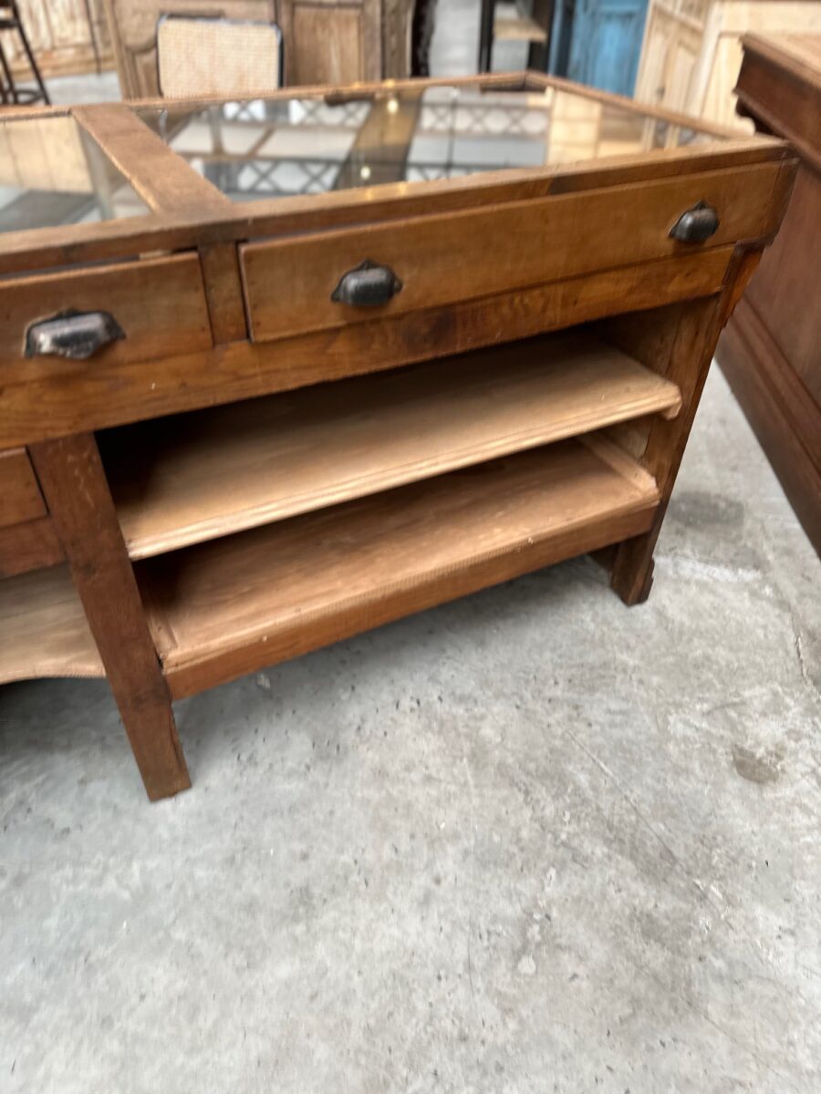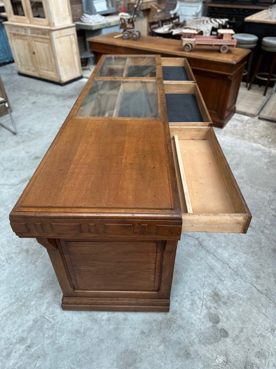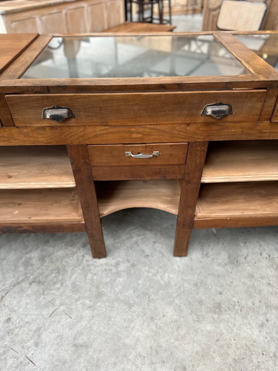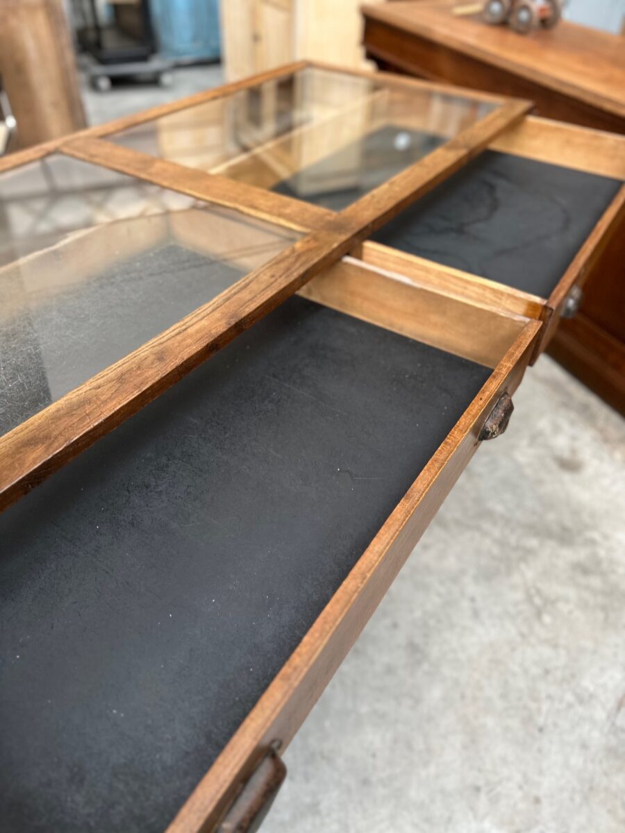 Cette pièce incroyable dispose d’un plateau doté de vitrines sur les 2/3, accessibles par des tiroirs.