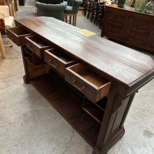A l’arrière, il se compose de 4 tiroirs fonctionnels, de 4 petits casiers de rangement et de grandes étagères arrondies.