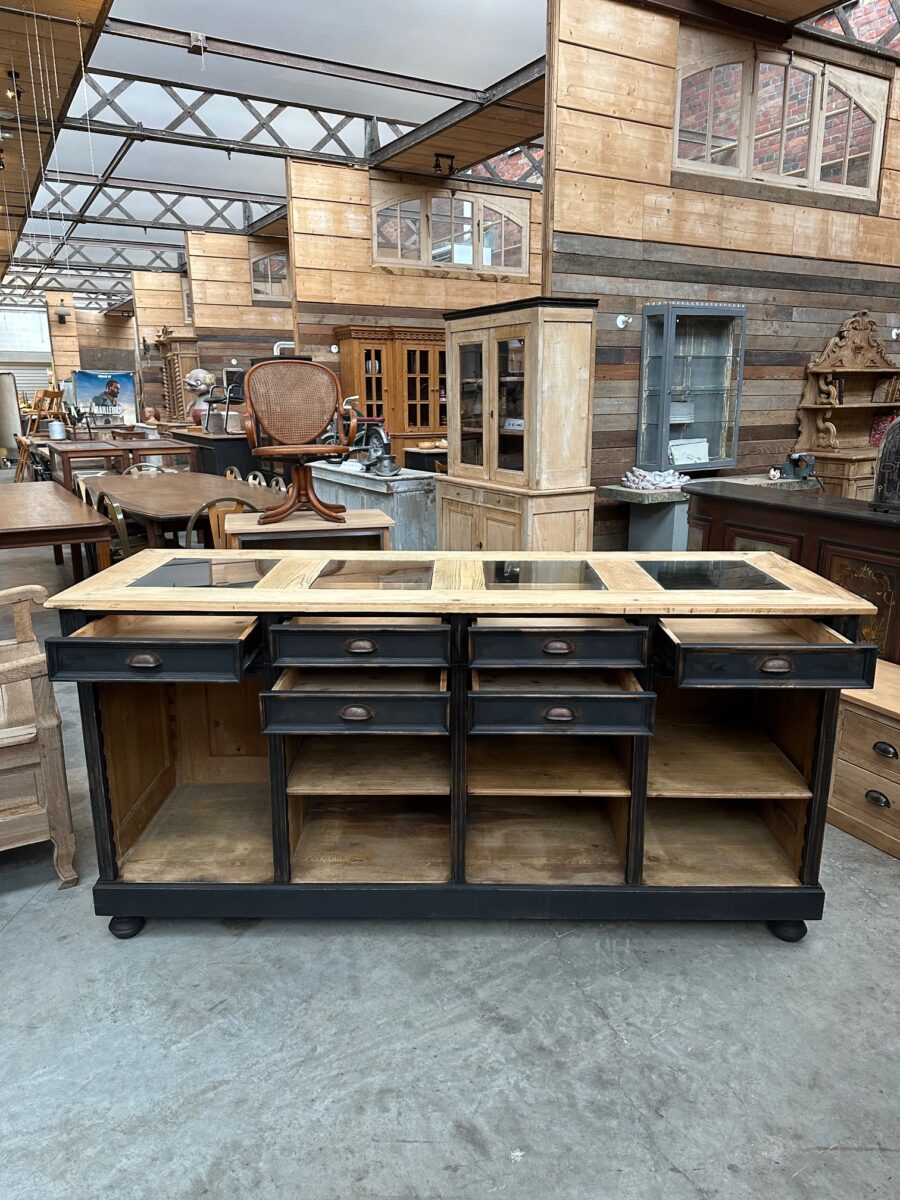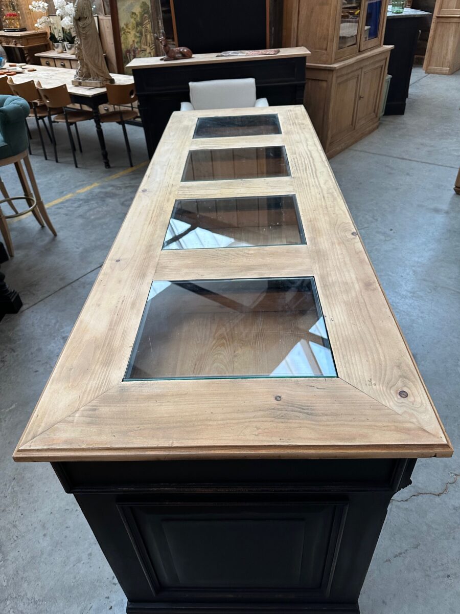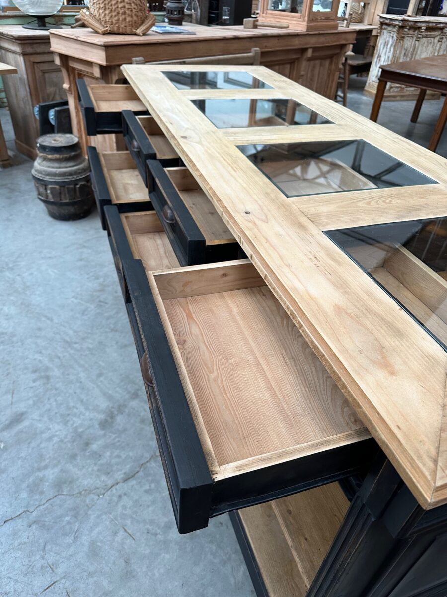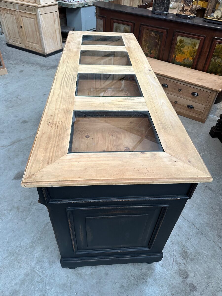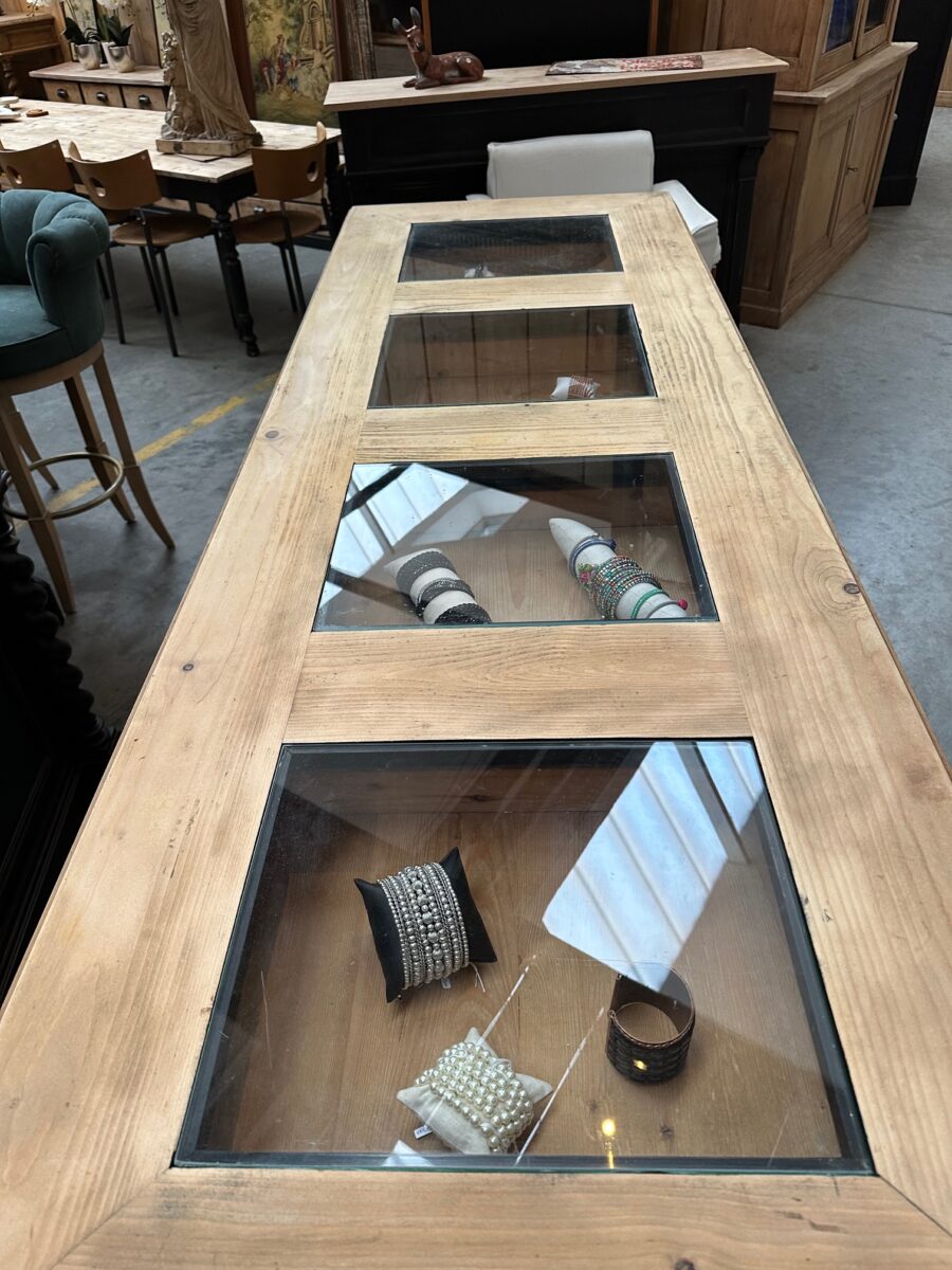 Cet ancien comptoir vitrine en sapin patiné a été entièrement restauré