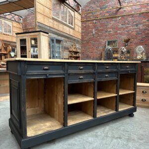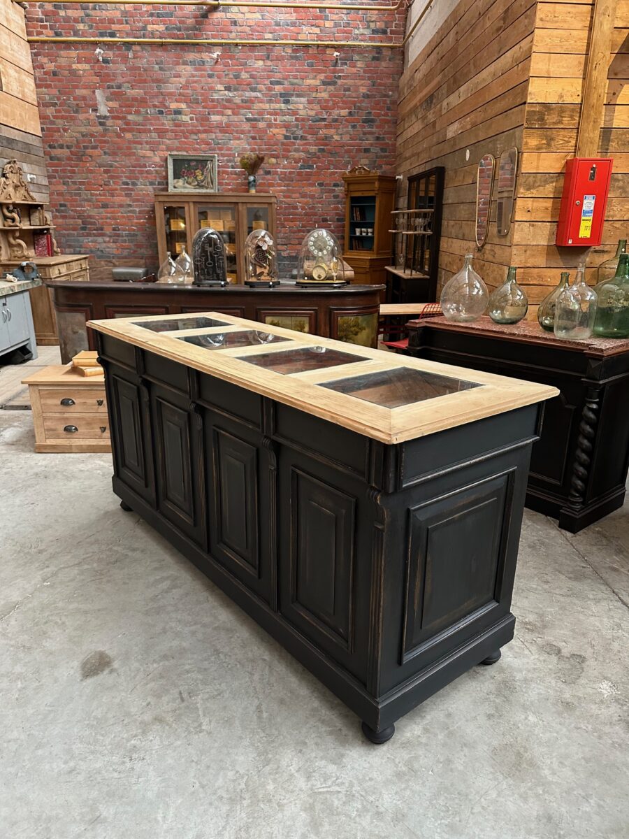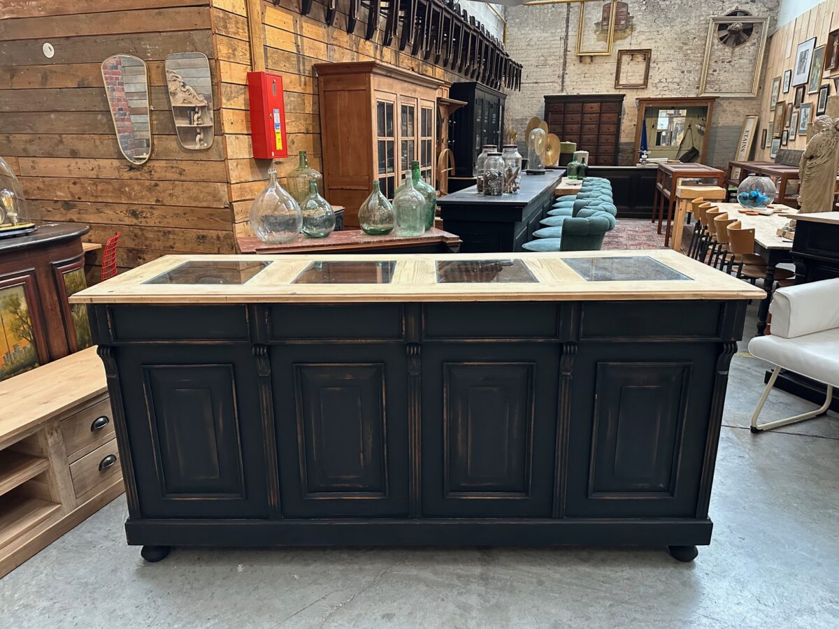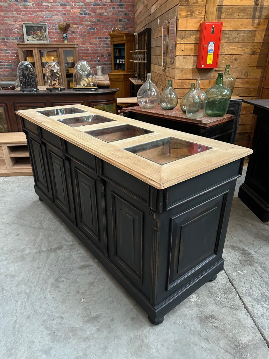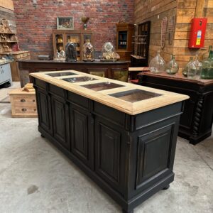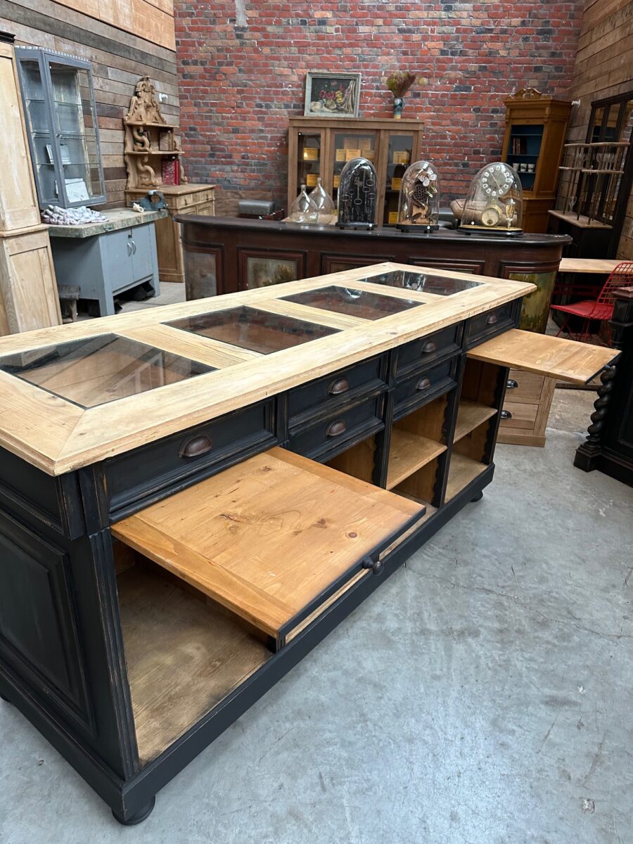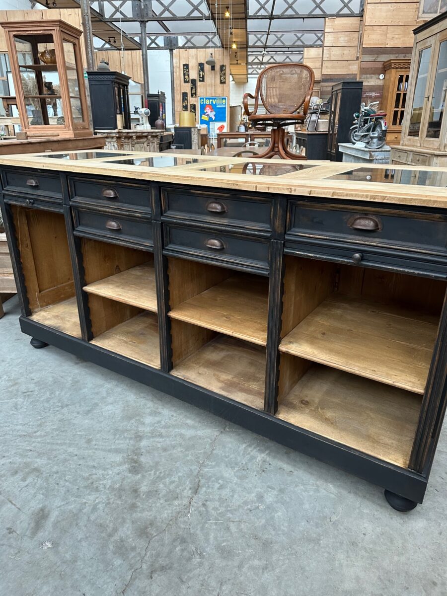 Cet ancien comptoir vitrine en sapin patiné a été entièrement restauré