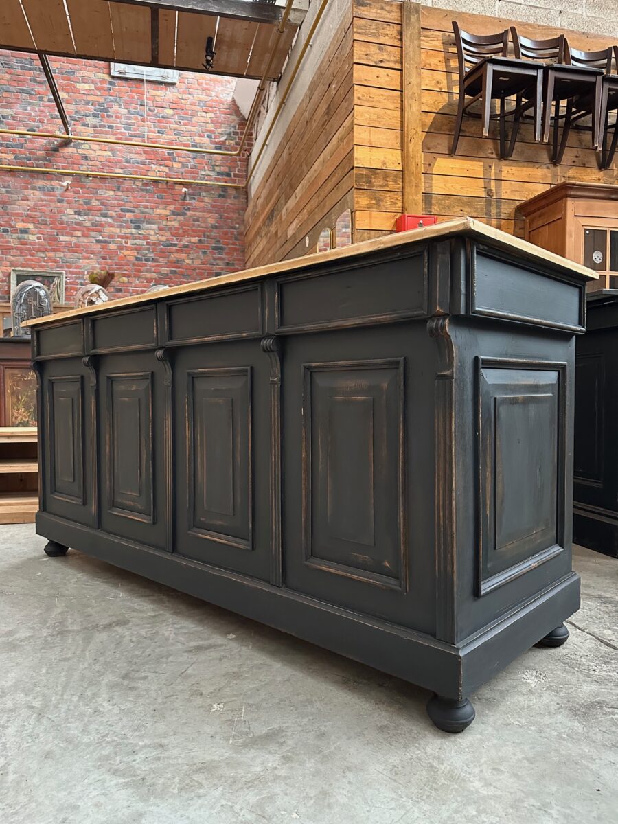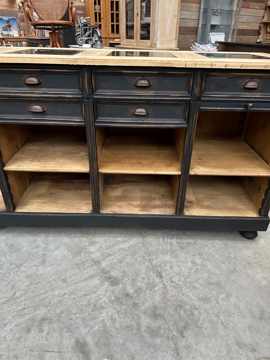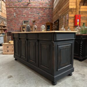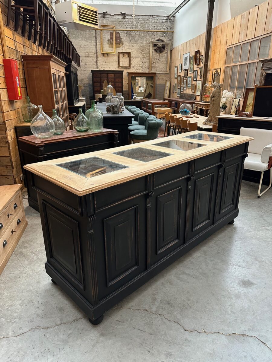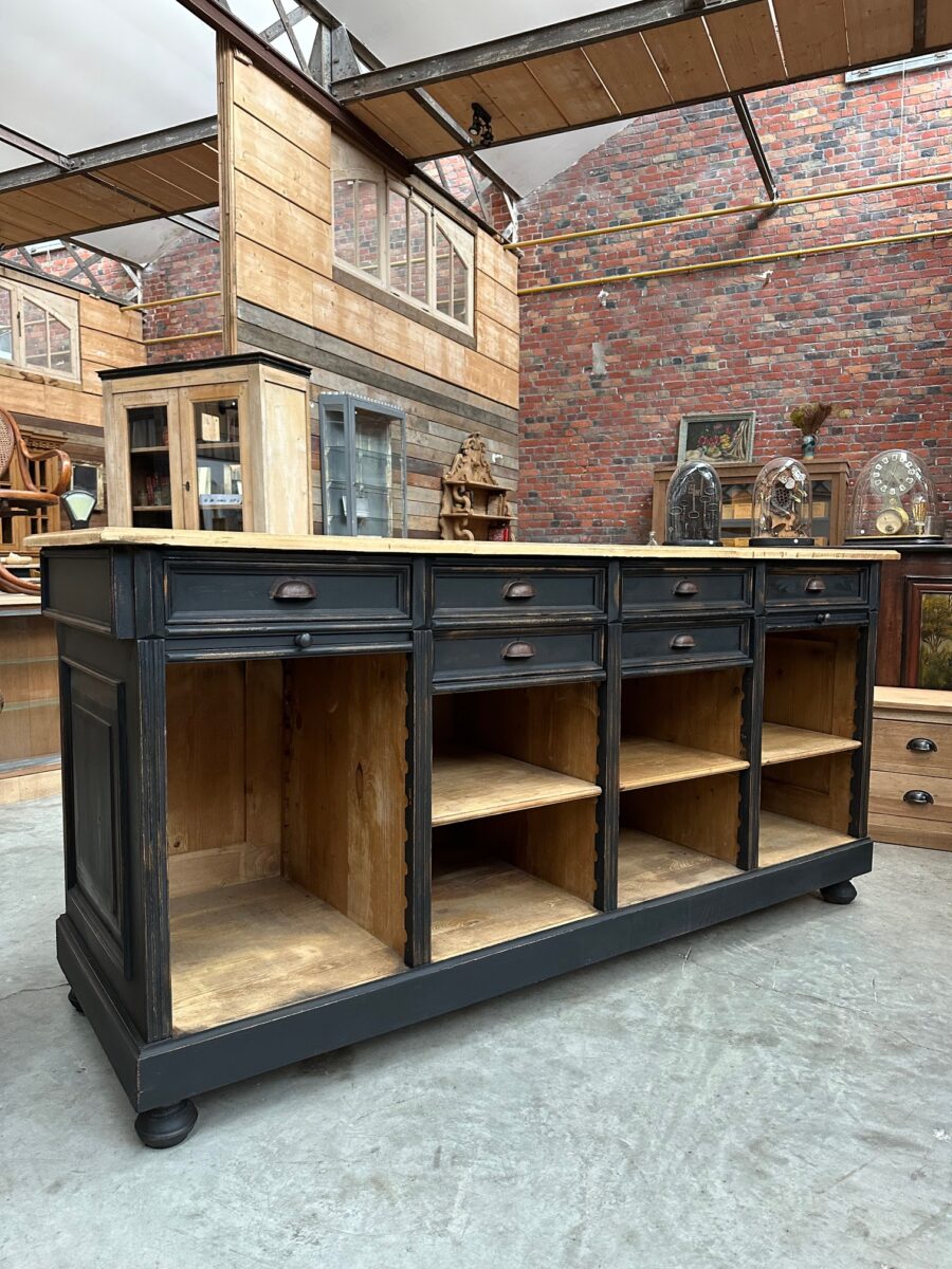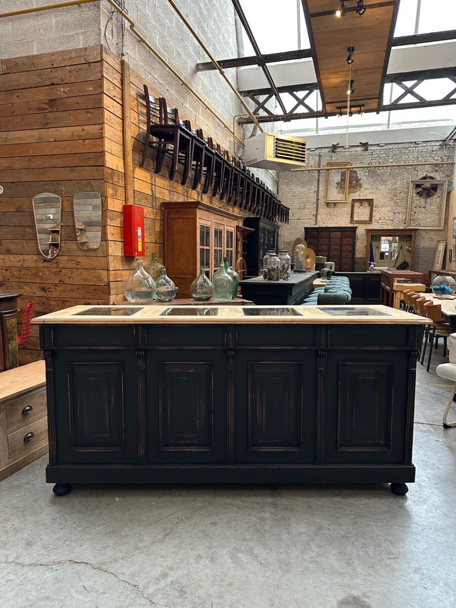 Cet ancien comptoir vitrine en sapin patiné a été entièrement restauré