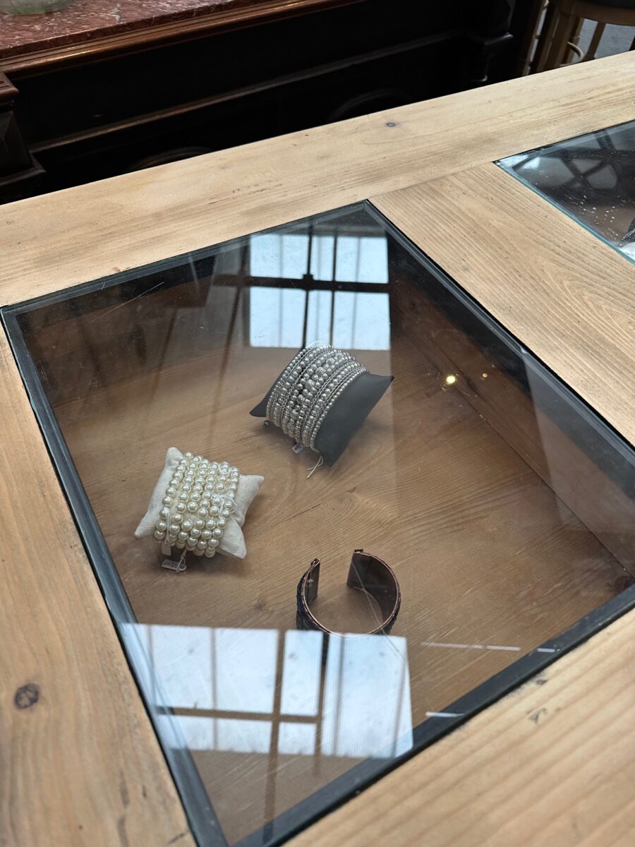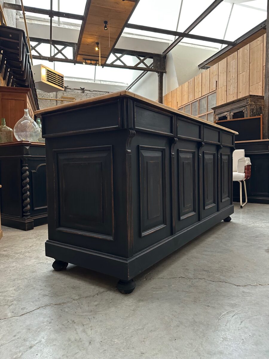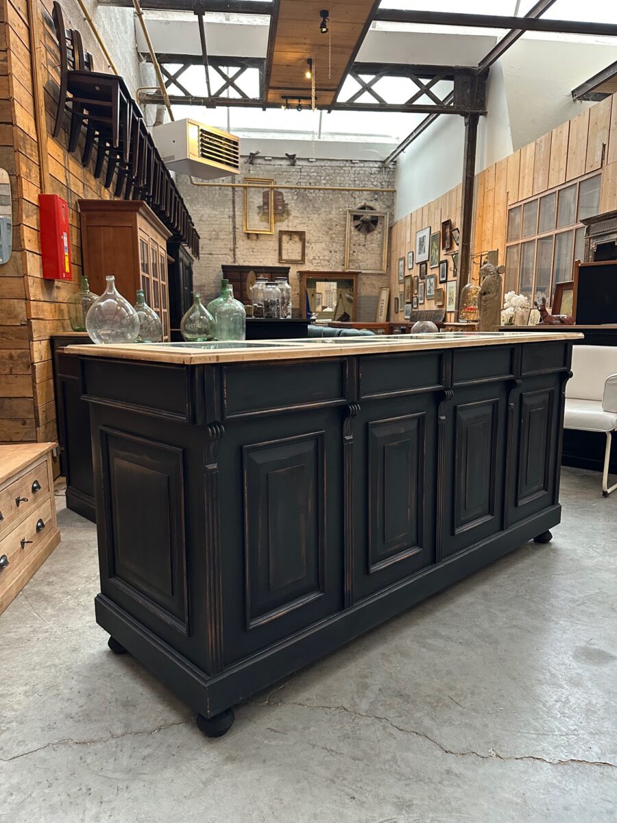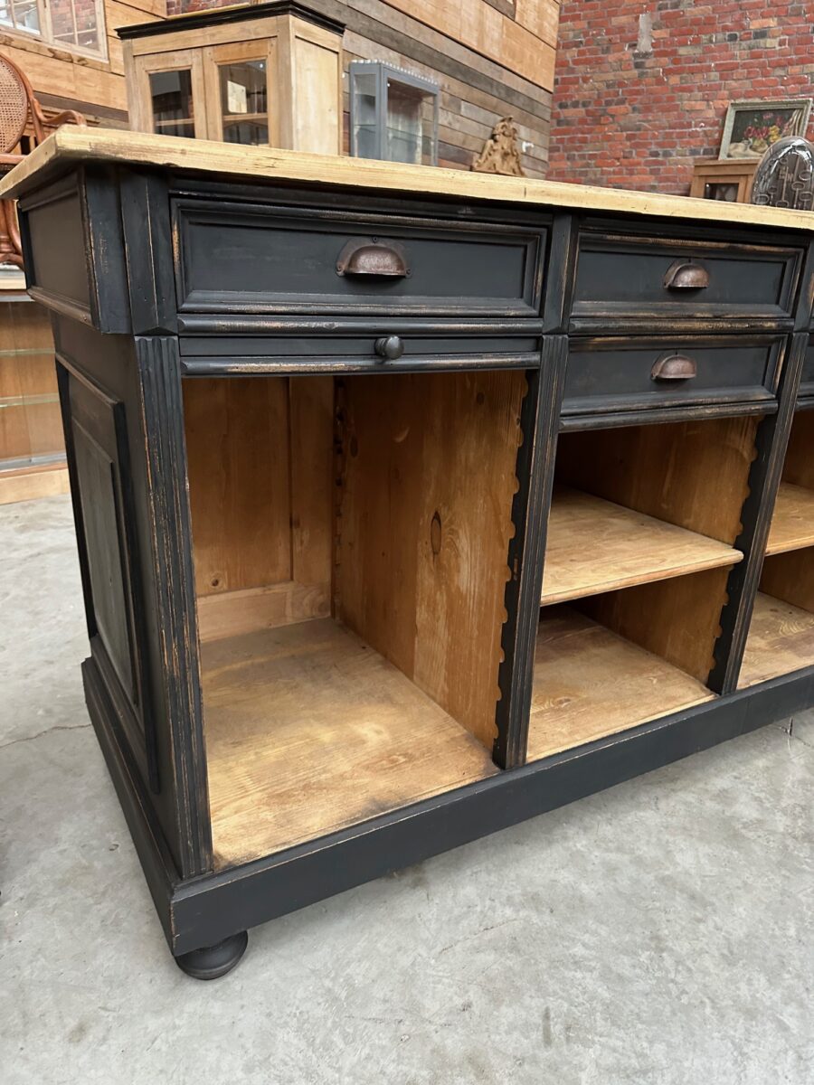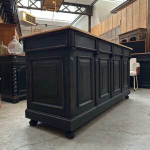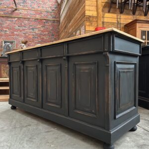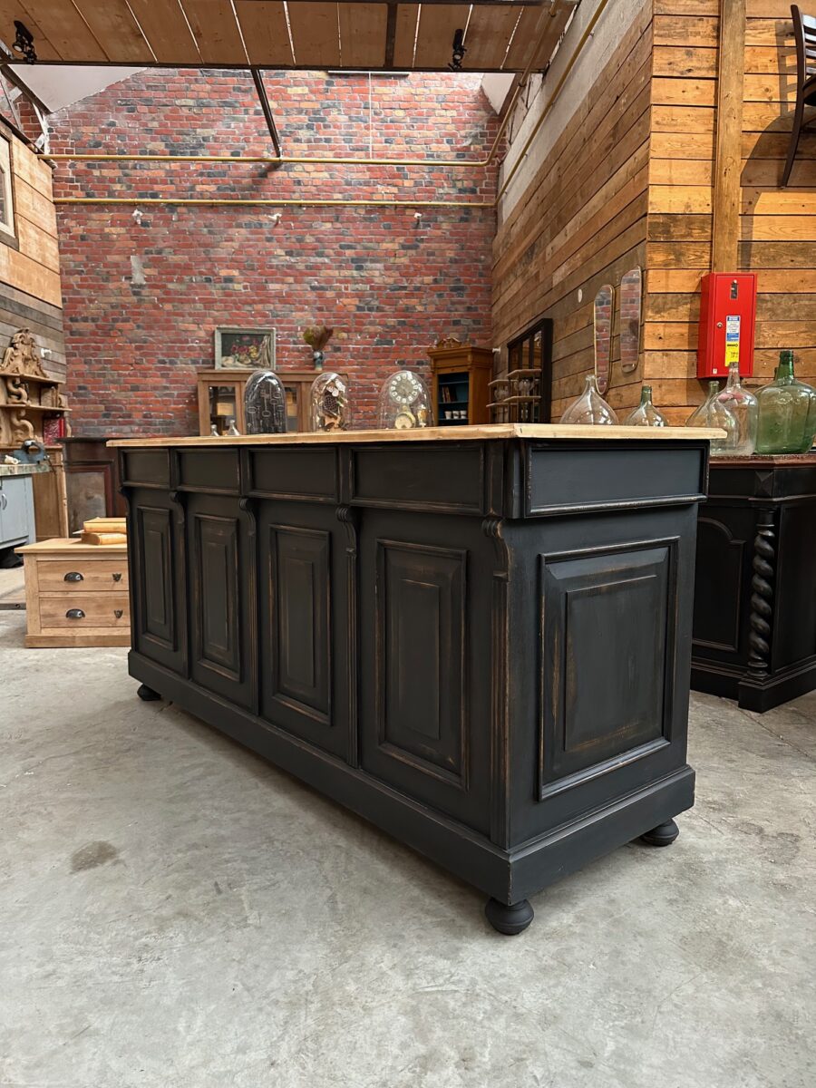 Cet ancien comptoir vitrine en sapin patiné a été entièrement restauré