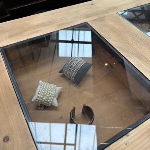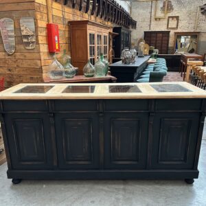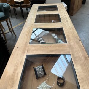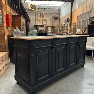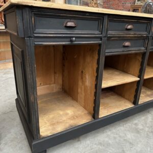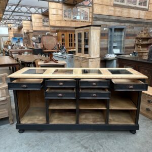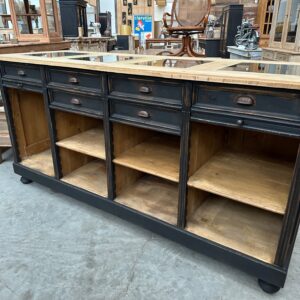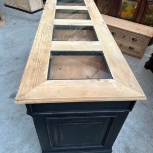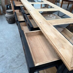 Il dispose d’une façade moulurée et d’un plateau en bois brut doté de 4 vitrines accessibles grâce à 4 tiroirs se situant à l’arrière du meuble.
