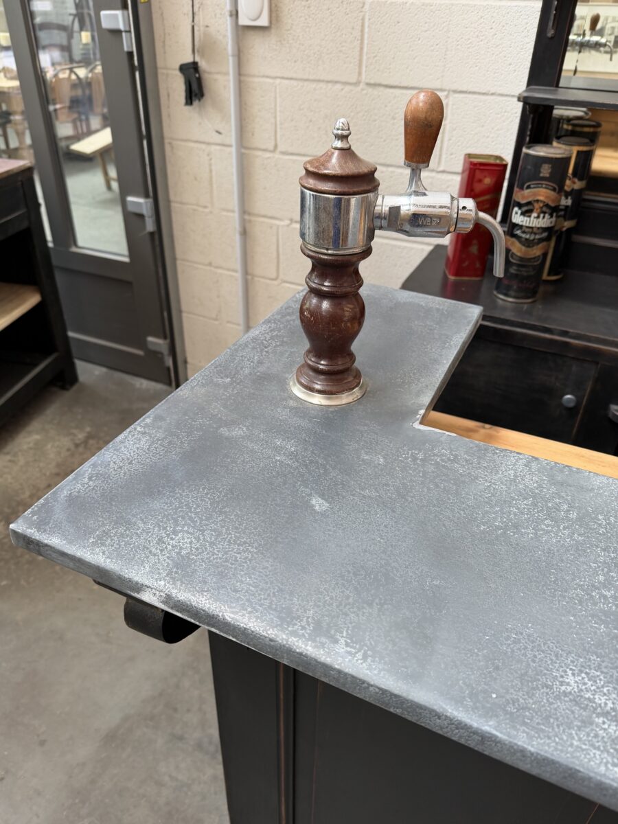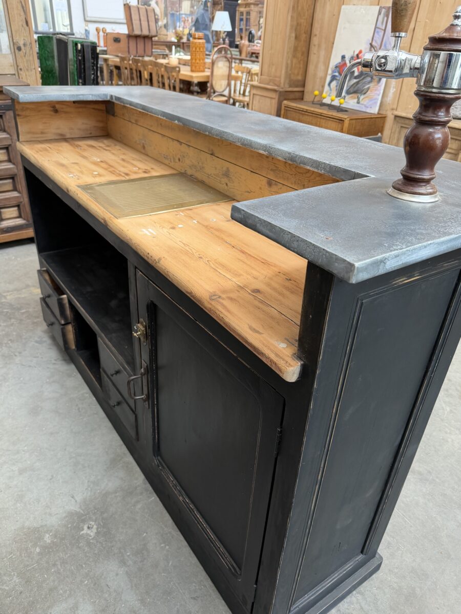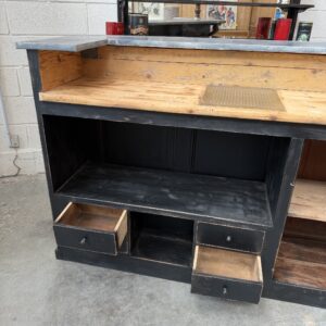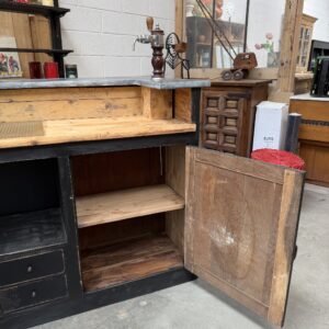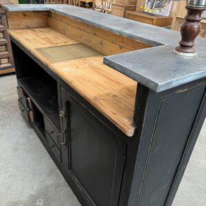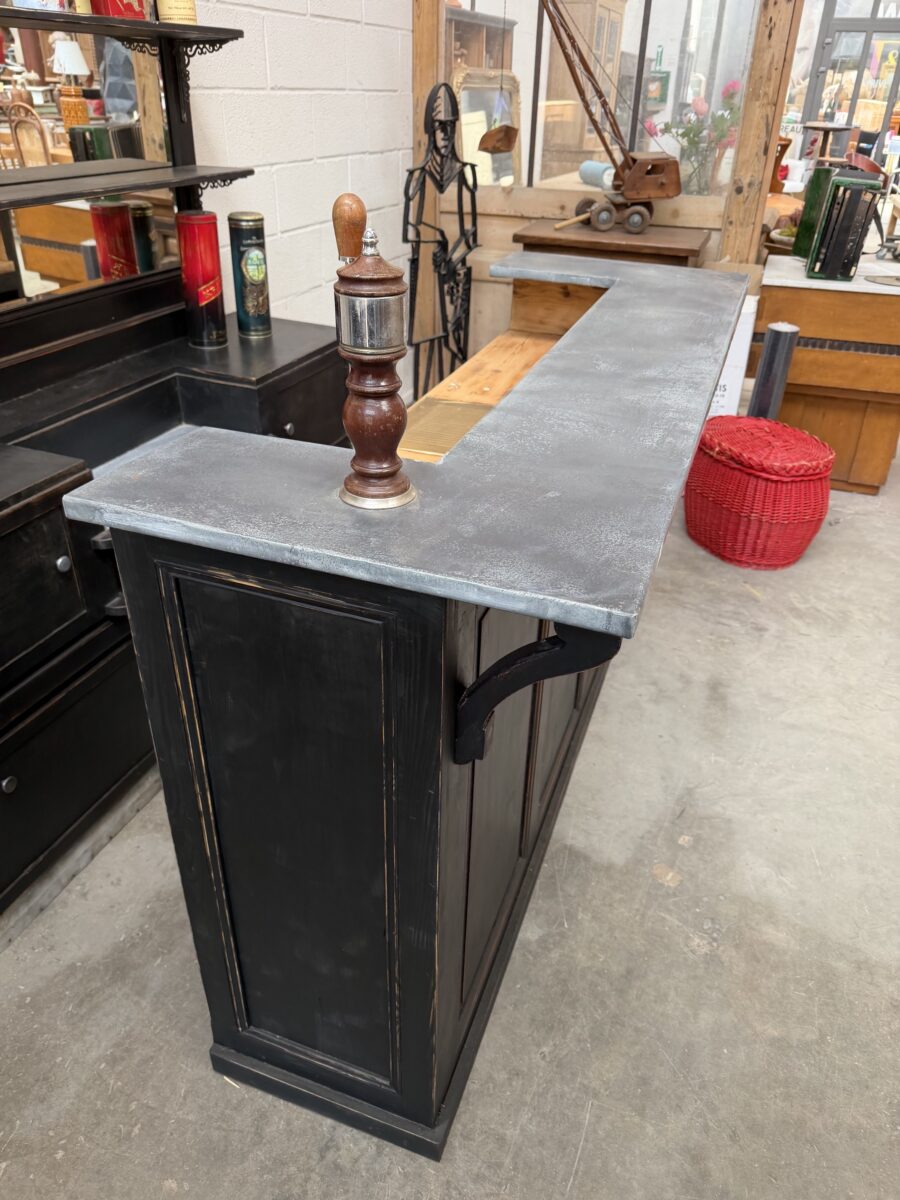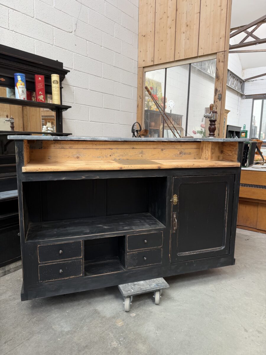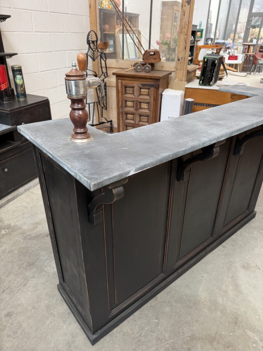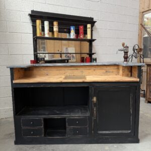 Il se compose d’un comptoir de bar patiné noir, son plateau est en zinc, doté d’une pompe à bière, et son plan de travail est en bois brut. A l’arrière, il comprend 1 porte ouvrant sur une étagère, un grand espace de rangement ouvert, 4 tiroirs fonctionnels et une niche.