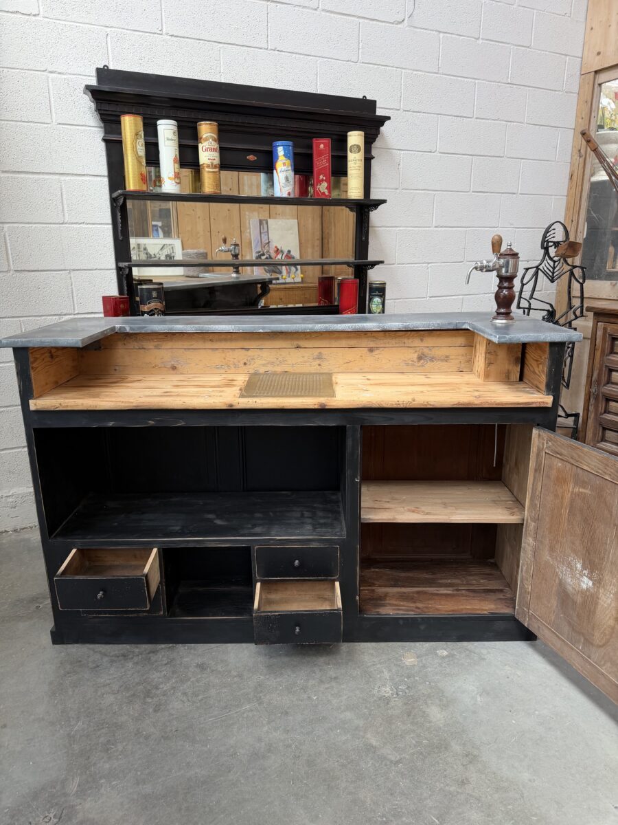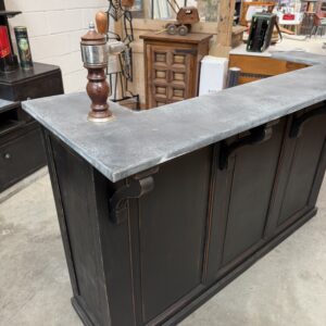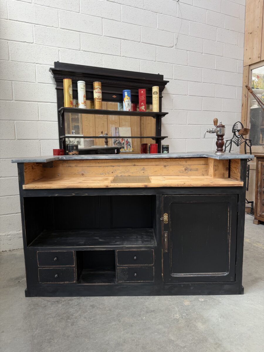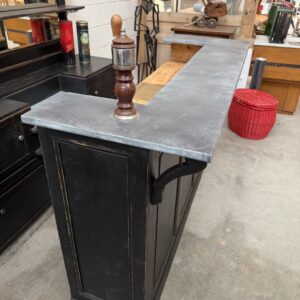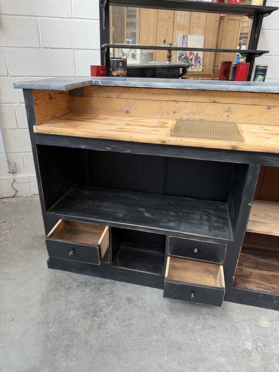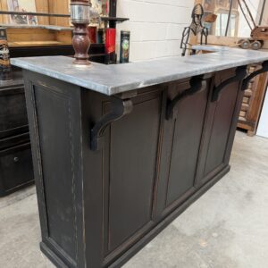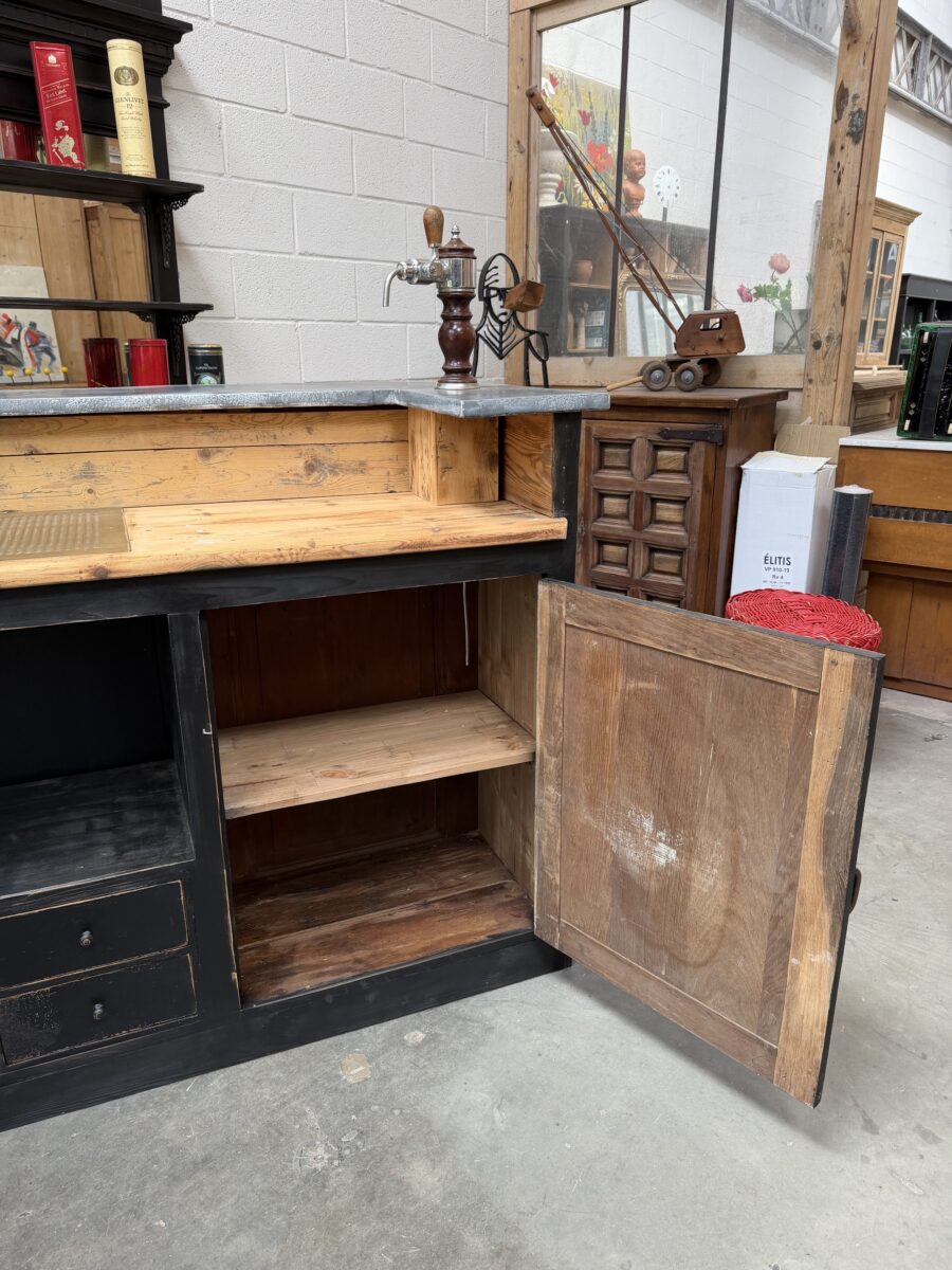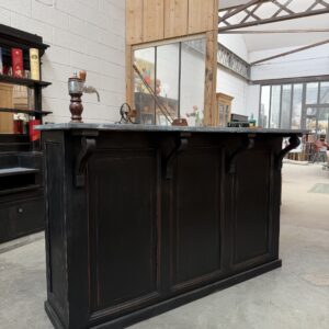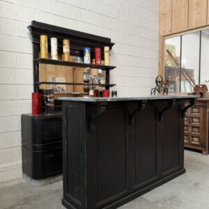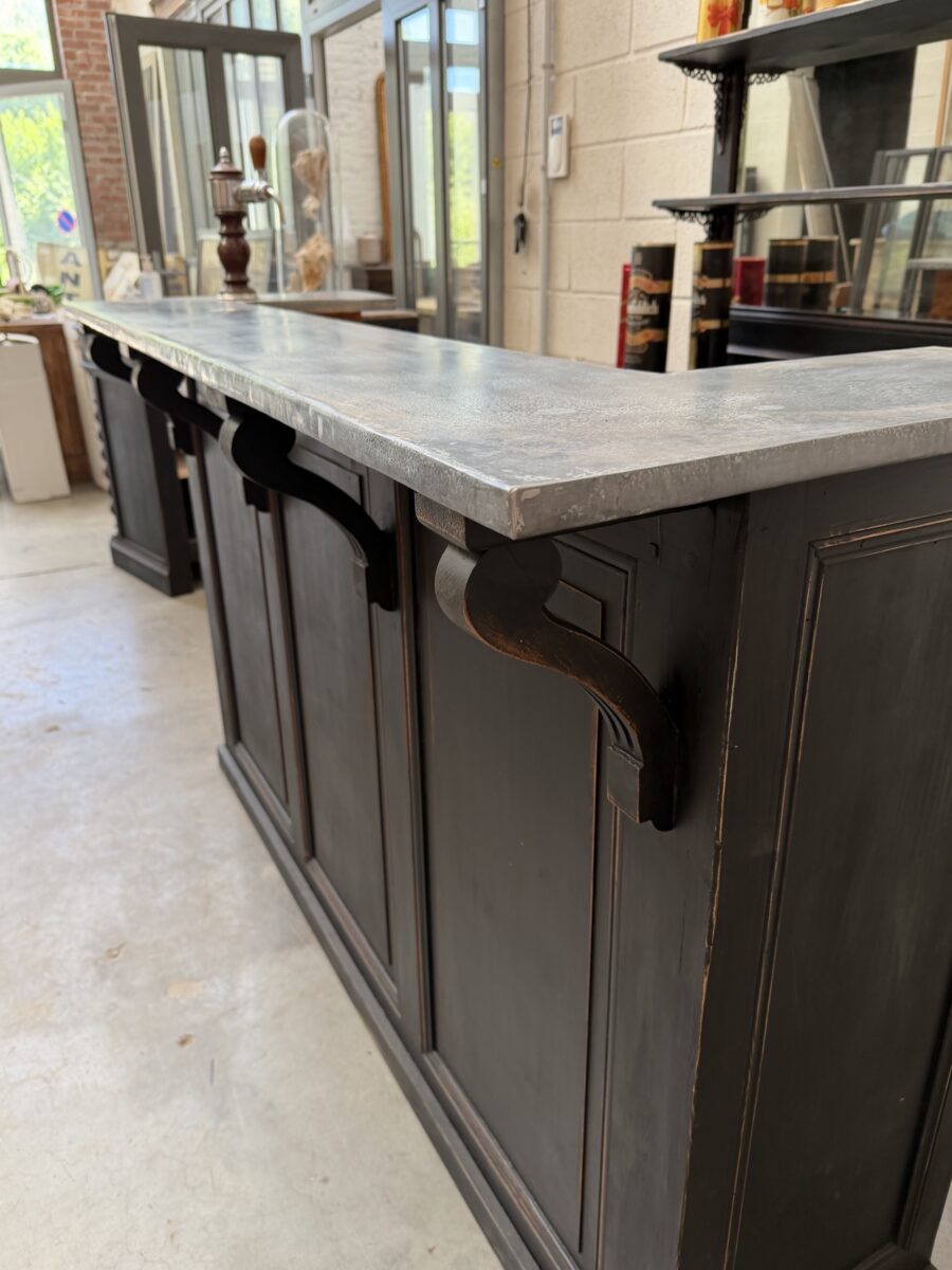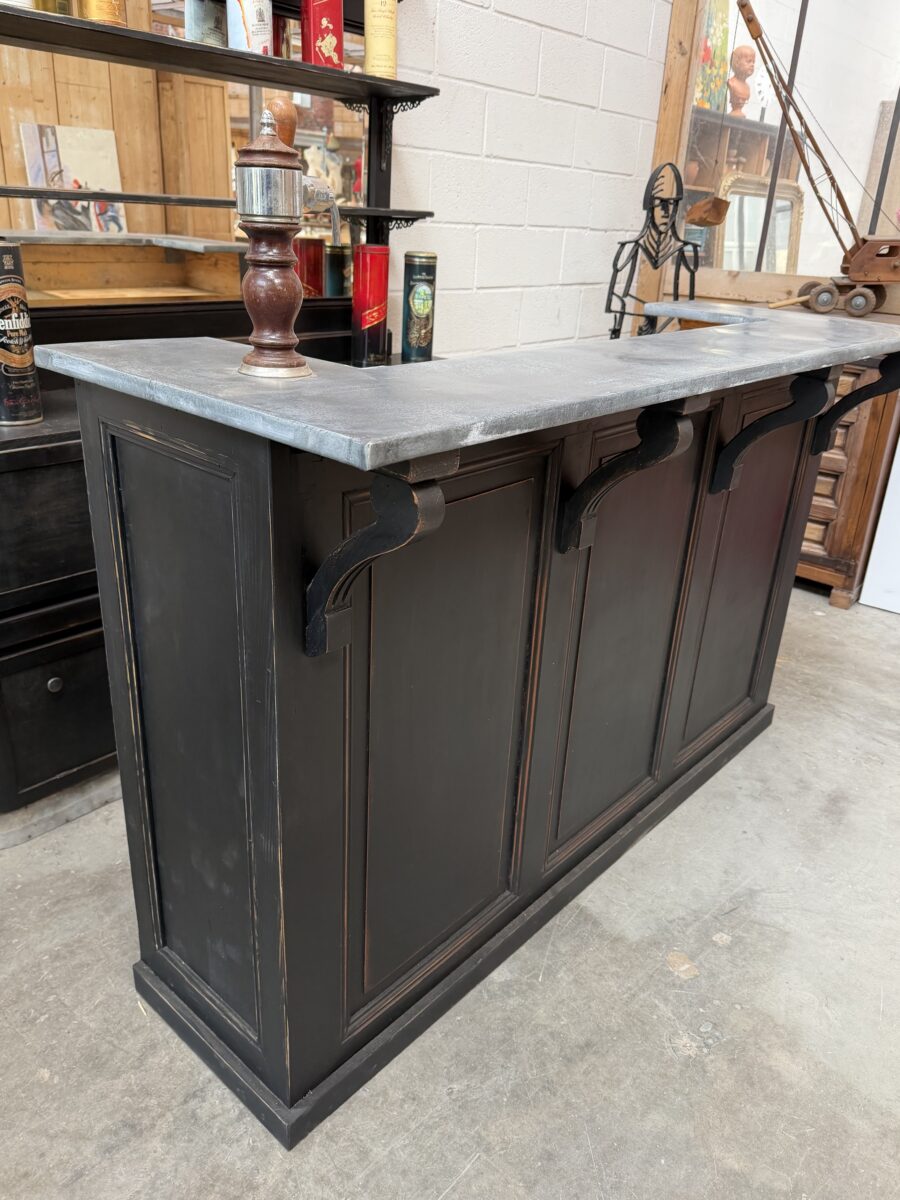 Il se compose d’un comptoir de bar patiné noir, son plateau est en zinc, doté d’une pompe à bière, et son plan de travail est en bois brut. A l’arrière, il comprend 1 porte ouvrant sur une étagère, un grand espace de rangement ouvert, 4 tiroirs fonctionnels et une niche.
