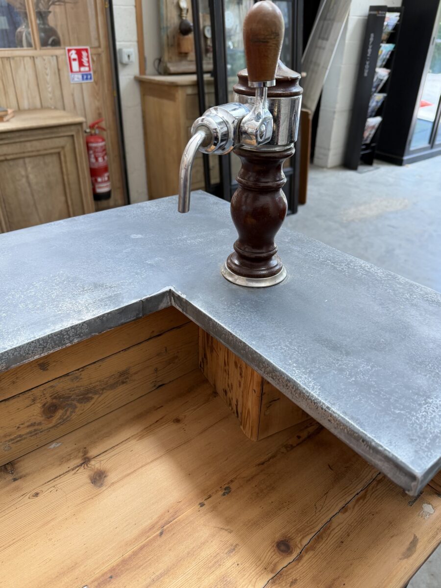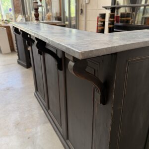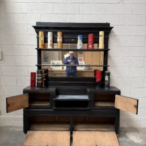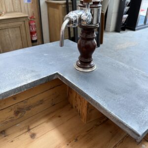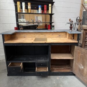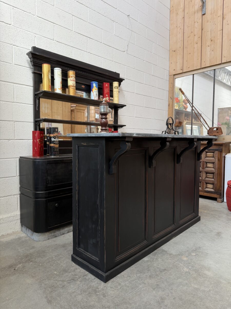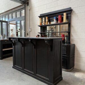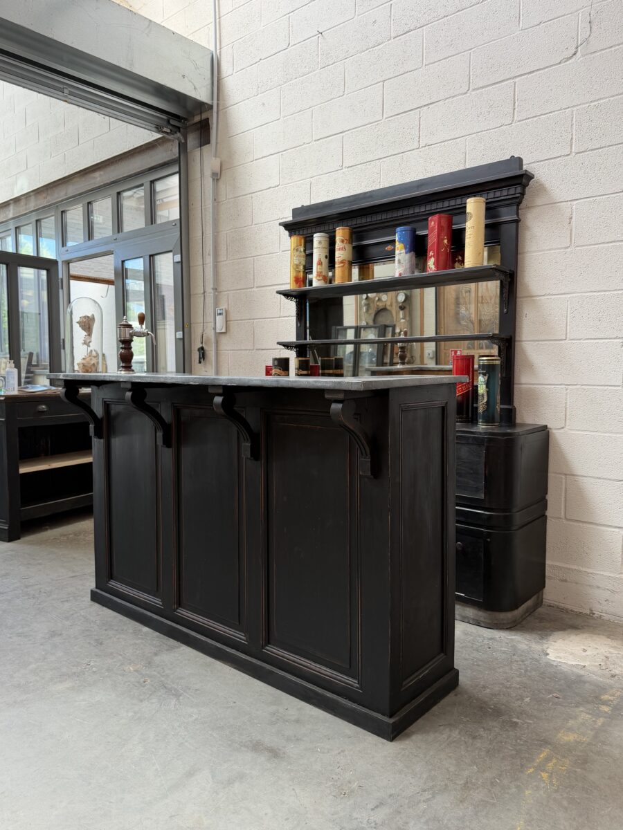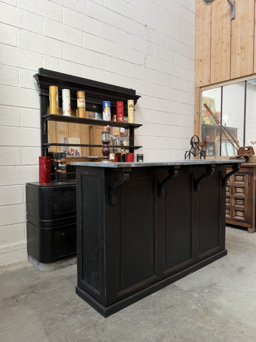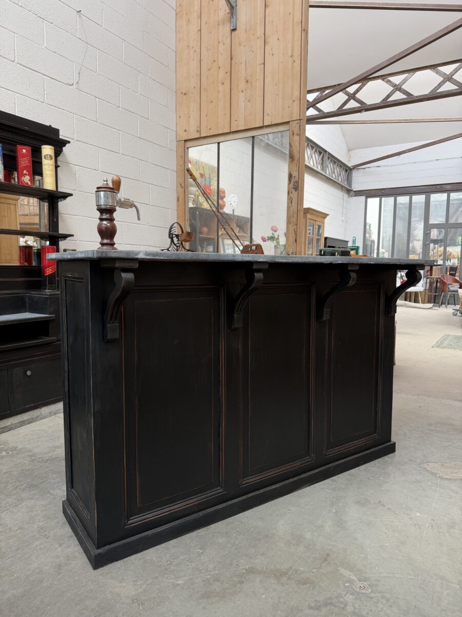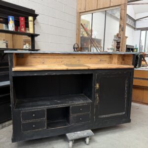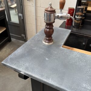 Il se compose d’un comptoir de bar patiné noir, son plateau est en zinc, doté d’une pompe à bière, et son plan de travail est en bois brut. A l’arrière, il comprend 1 porte ouvrant sur une étagère, un grand espace de rangement ouvert, 4 tiroirs fonctionnels et une niche.