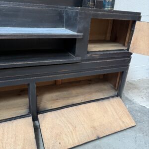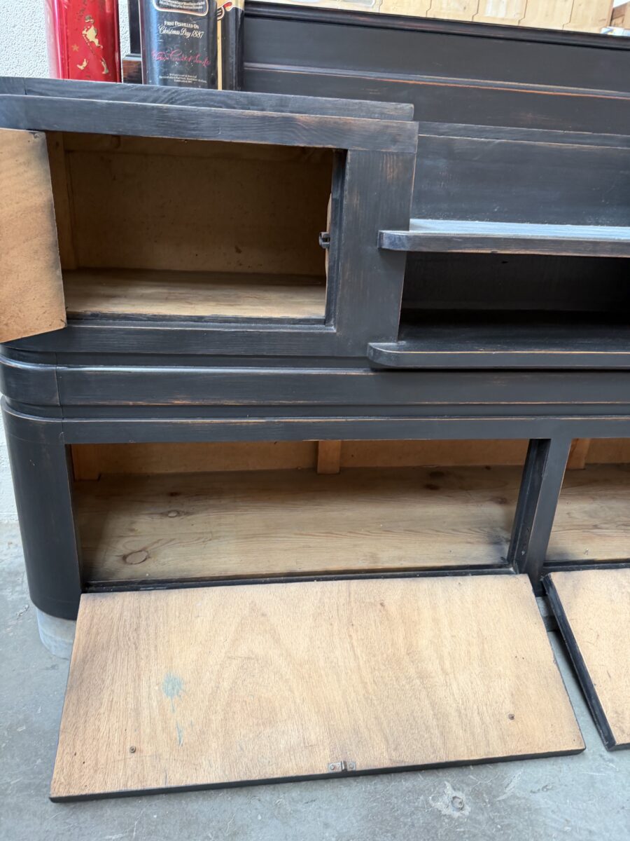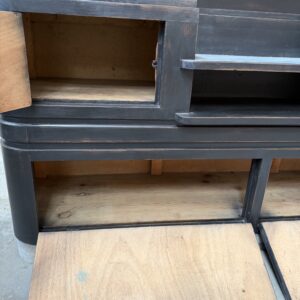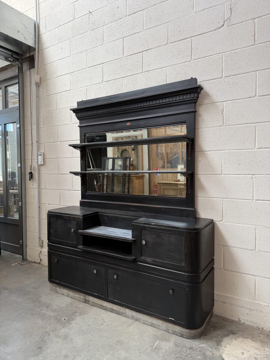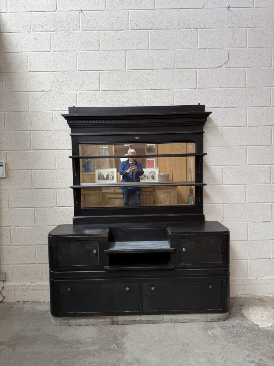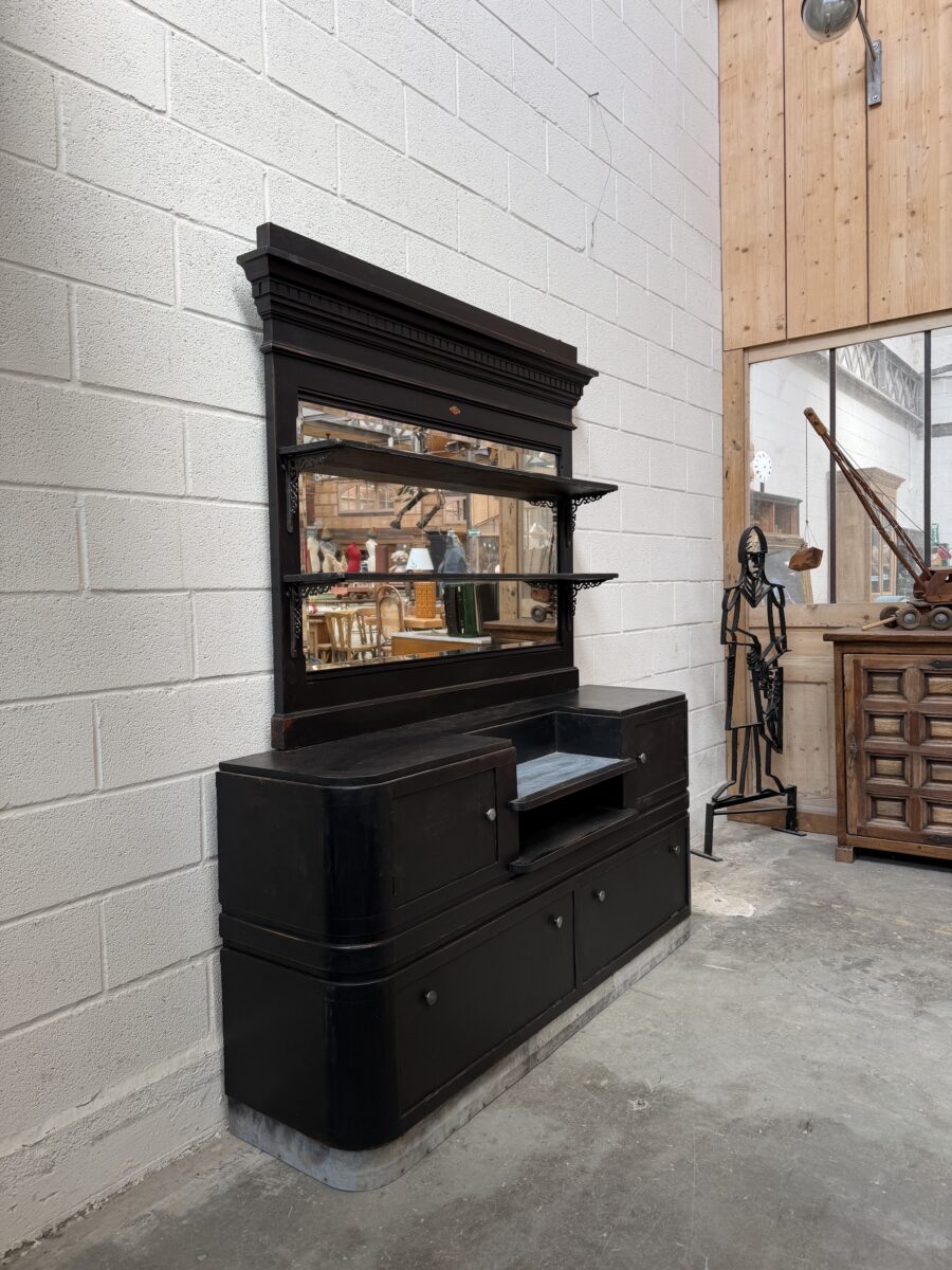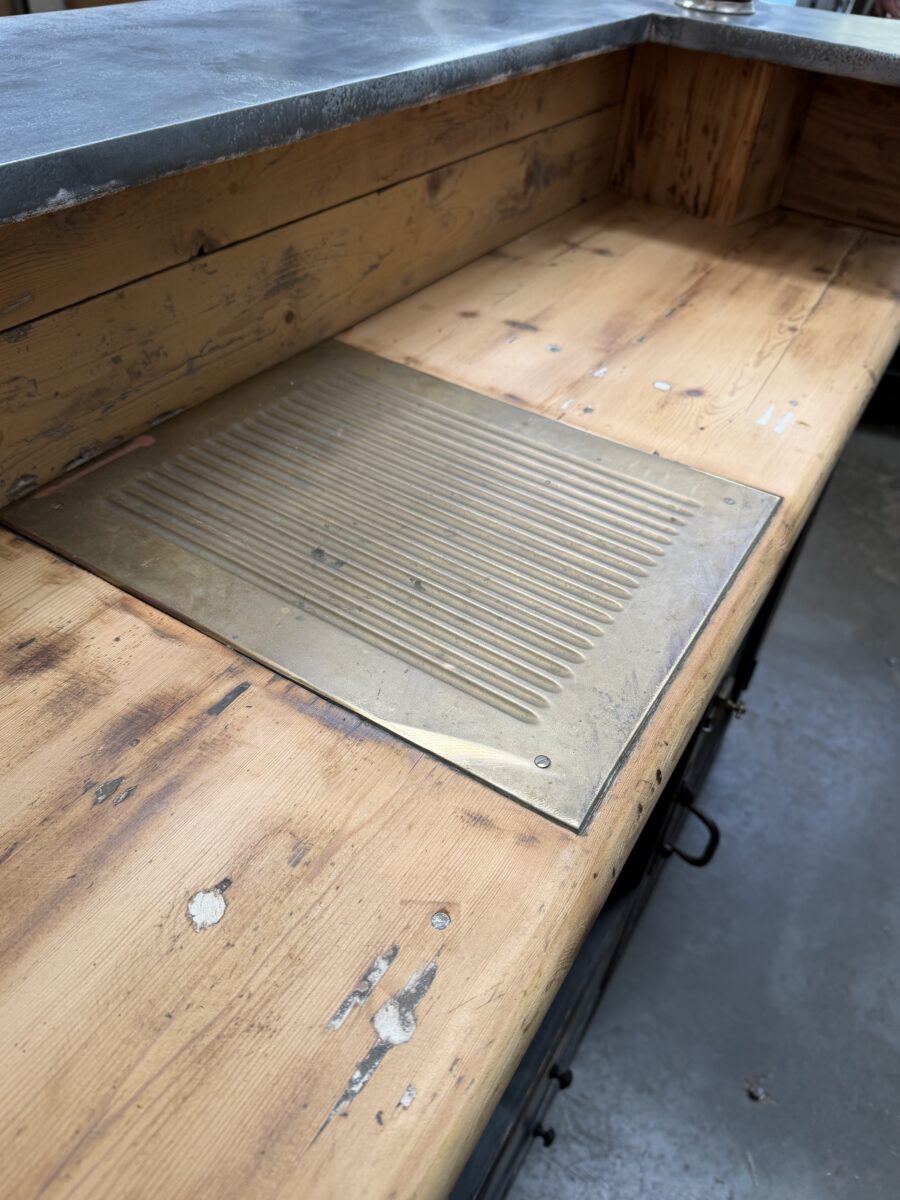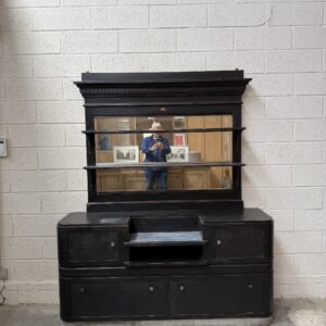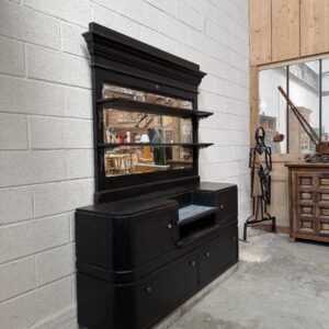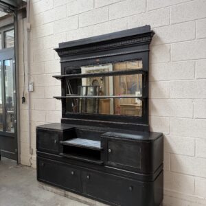 Il se compose d’un comptoir de bar patiné noir, son plateau est en zinc, doté d’une pompe à bière, et son plan de travail est en bois brut. A l’arrière, il comprend 1 porte ouvrant sur une étagère, un grand espace de rangement ouvert, 4 tiroirs fonctionnels et une niche.