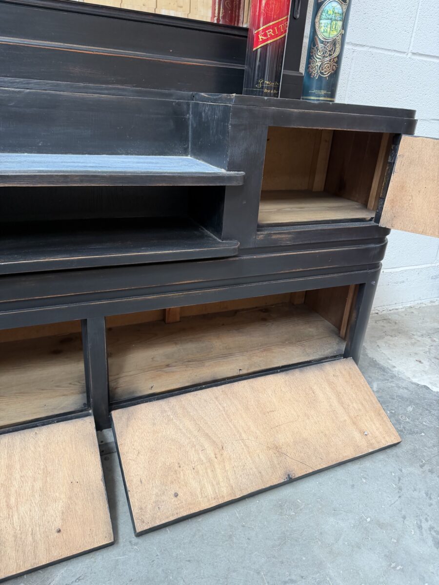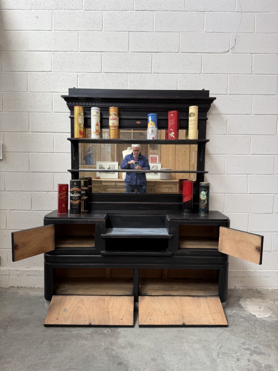 L’arrière de bar se compose d’un verrier disposant de 2 grandes étagères à verres et bouteilles au dessous duquel se trouve l’arrière de bar offrant également des rangements (2 portes, 2 clapets et 2 étagères dessus zinc)