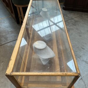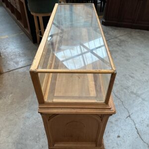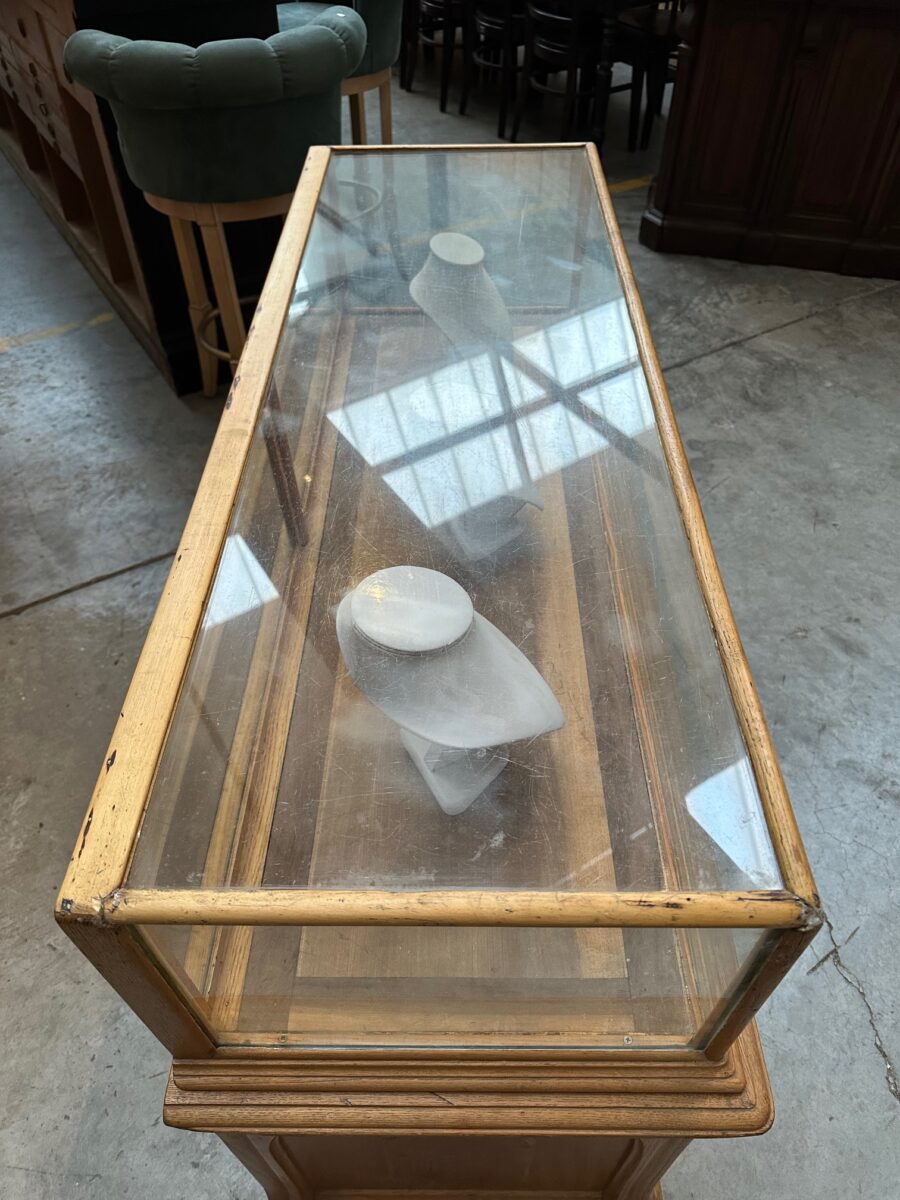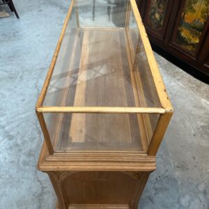 Il dispose d’une partie supérieure vitrée qui s’ouvre par l’arrière grâce à 2 clapets, eux mêmes dotés de miroirs. (permettant de mettre en valeurs les objets de la vitrine)