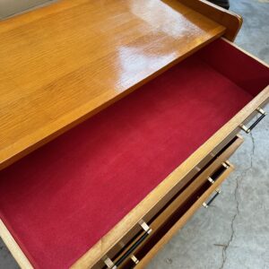 Elle dispose de 4 tiroirs parfaitement fonctionnels recouverts de leur feutrine rouge d’origine