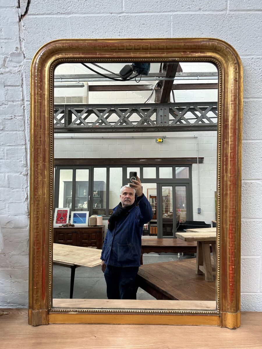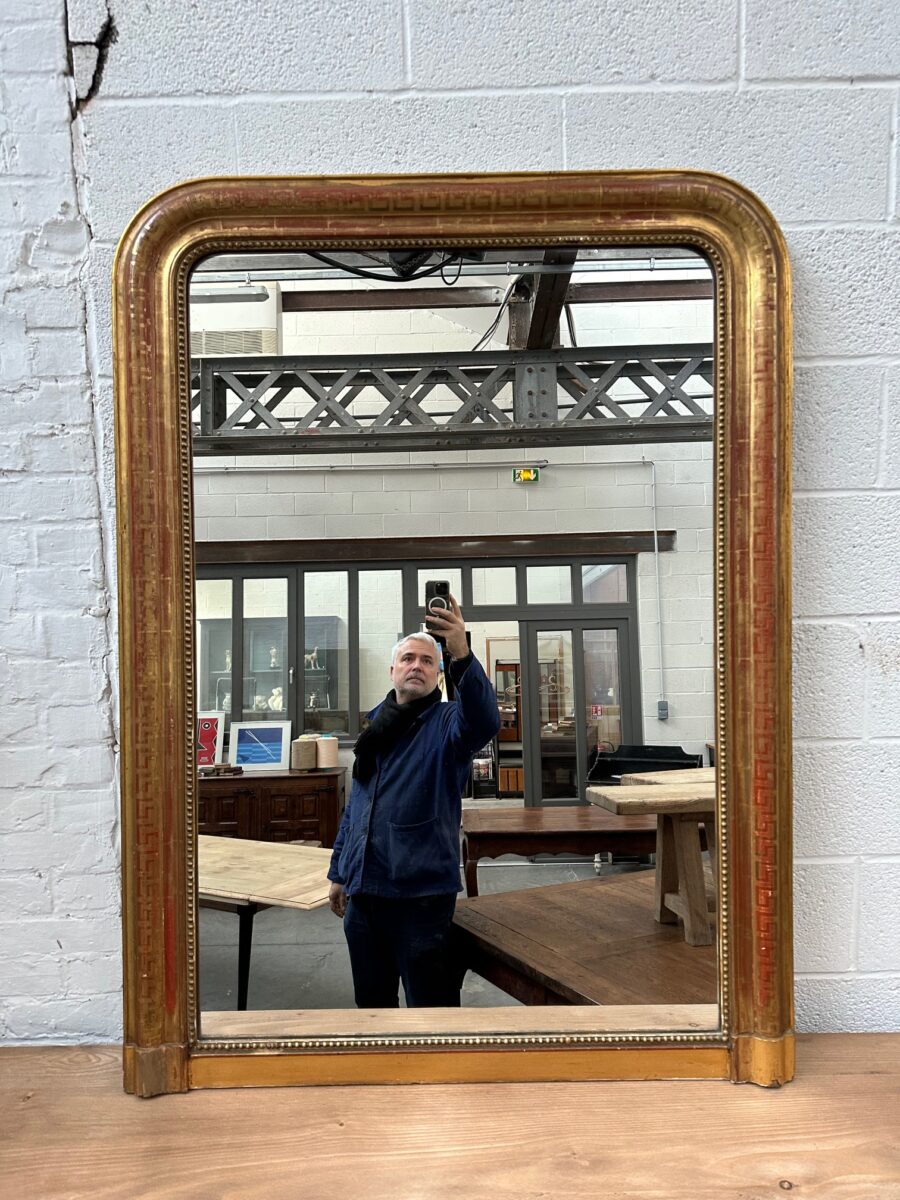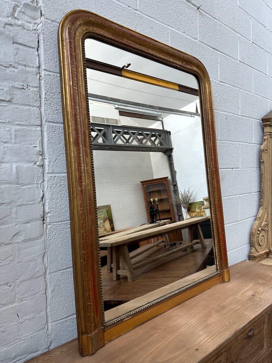 Grand miroir doré ancien doté d’une moulure décorée et perlée