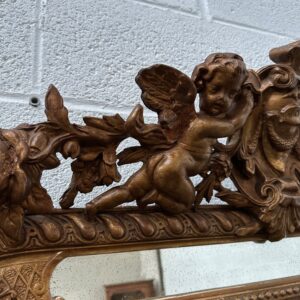 Son miroir biseauté est d’origine et est lui même entouré d’autres miroirs anciens décorés de motifs floraux .