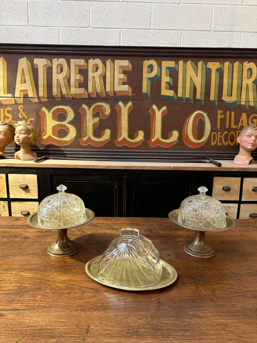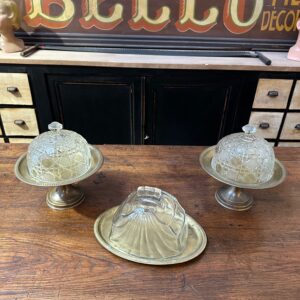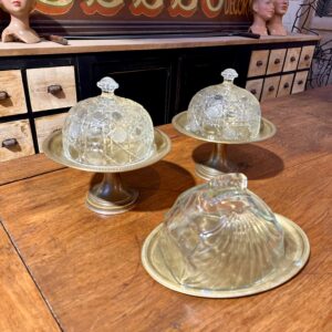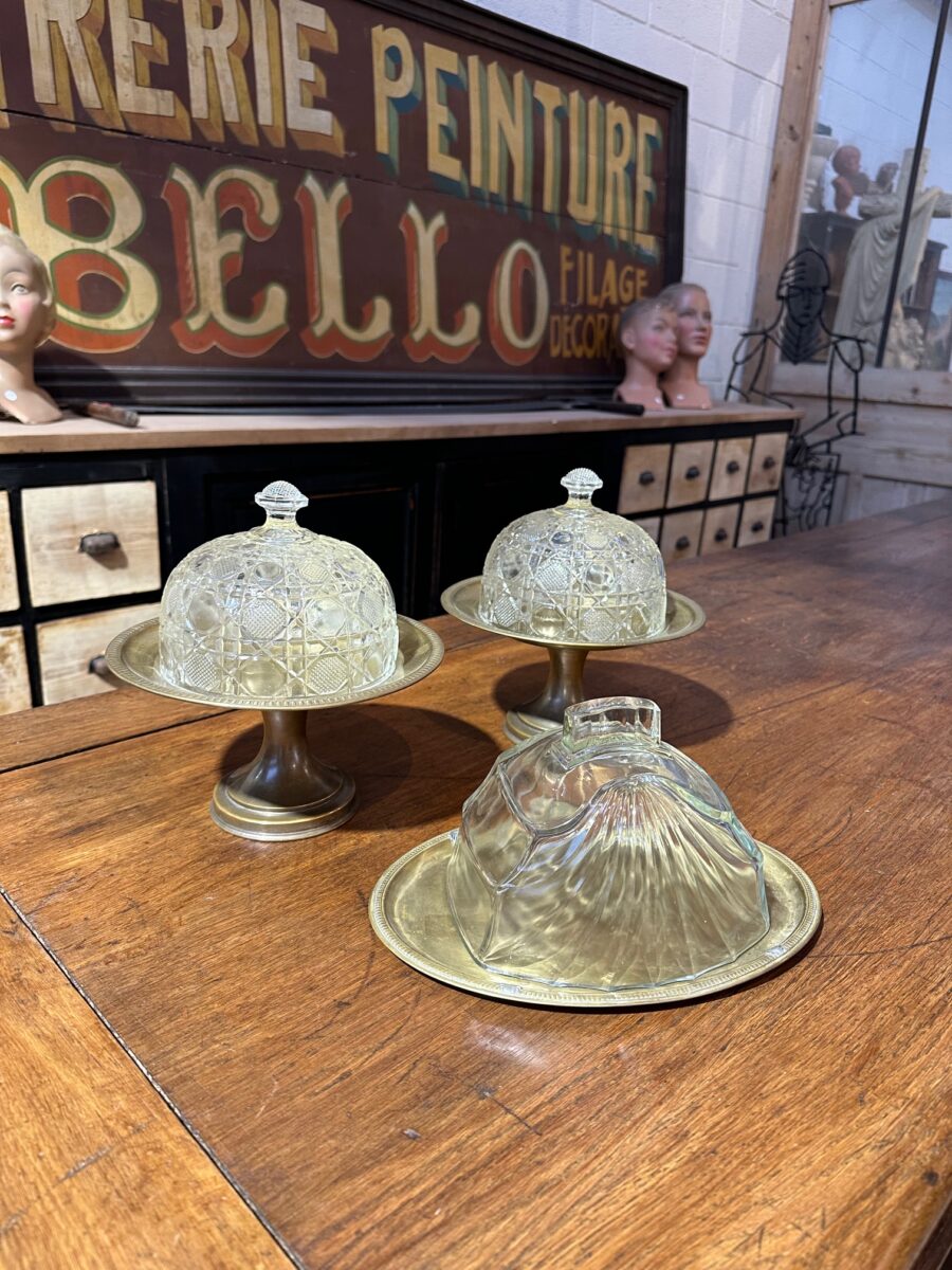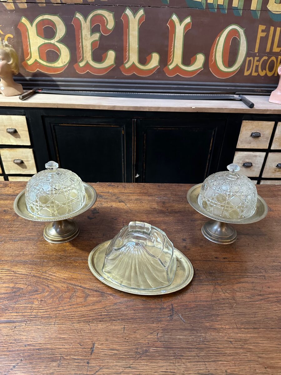 Série de 3 cloches anciennes en verre et leurs plateaux en métal argenté.