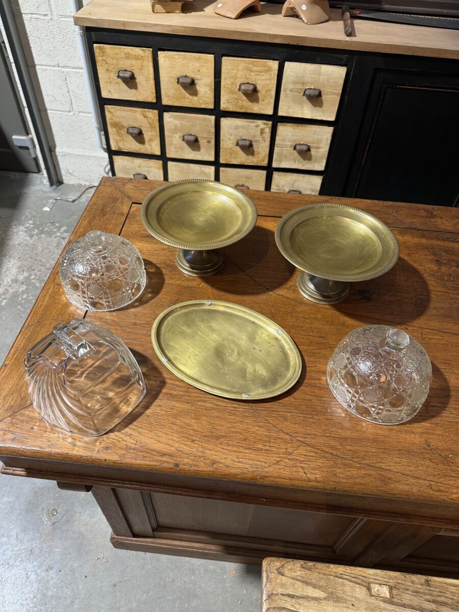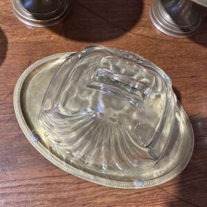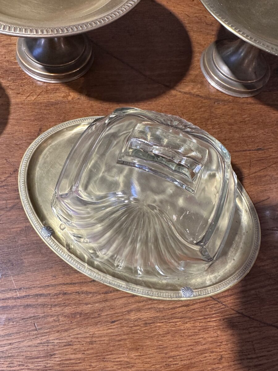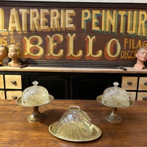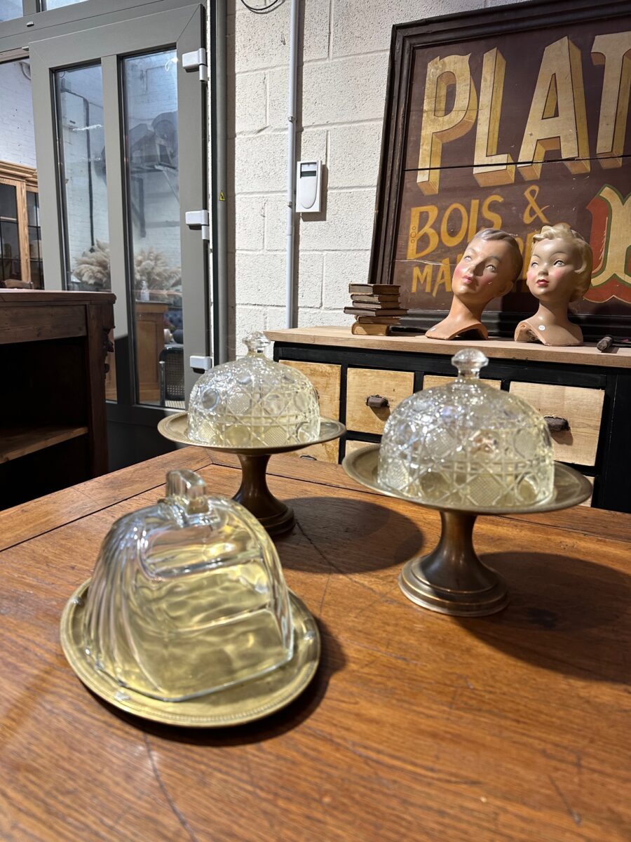 Série de 3 cloches anciennes en verre et leurs plateaux en métal argenté.
