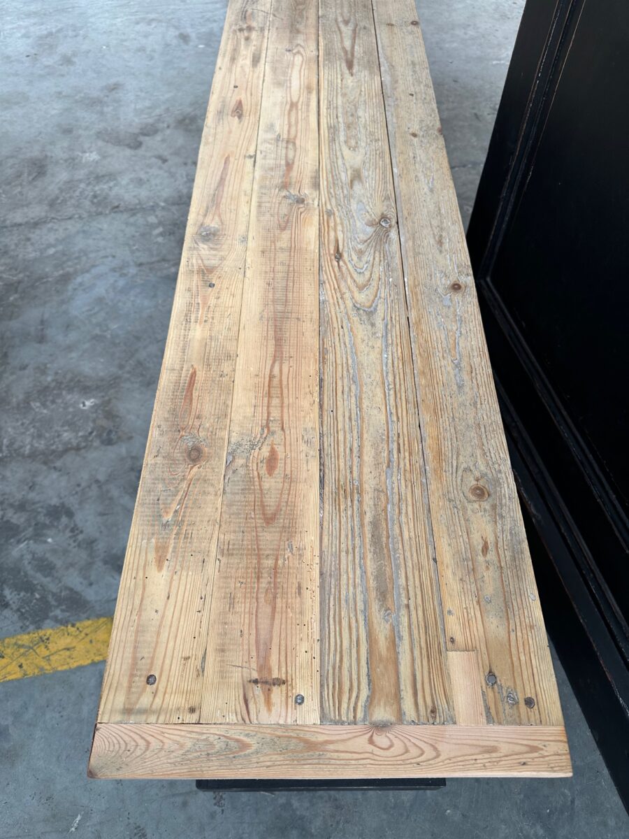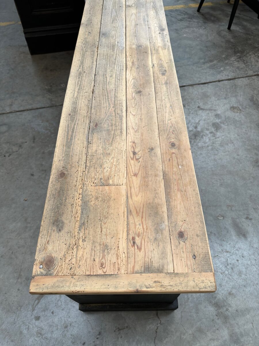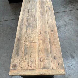Plateau en bois brut et corps de meuble platiné noir.