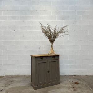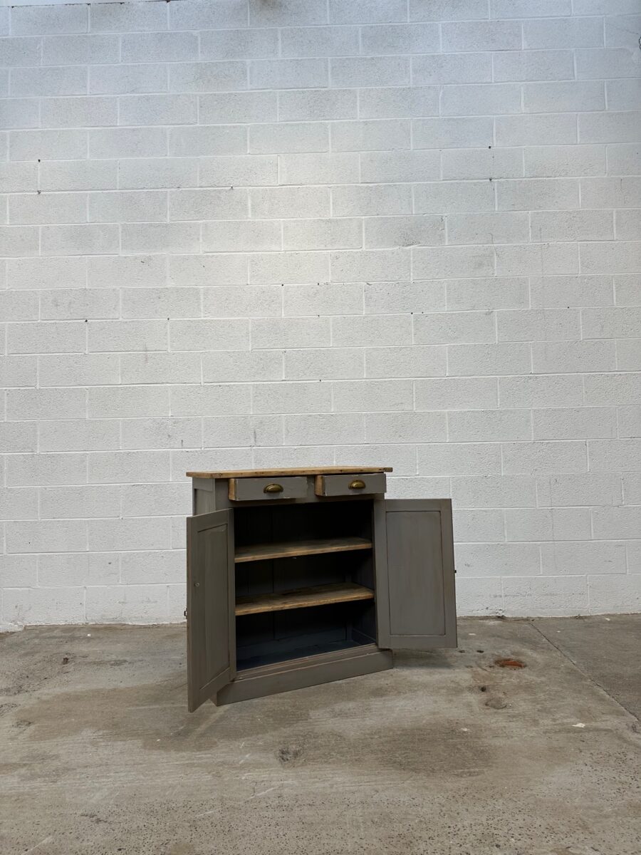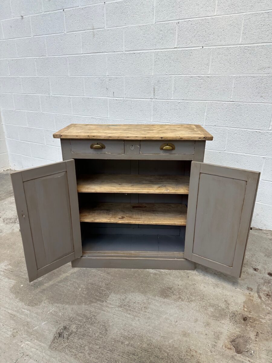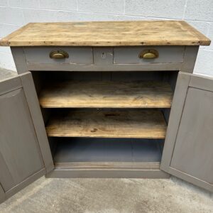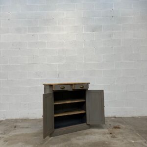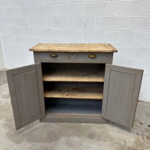 Il dispose de 2 tiroirs fonctionnels dotés de poignées coquilles et de 2 portes ouvrant sur 2 étagères en bois brut.