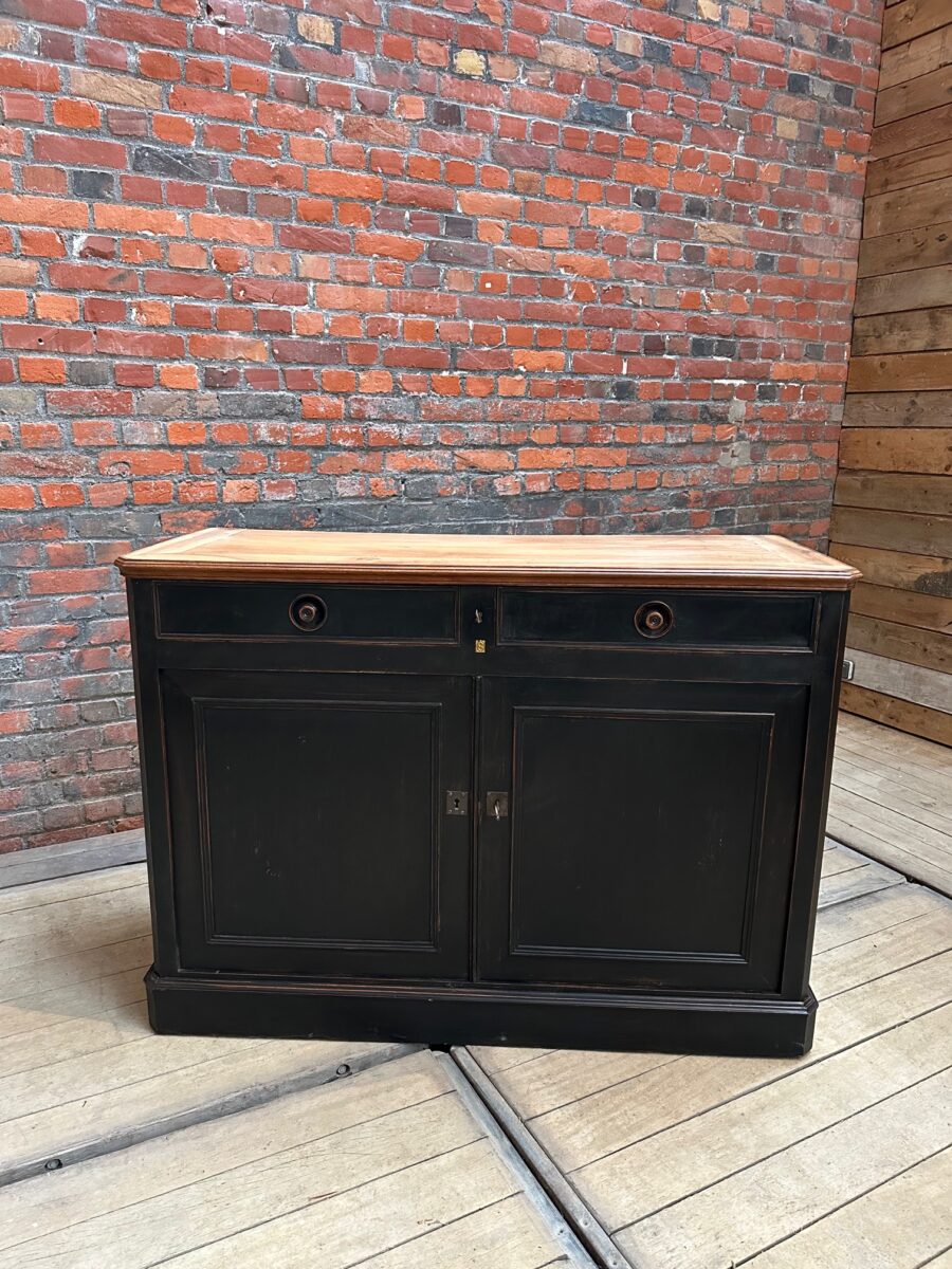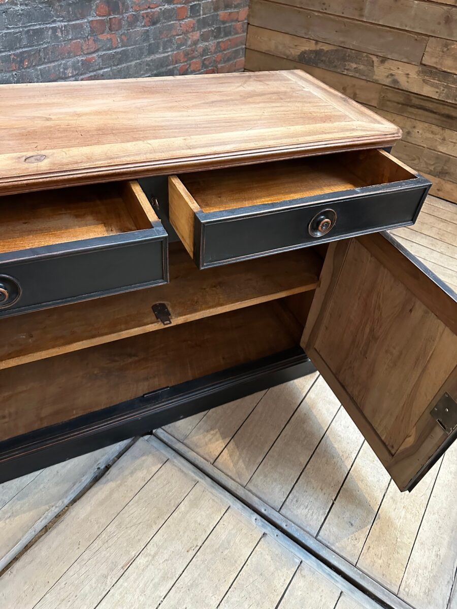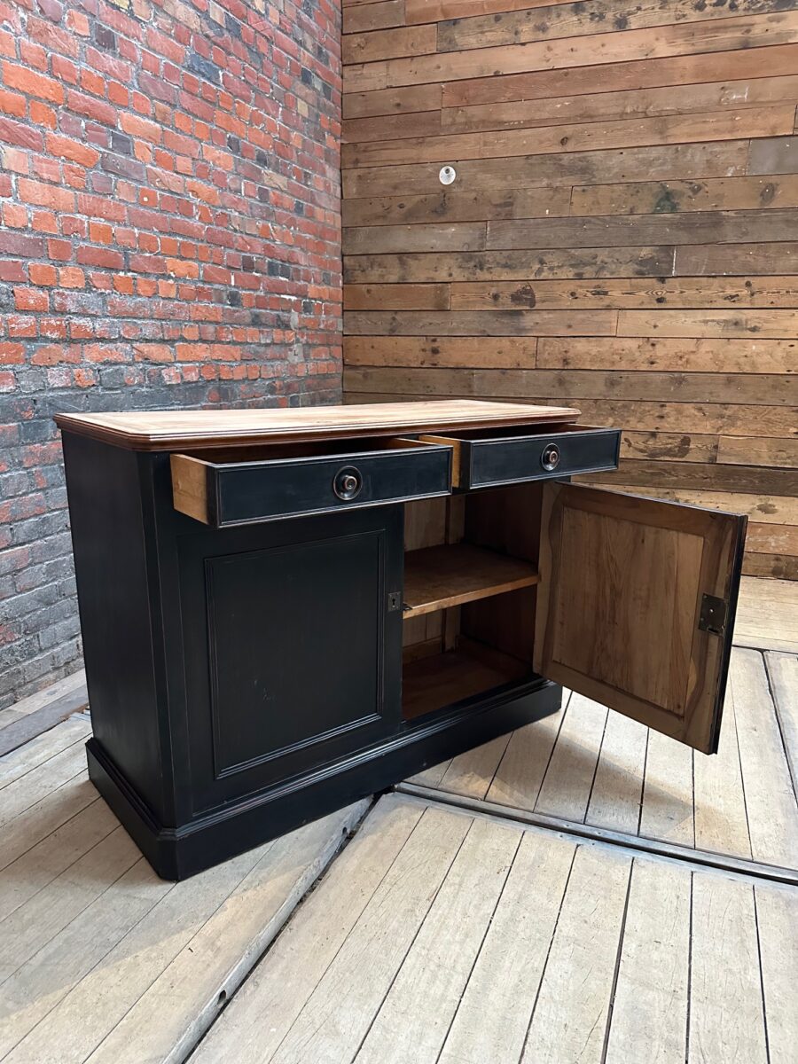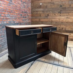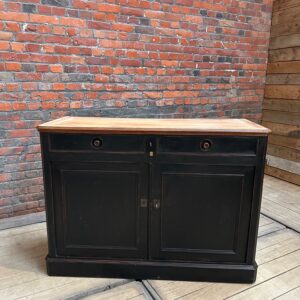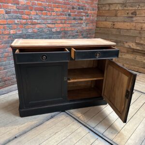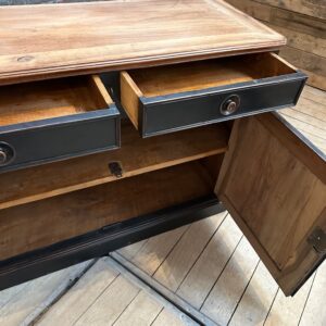 Il dispose d’un plateau en bois brut, de 2 tiroirs fonctionnels et de 2 portes fermant à clef et ouvrant sur une étagère