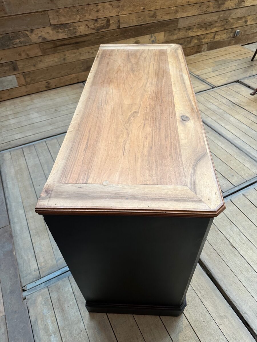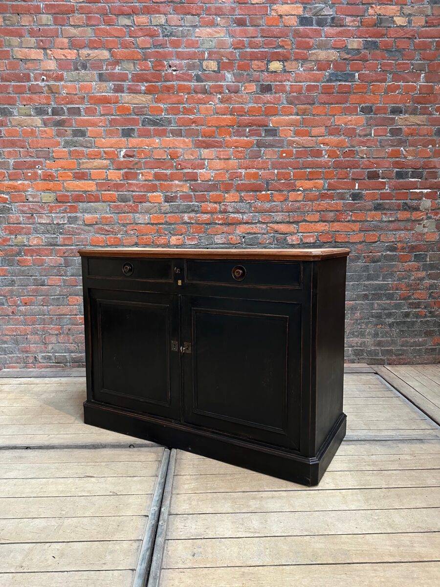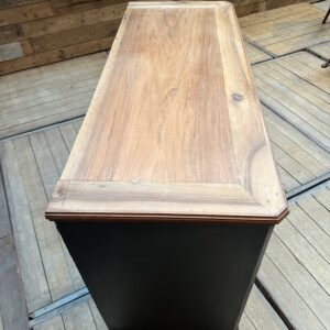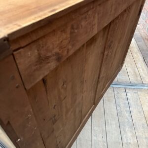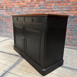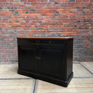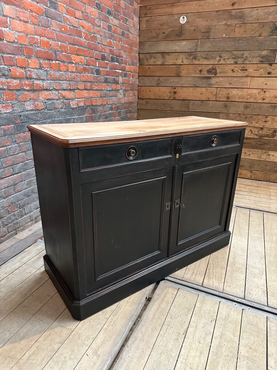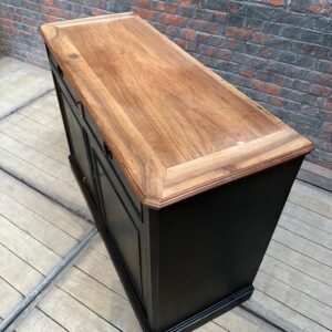 Il dispose d’un plateau en bois brut, de 2 tiroirs fonctionnels et de 2 portes fermant à clef et ouvrant sur une étagère