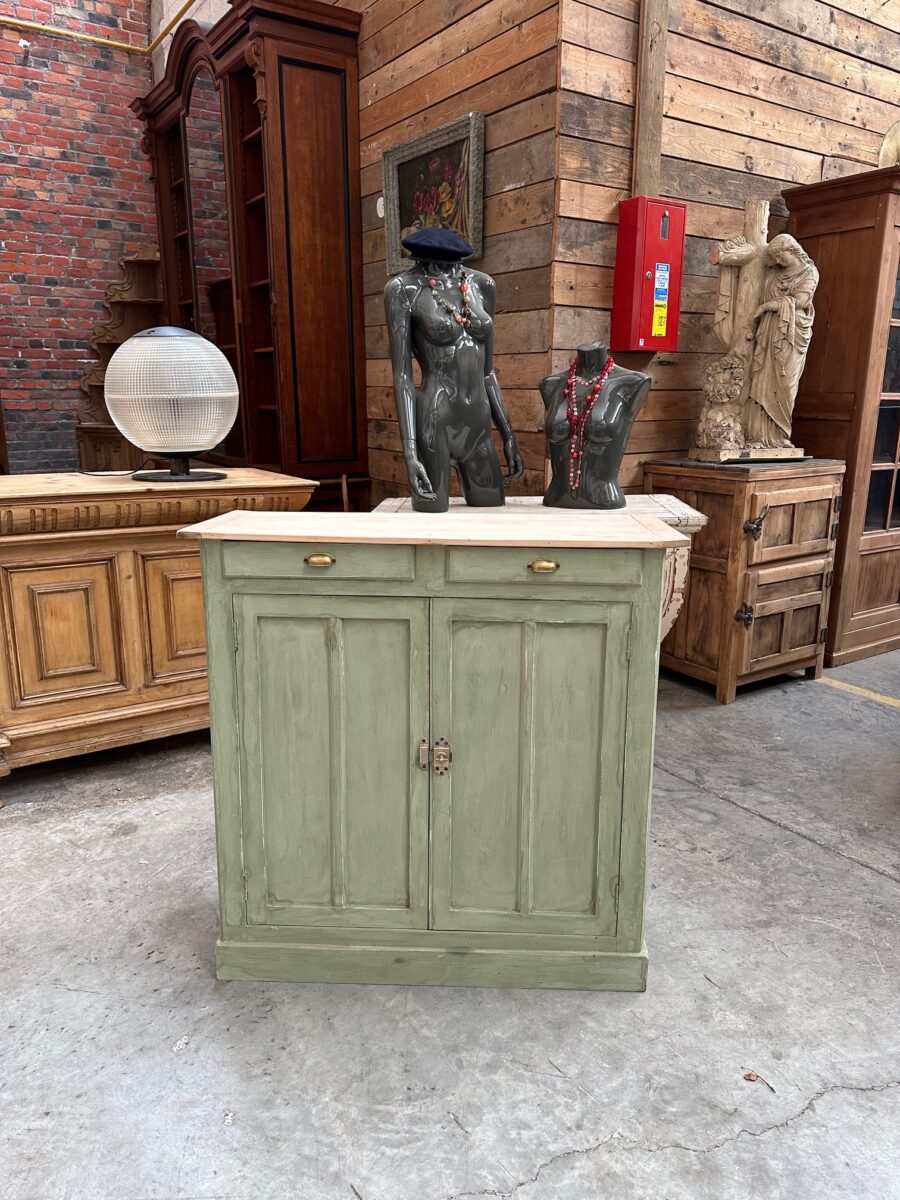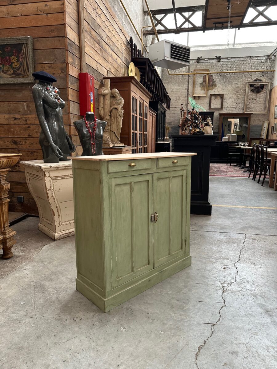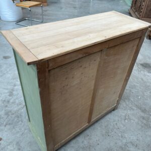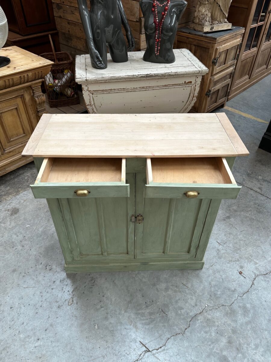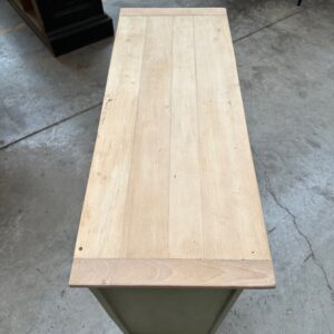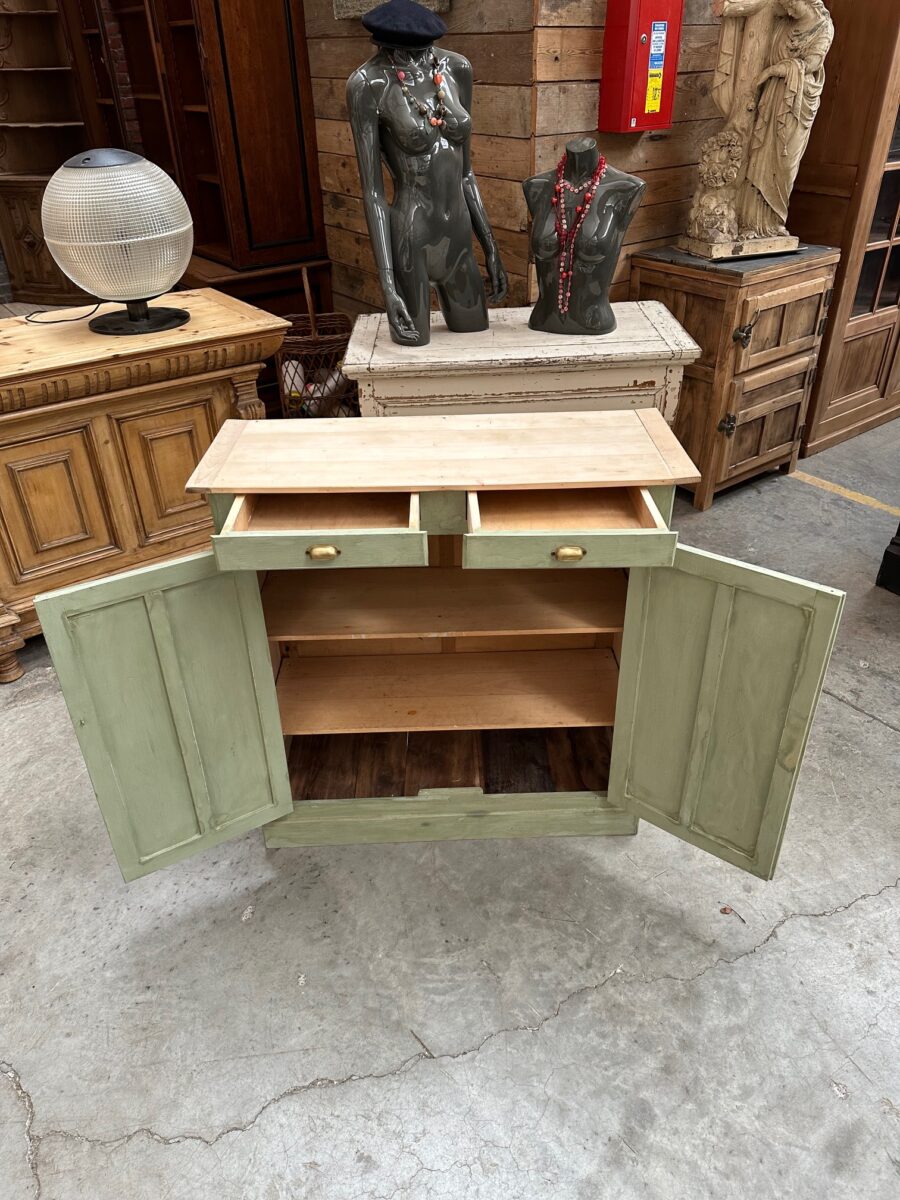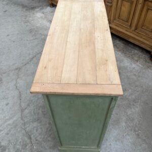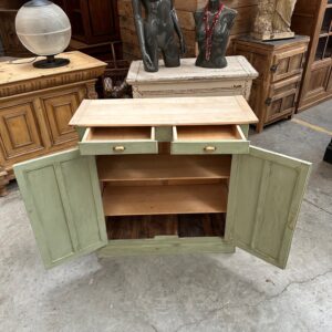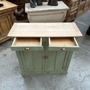 Il se compose d’un plateau en bois brut et d’un corps de meuble patiné vert.