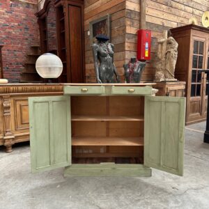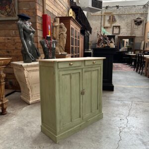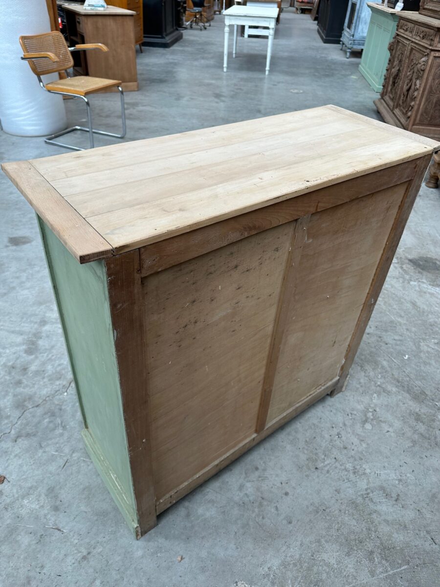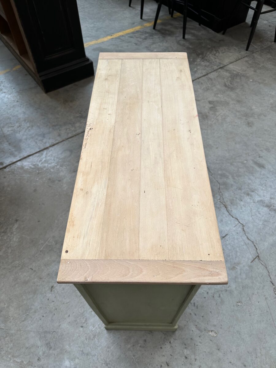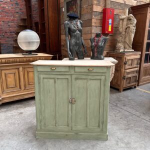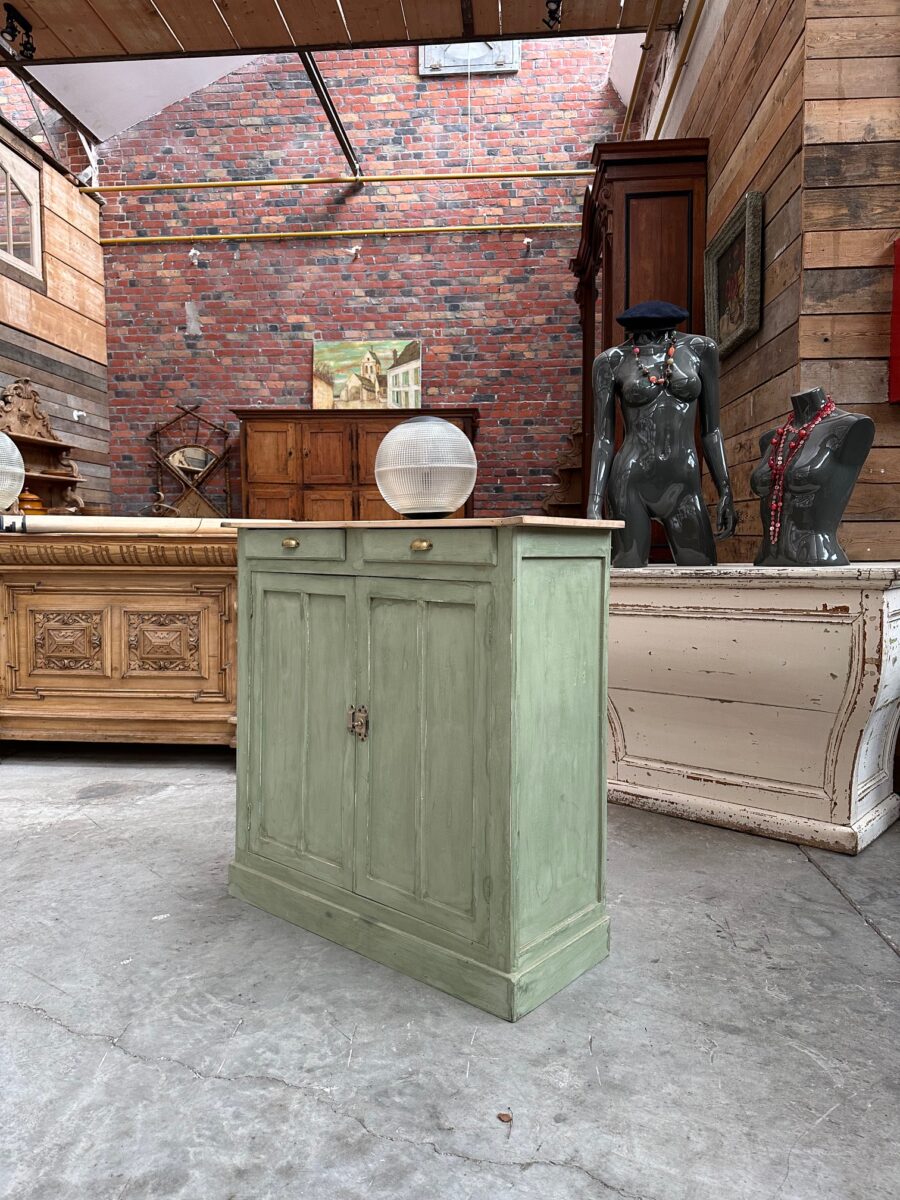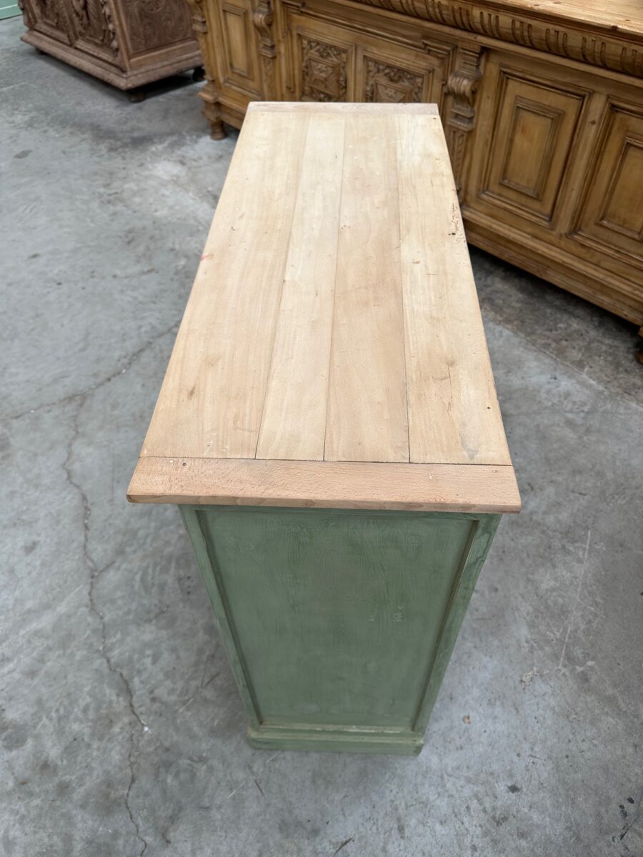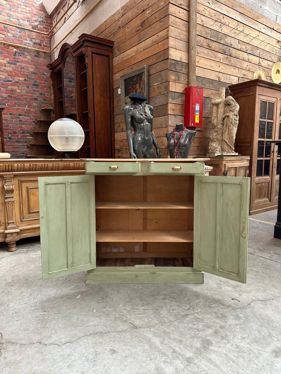 Il se compose d’un plateau en bois brut et d’un corps de meuble patiné vert.