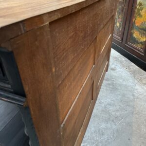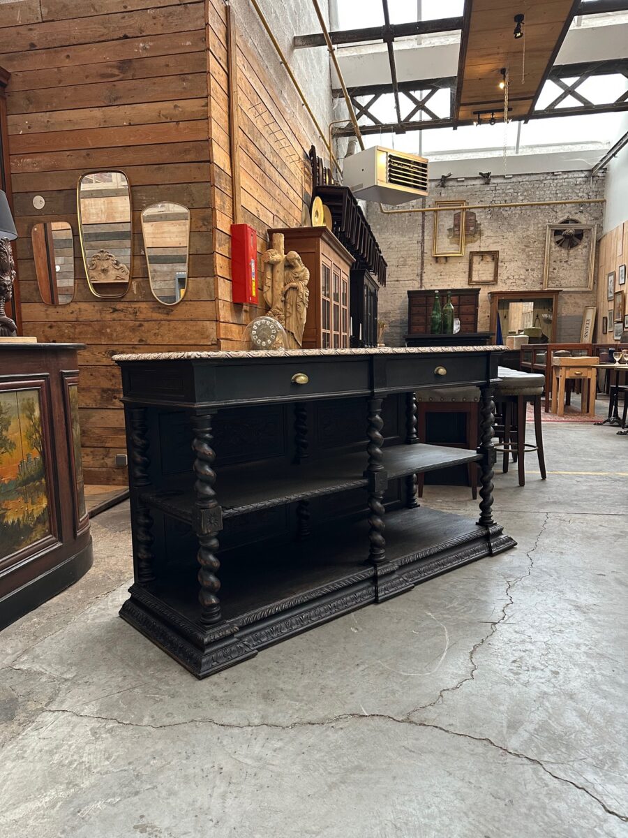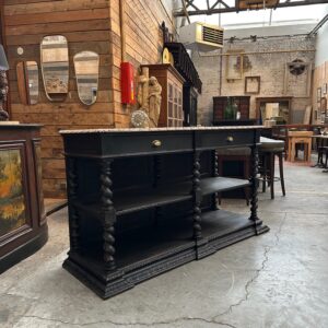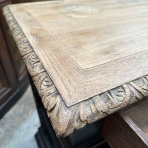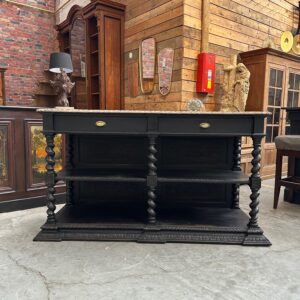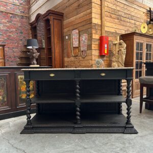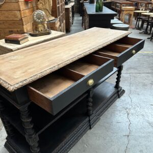 Elle dispose d’un magnifique plateau en chêne brut dont le contour est sculpté et d’un corps patiné noir doté de 2 grands tiroirs fonctionnels et de 2 tablettes d’exposition. Sa façade est ornée de colonnes torsadées et son socle est également sculpté.
