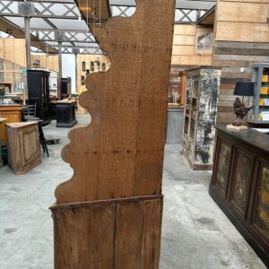 Elle se compose d’une partie haute disposant de 4 étagères de dimensions différentes et d’une partie basse dotée de 2 portes en bois sculpté de motifs géométriques et animaliers, fermant à clef et ouvrant sur 2 étagères.