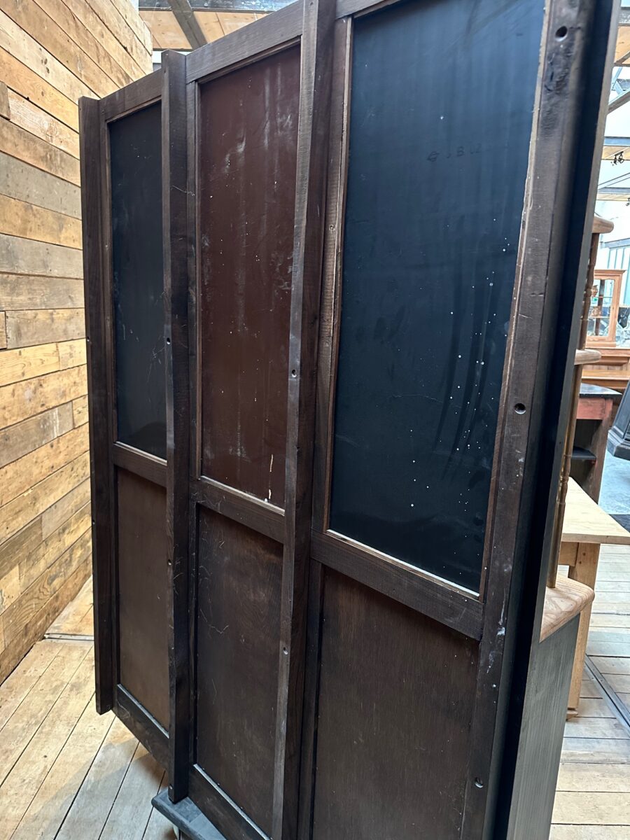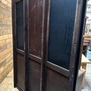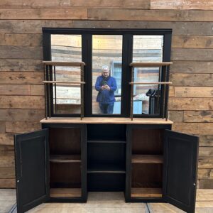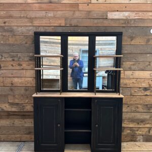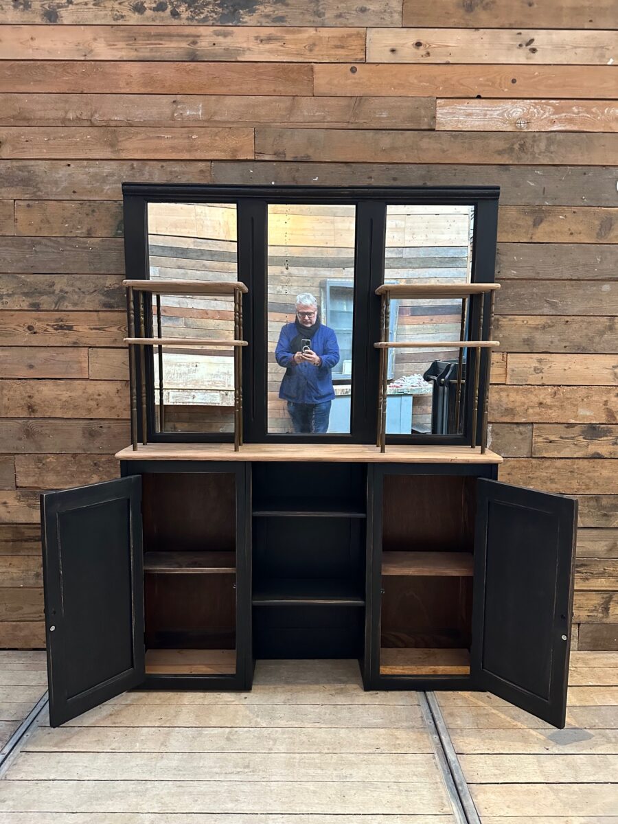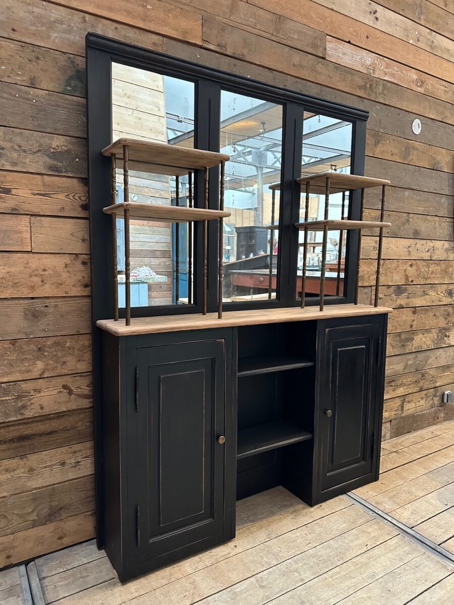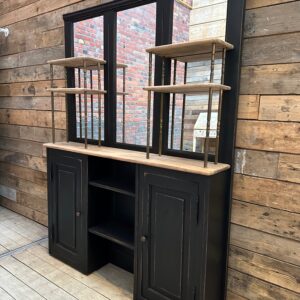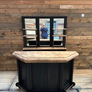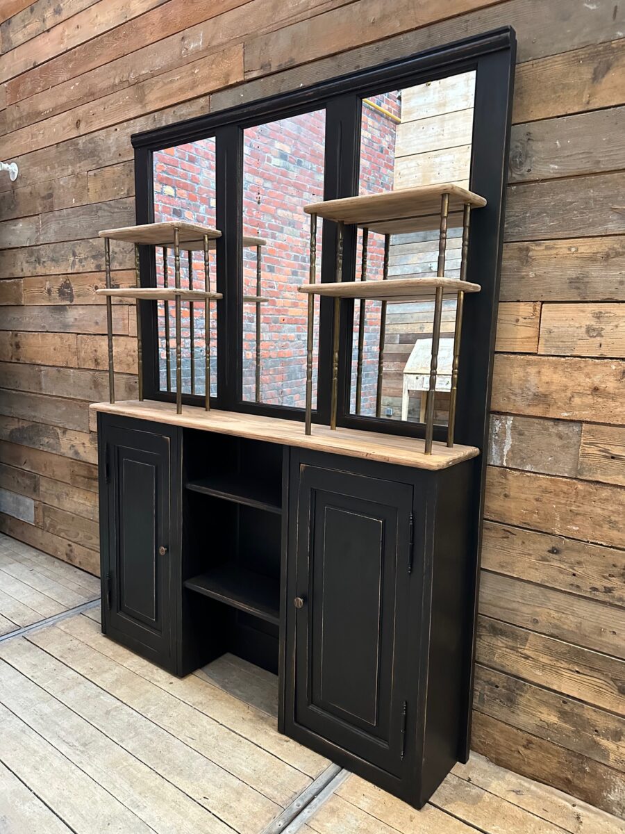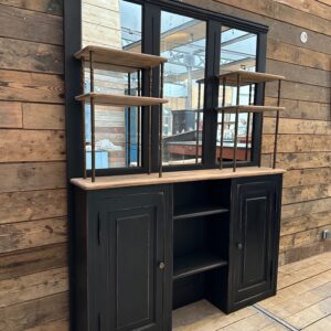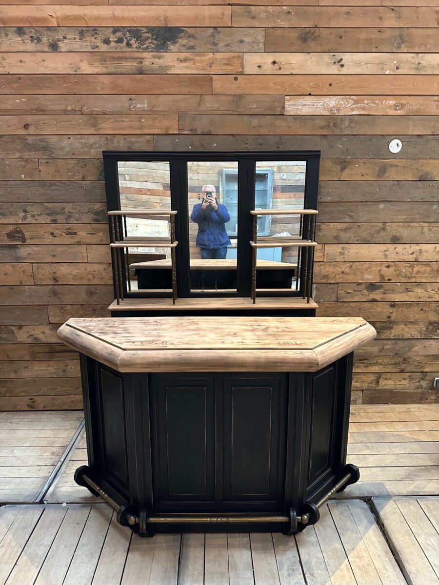L’arrière de bar comprend 3 miroirs et 2 étagères à verres dans sa partie haute et des espaces de rangement dans sa partie basse (2 portes ouvrant sur une étagère et 3 étagères ouvertes). Il associe également la patine noire et le bois brut .