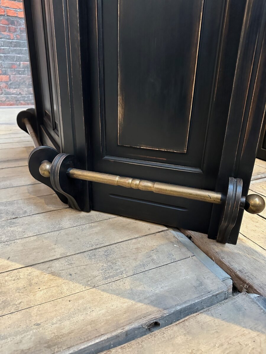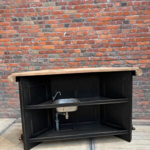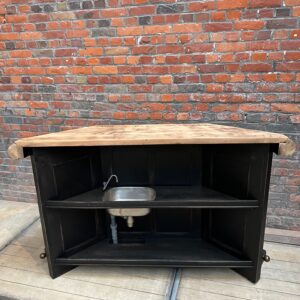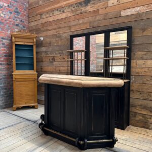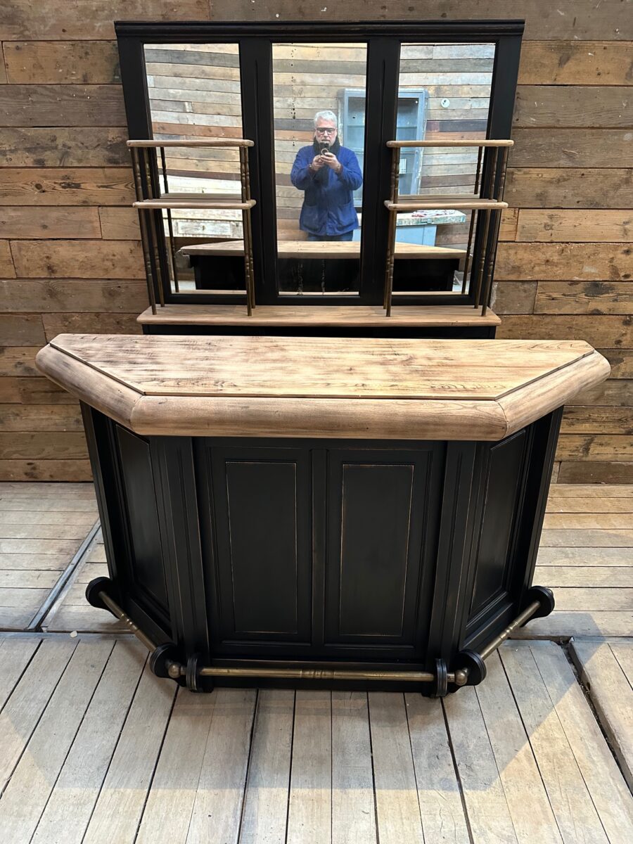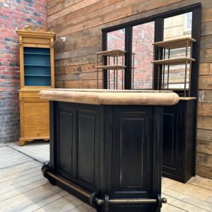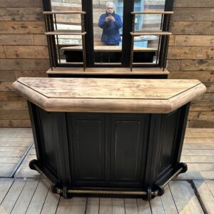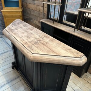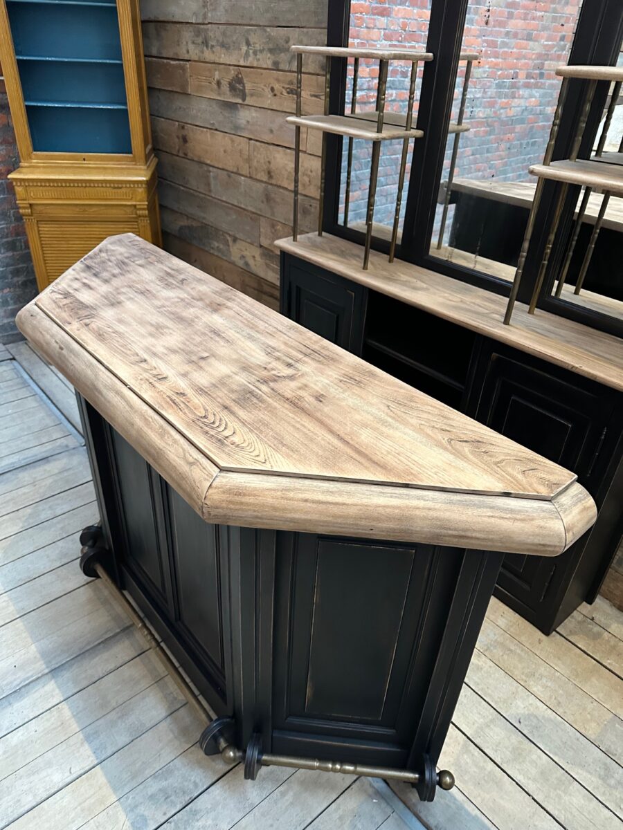 Il se compose d’un bar dont le corps est patiné noir et le plateau en bois brut. Il dispose également de barres en laiton sur ses 3 faces avant . A l’arrière, il est doté de 2 grandes niches et d’un évier en zinc.