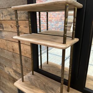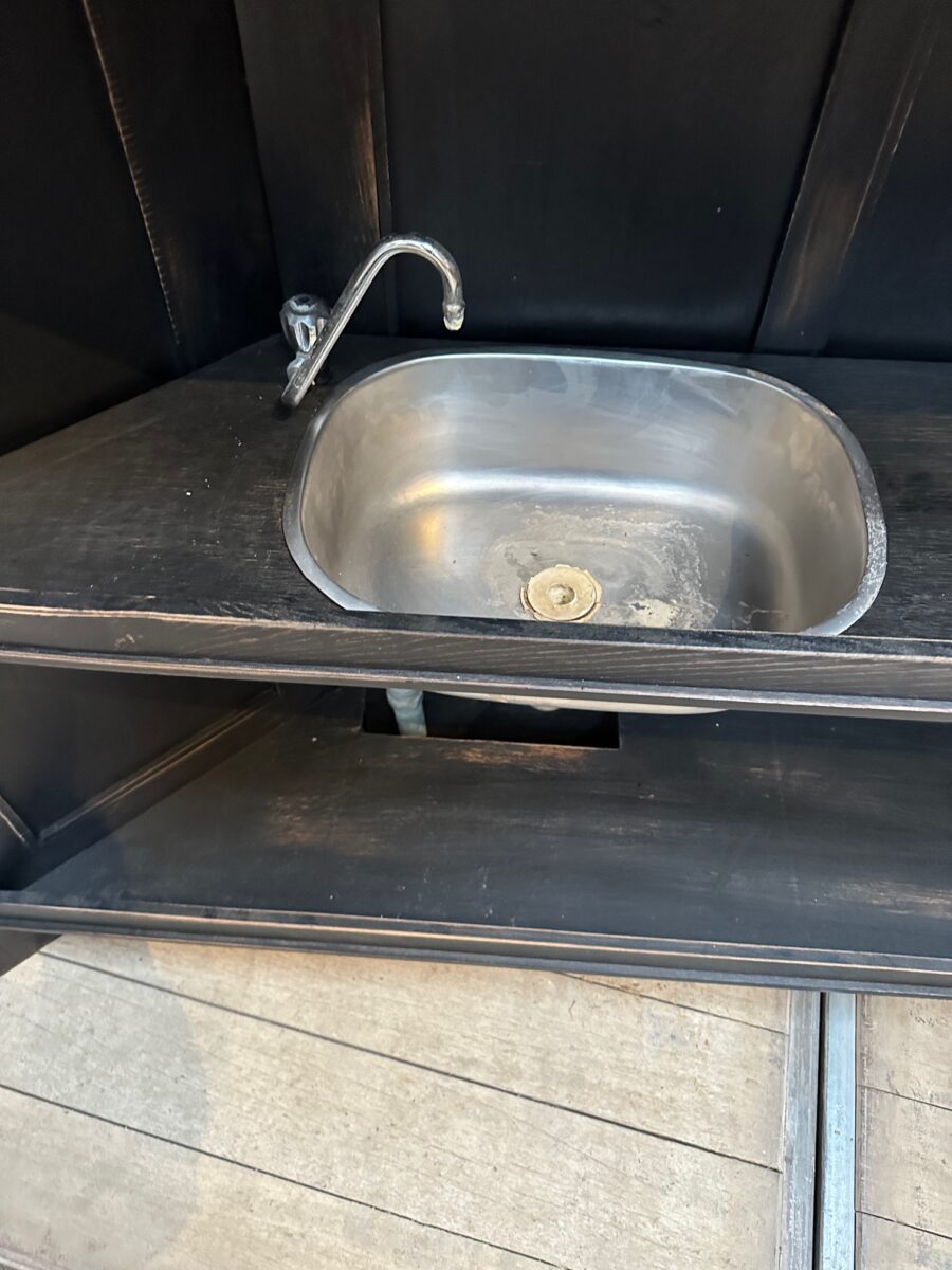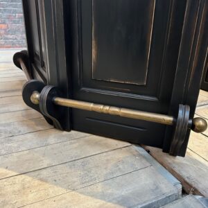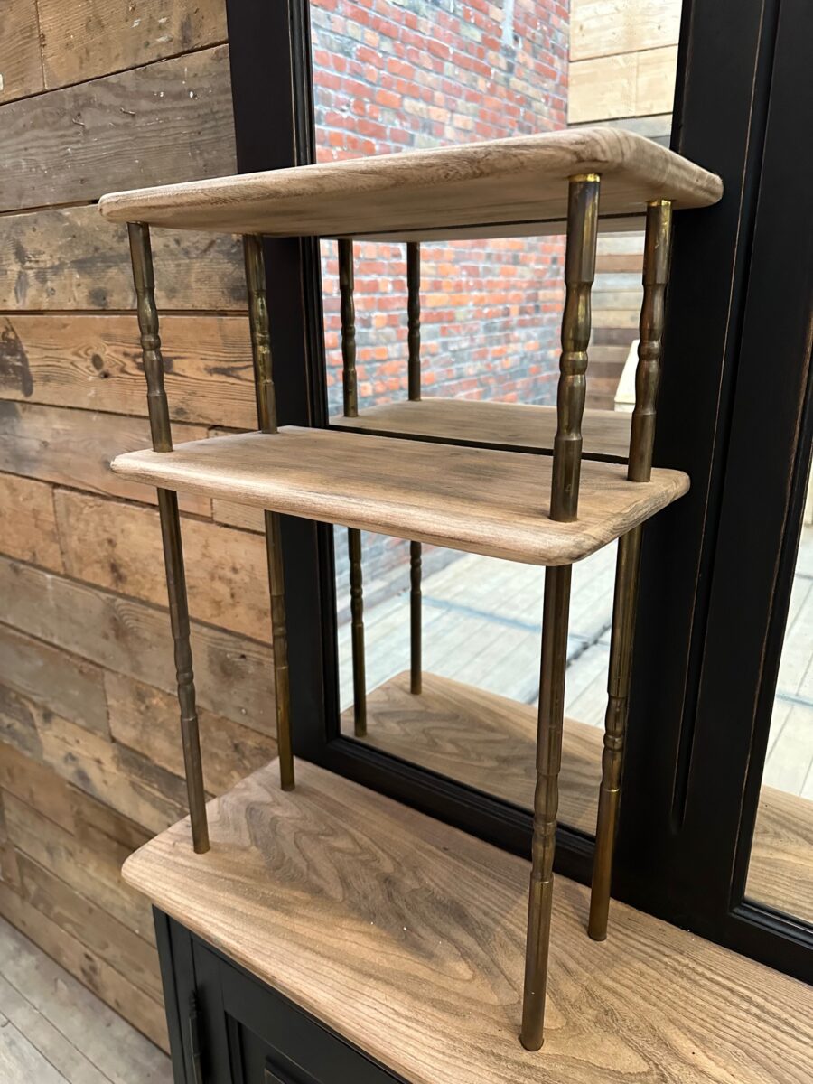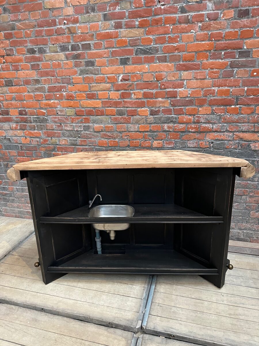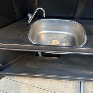 Il se compose d’un bar dont le corps est patiné noir et le plateau en bois brut. Il dispose également de barres en laiton sur ses 3 faces avant . A l’arrière, il est doté de 2 grandes niches et d’un évier en zinc.