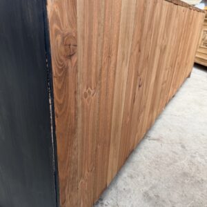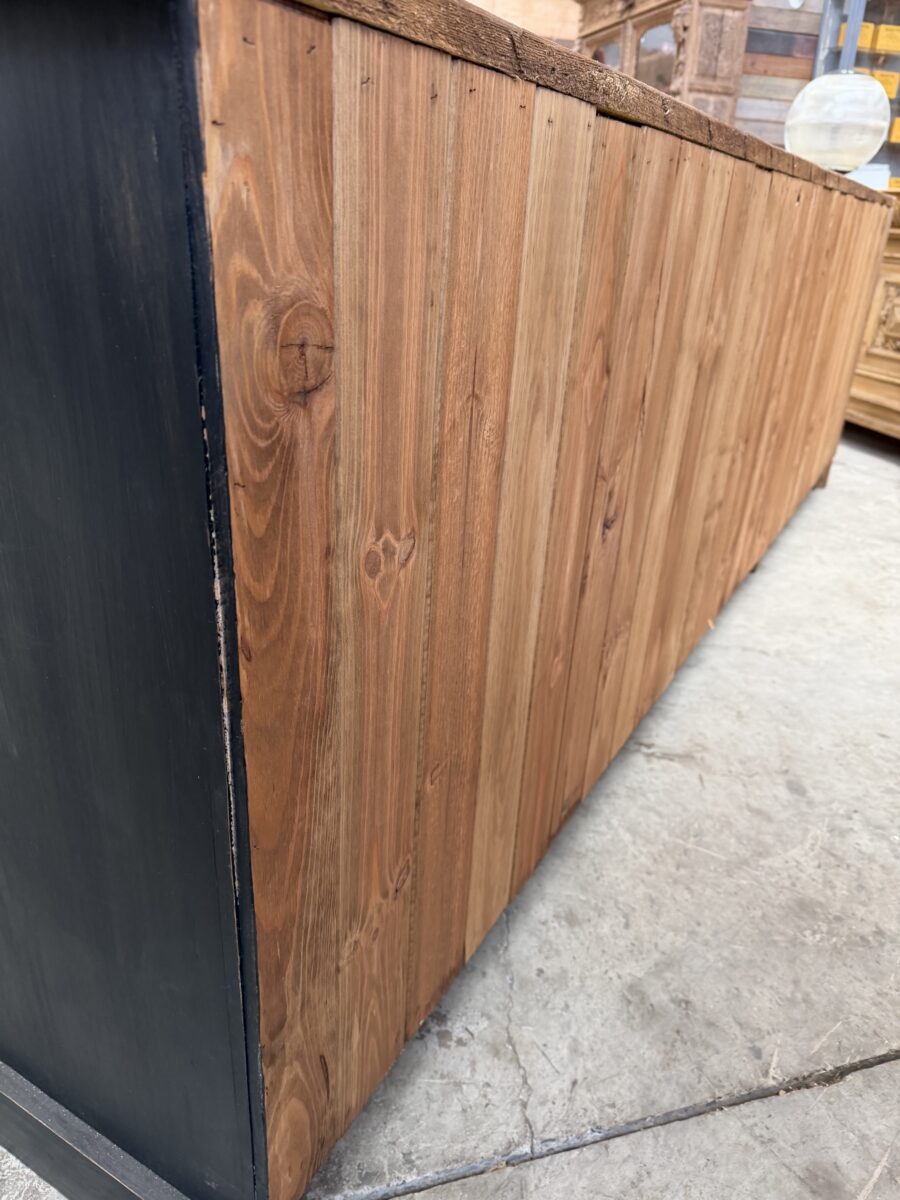 Il se compose d’un corps de meuble patiné noir et d’un plateau en bois brut.