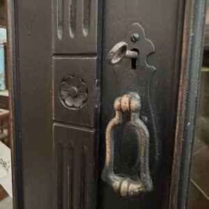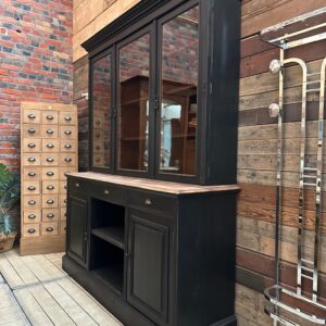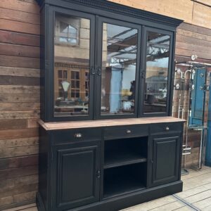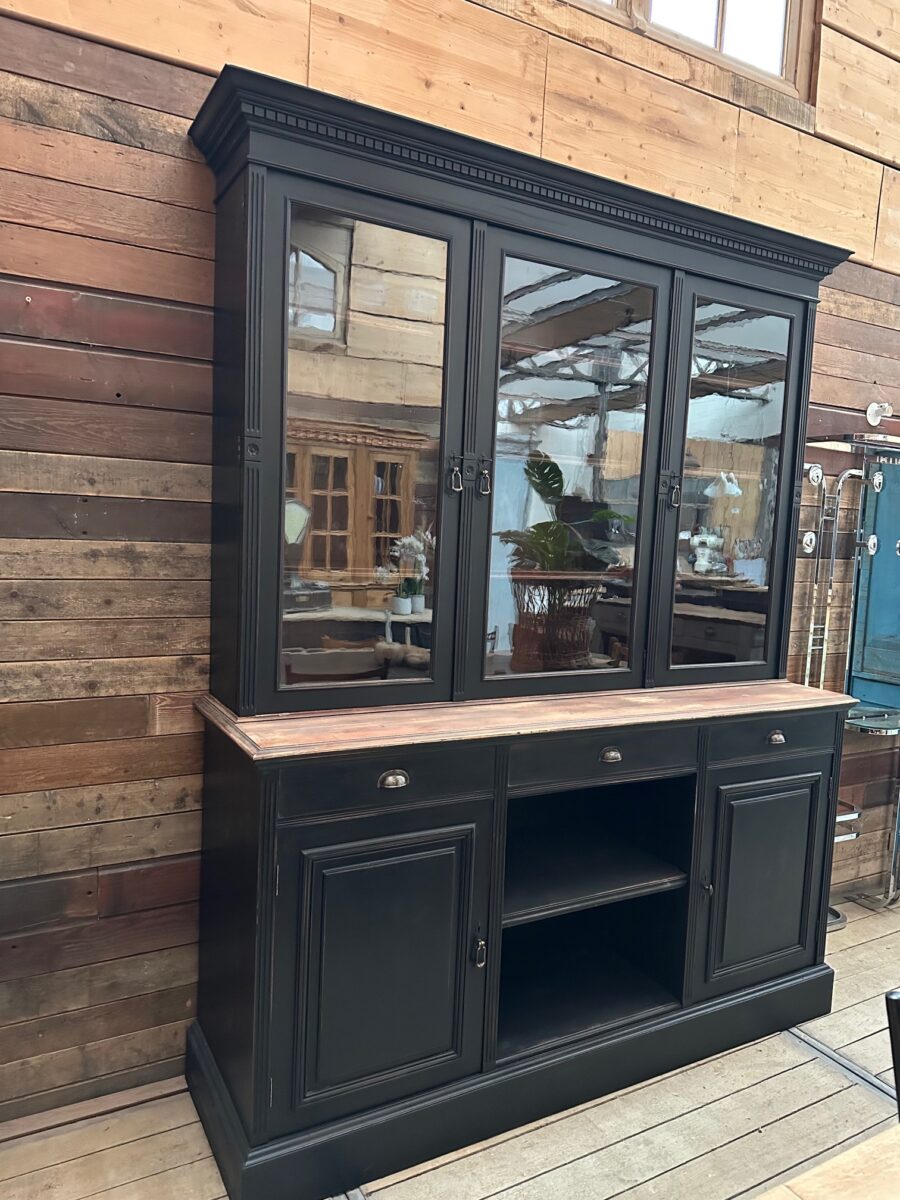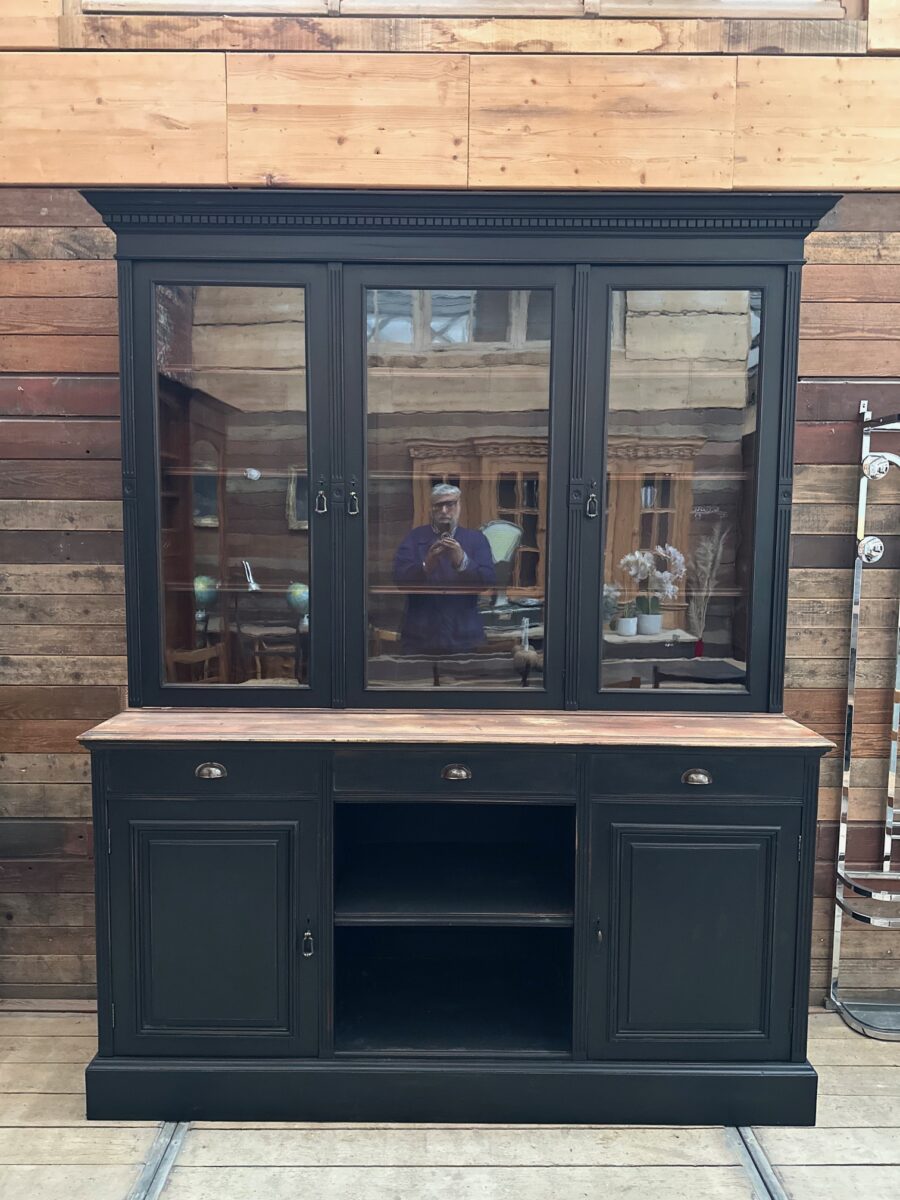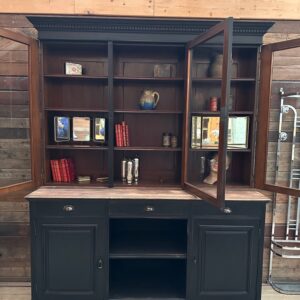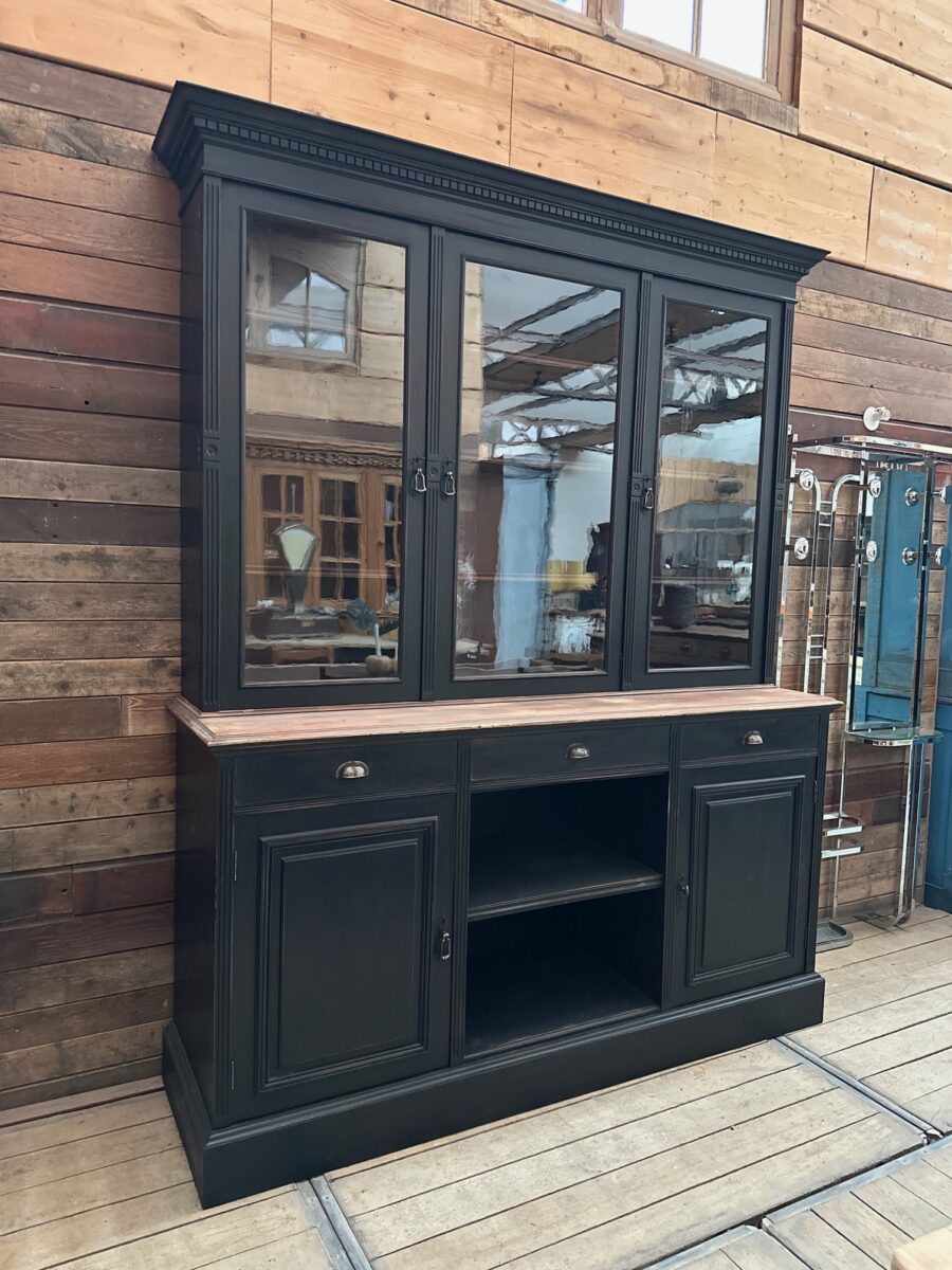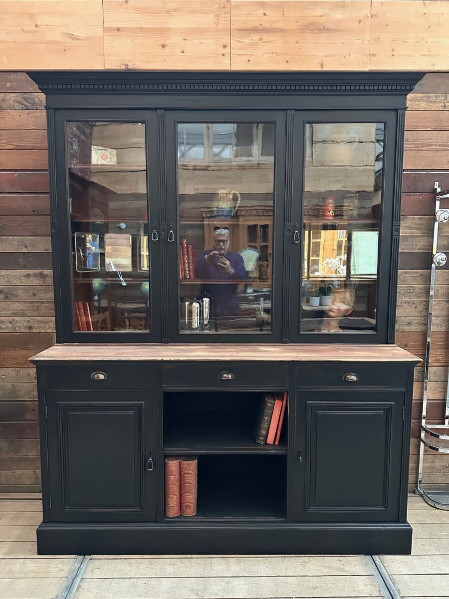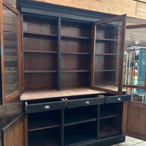 Elle se compose d’une partie haute disposant de 3 portes vitrées fermant à clef et ouvrant sur 3 étagères.