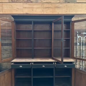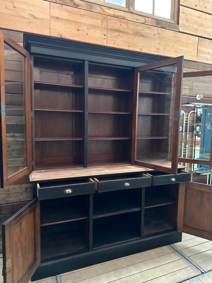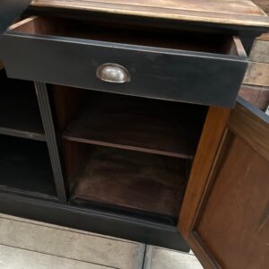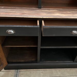 Sa partie basse est dotée de 3 tiroirs fonctionnels, de 2 portes pleines fermant à clef et de 2 niches ouvertes.