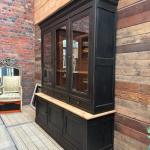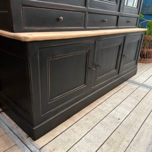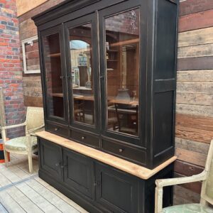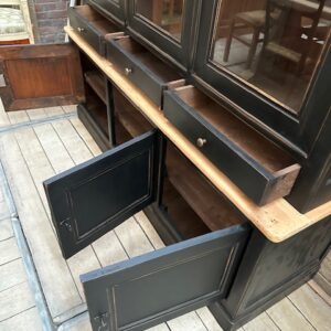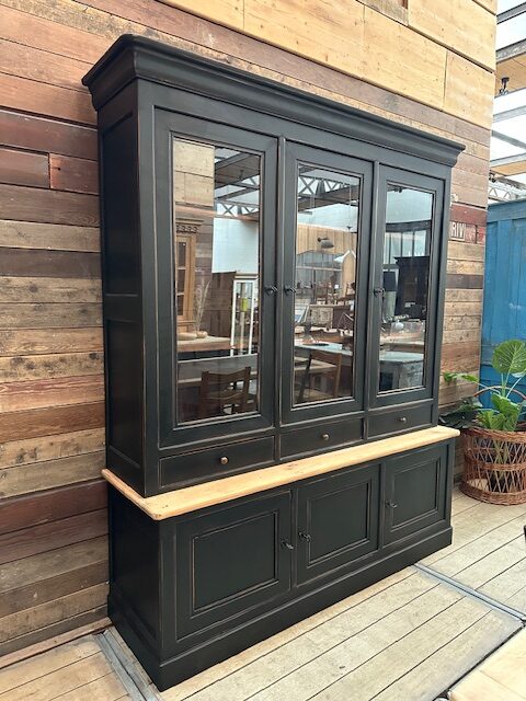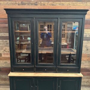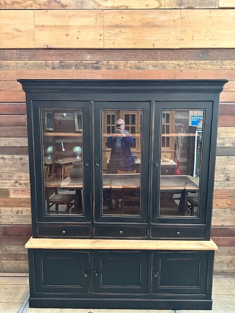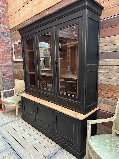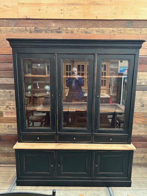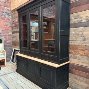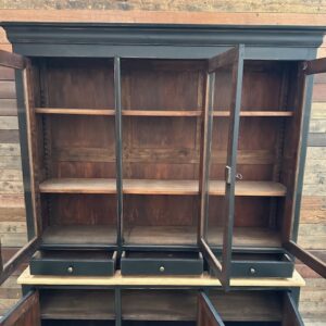Sa partie haute se compose de 3 portes vitrées fermant à clef et ouvrant sur des étagères et de 3 tiroirs fonctionnels.