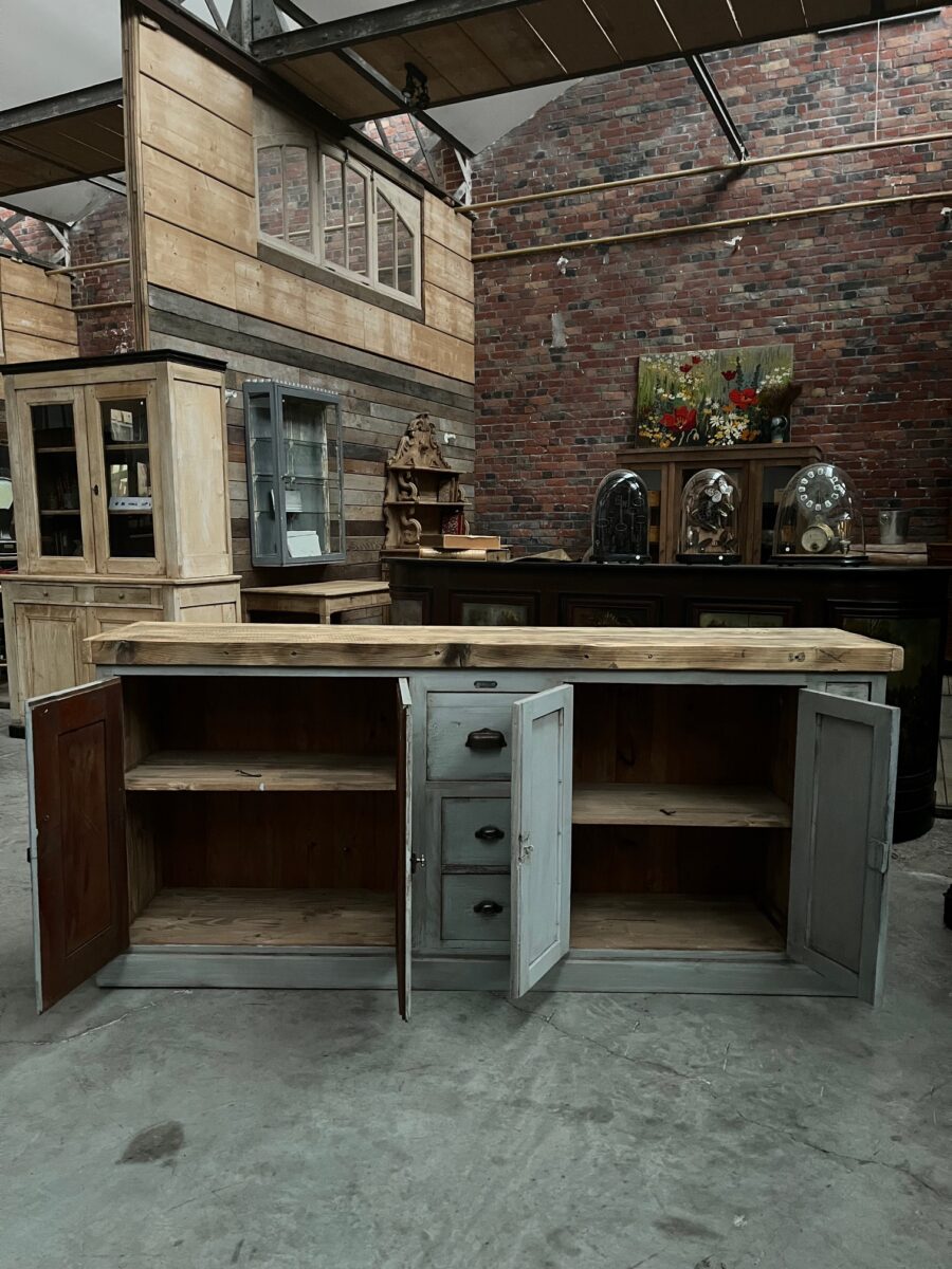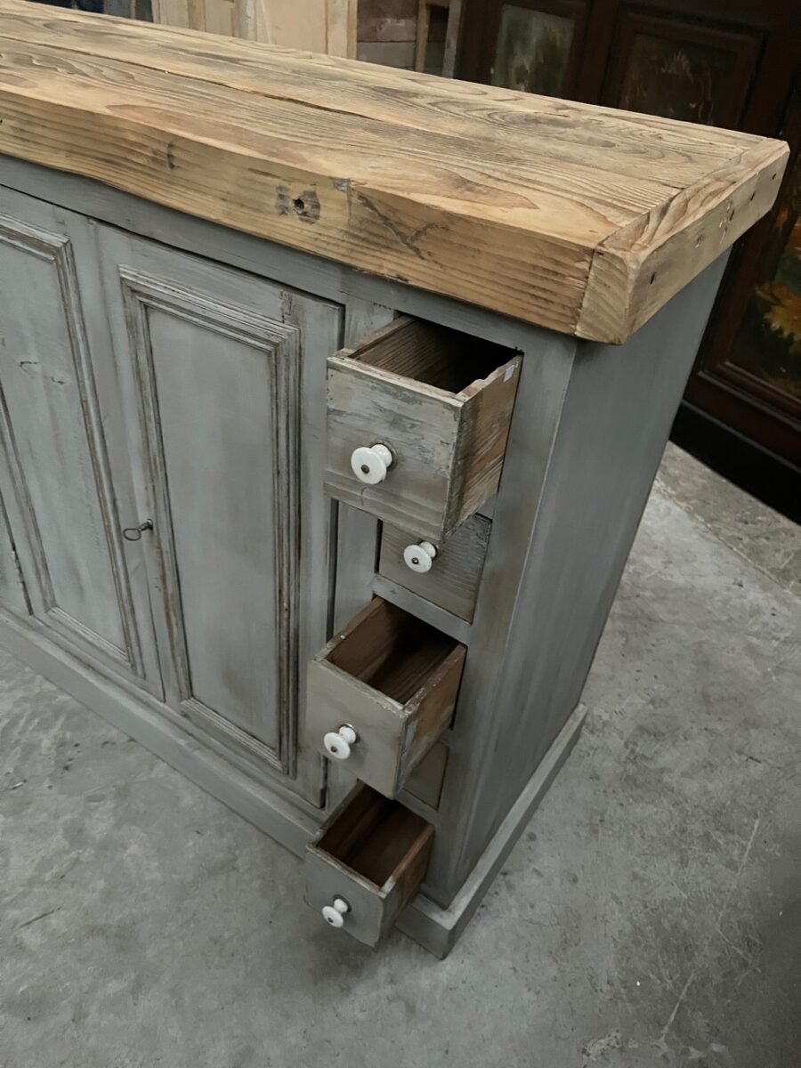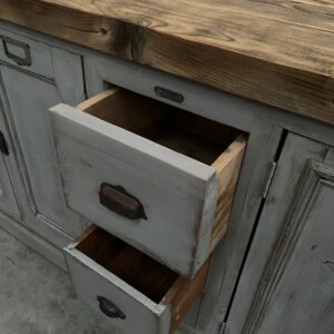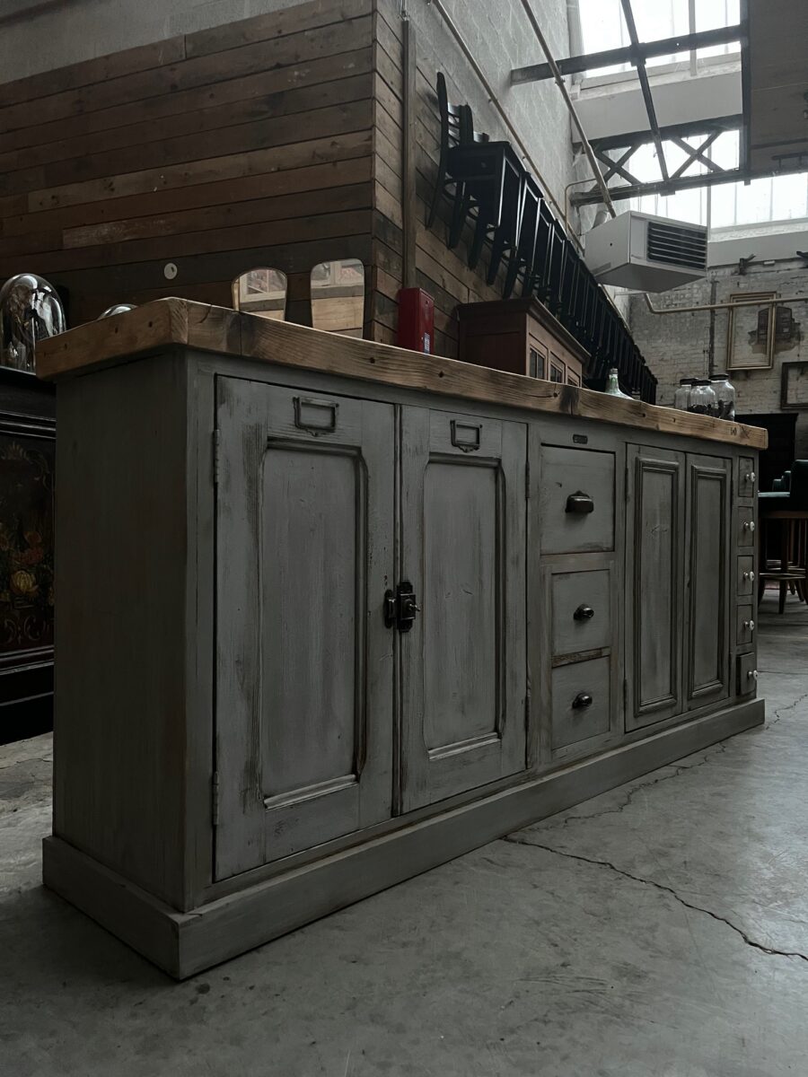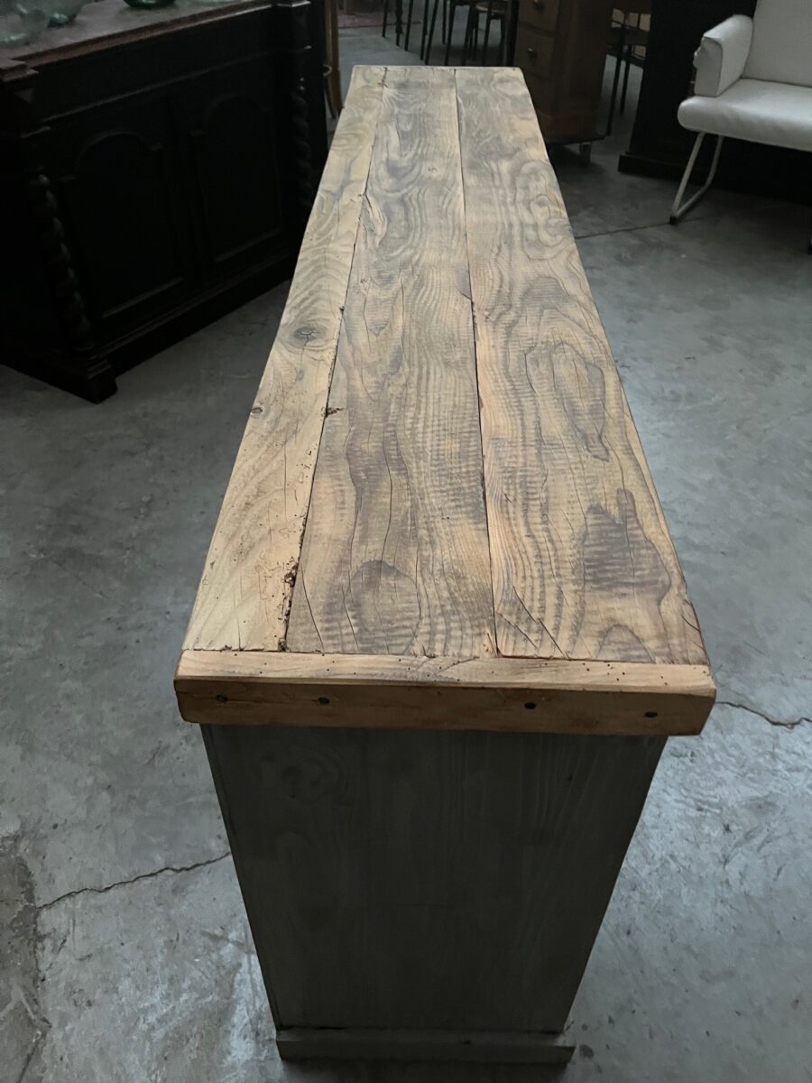 Grand meuble d’atelier, corps patiné gris et plateau en bois brut