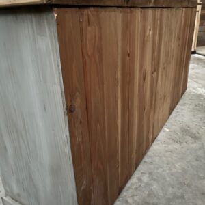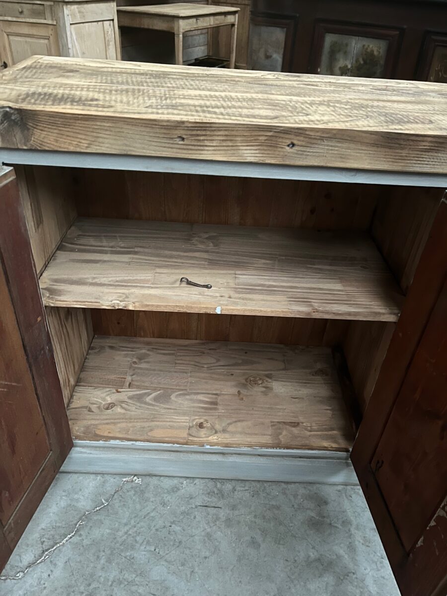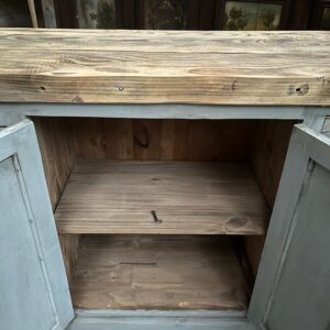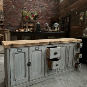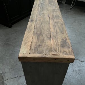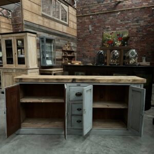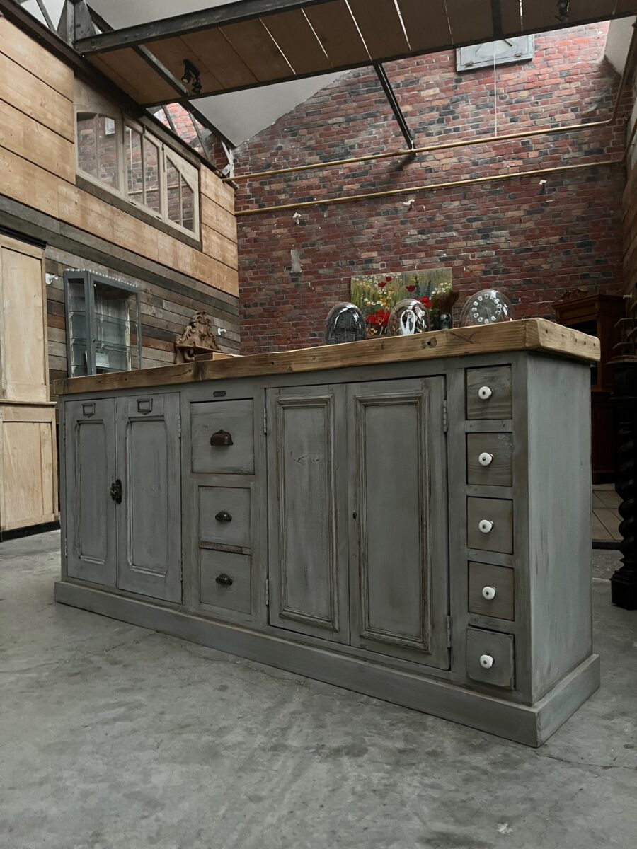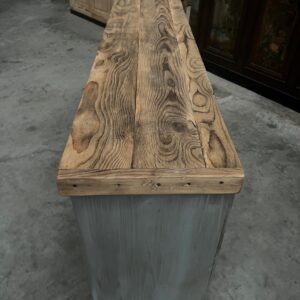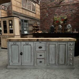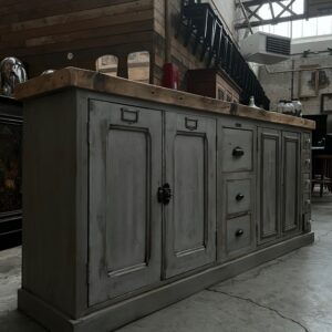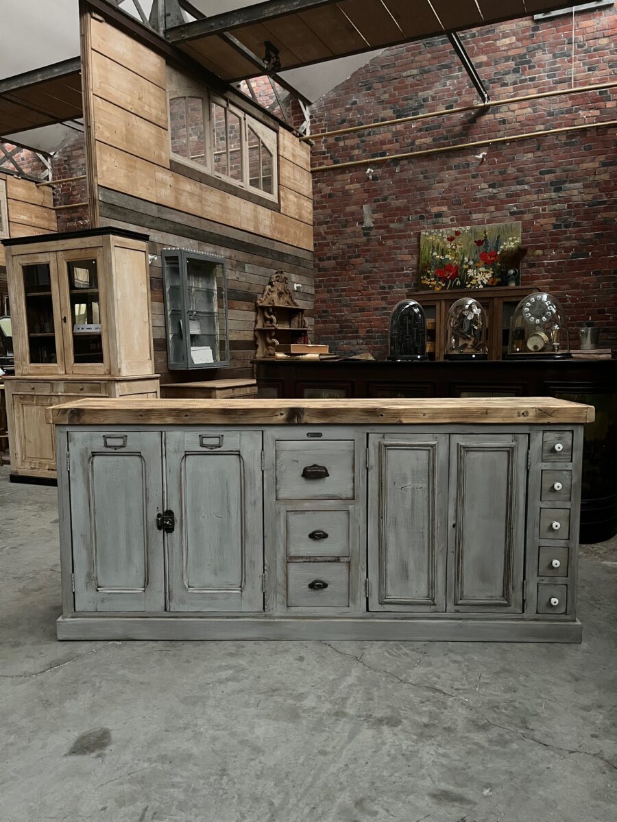 Grand meuble d’atelier, corps patiné gris et plateau en bois brut