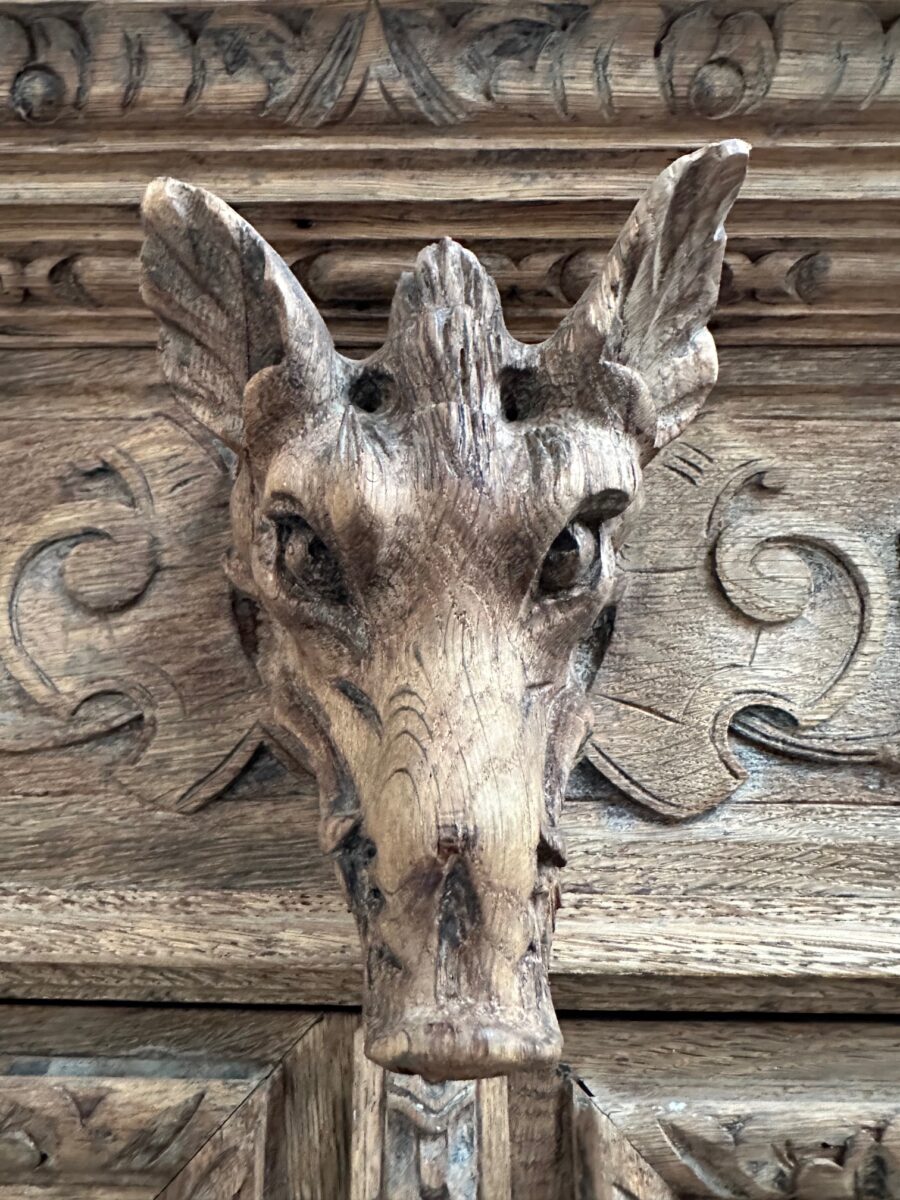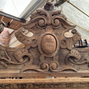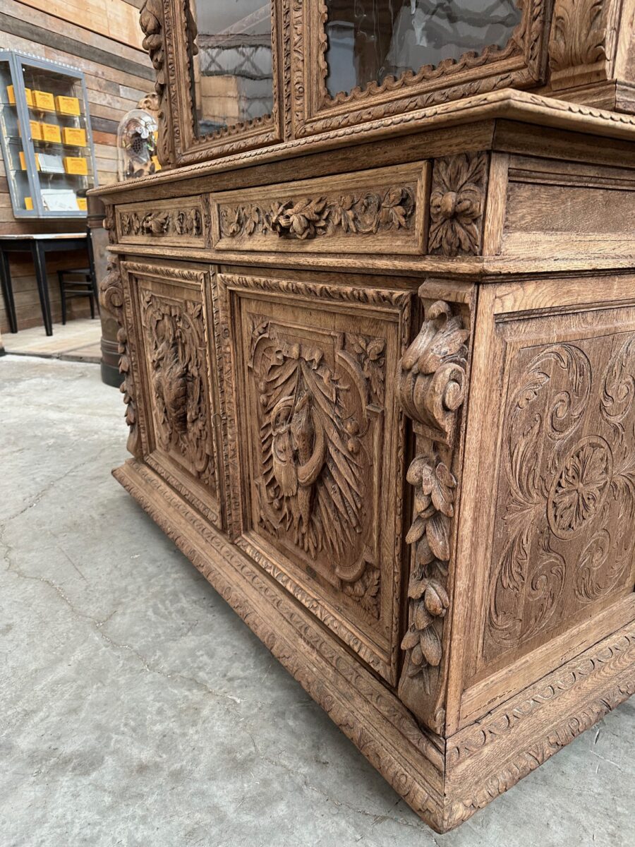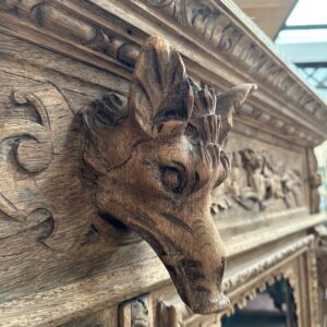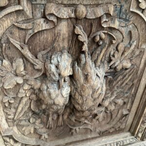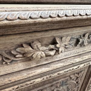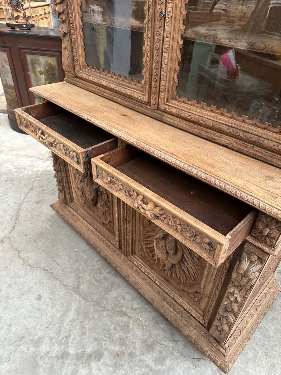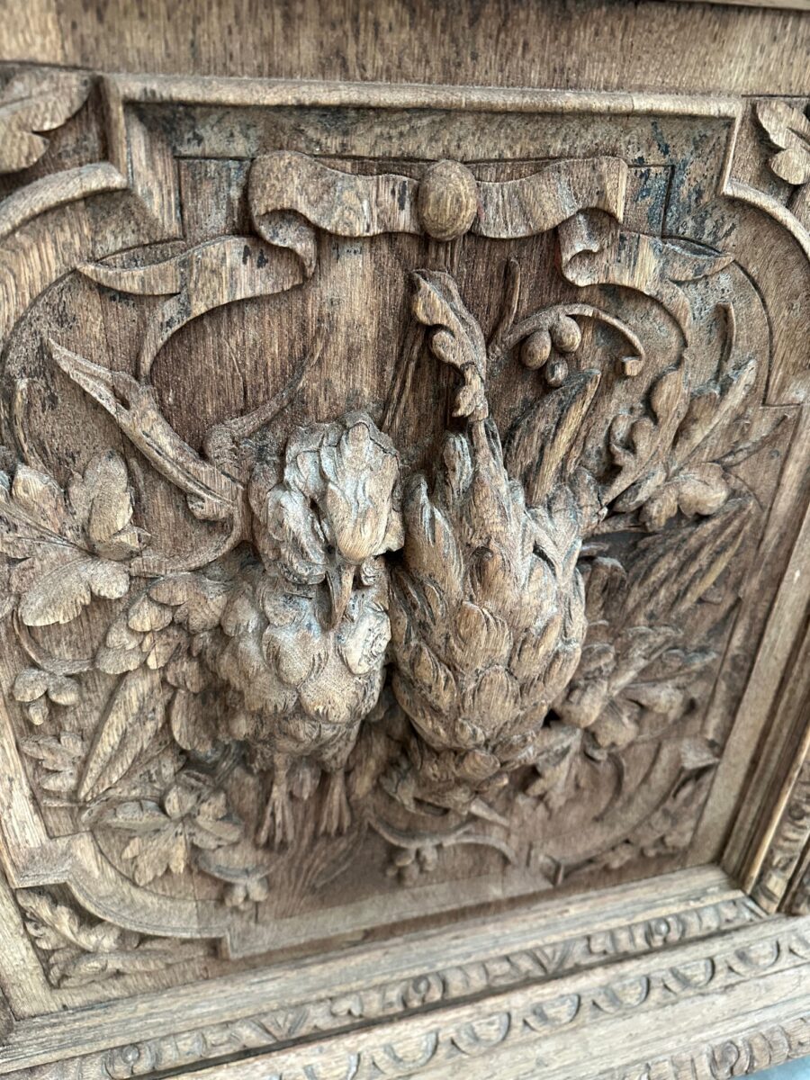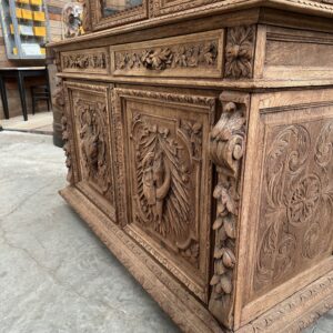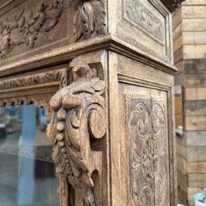 L’intégralité du meuble est en bois sculpté de différents motifs animaliers ou floraux.